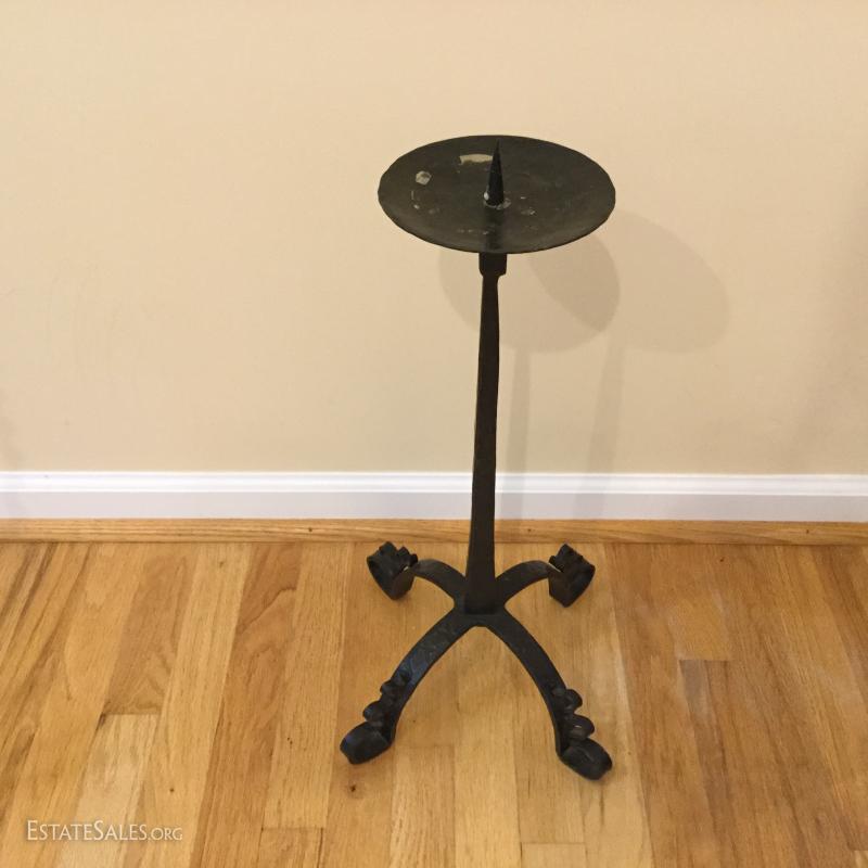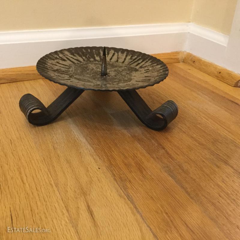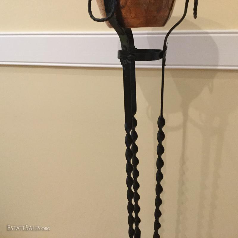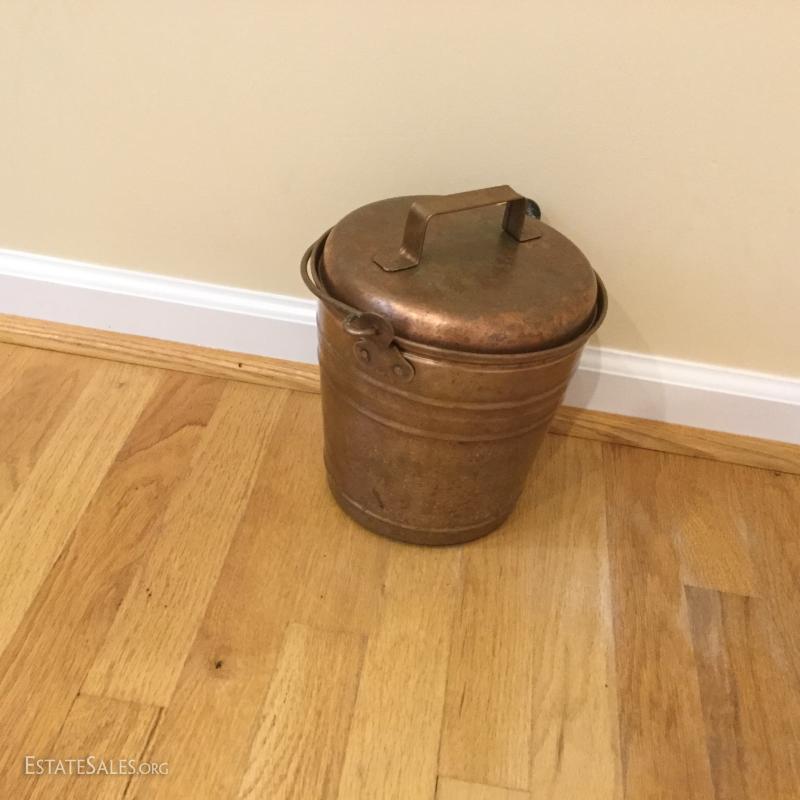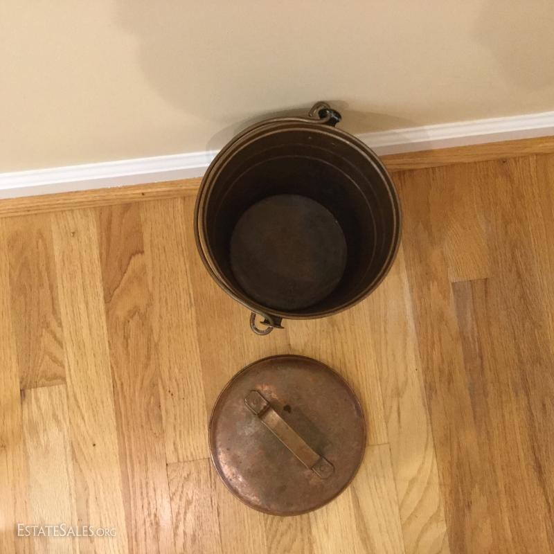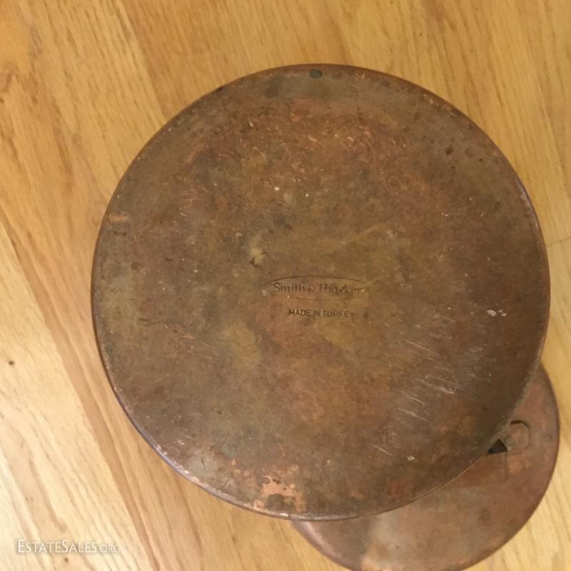 Several metal pieces. Includes candle holders in different heights. Largest is 44.5" high with Cooper bowl. Also includes Copper Smith and Hawkin bucket with lid, 20"h. See photos.