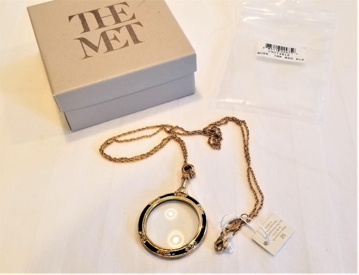New in box - Metropolitan Museum of Art Imperial Russian Magnifier on chain, based on an original by Faberge. Elegant and funtional. Chain is about 22" long and pendent is about 1.75" long. Tag still attached. Finished on both sides - A real beauty!