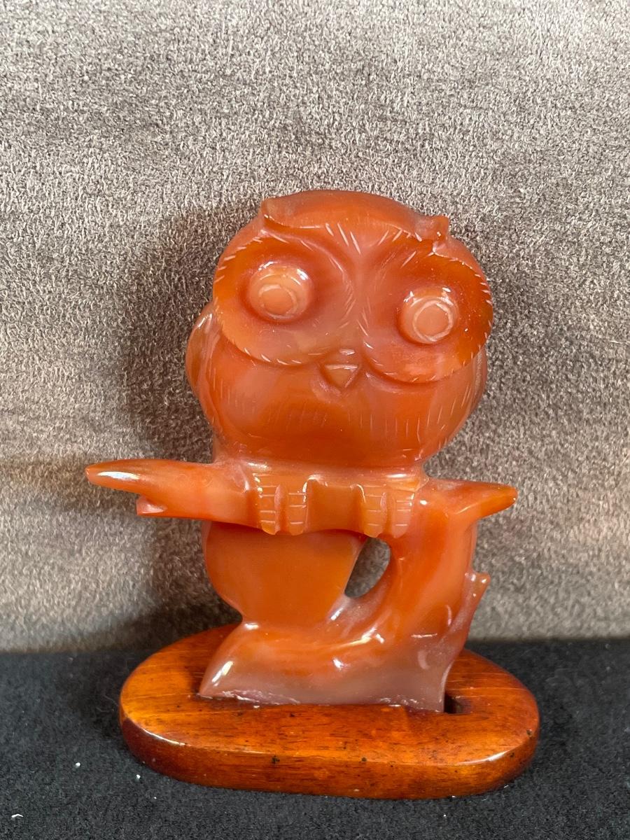Red Jade carved owl on wood stand