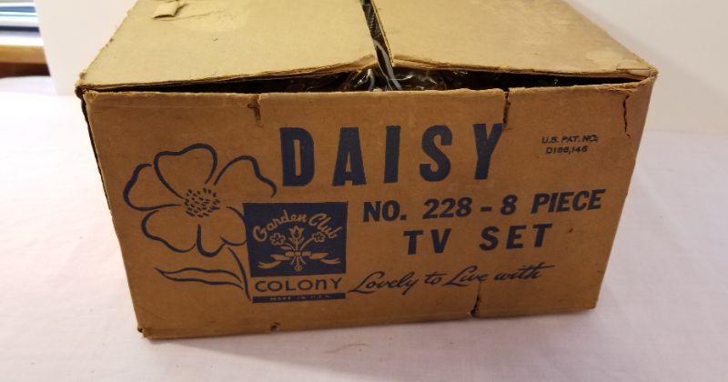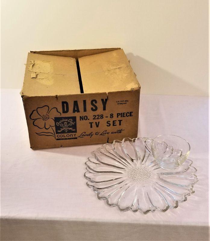 New in original box - even still has the excelsior - Colony Glass TV set in the "Daisy" pattern. Perfect for a meal in front of what was the new craze - Television. Set of four plates and cups. No issues. Plates are 10" across - 1950's - 1960's.