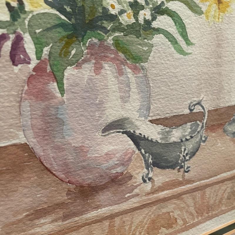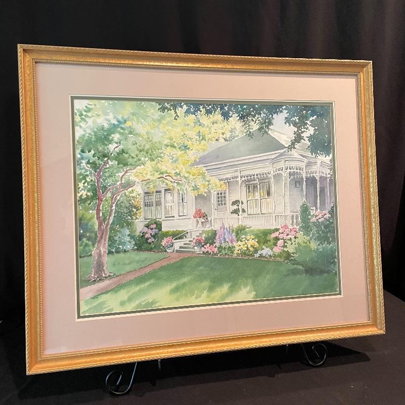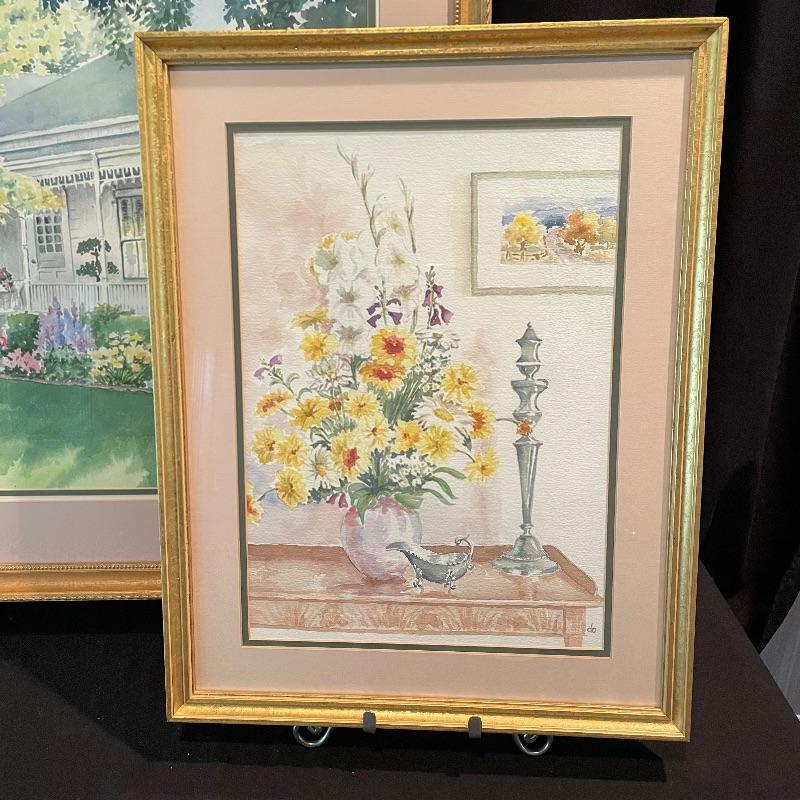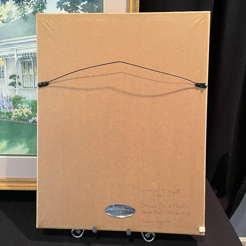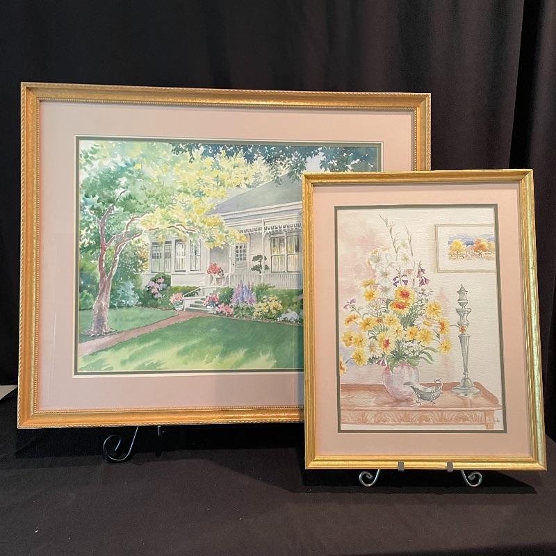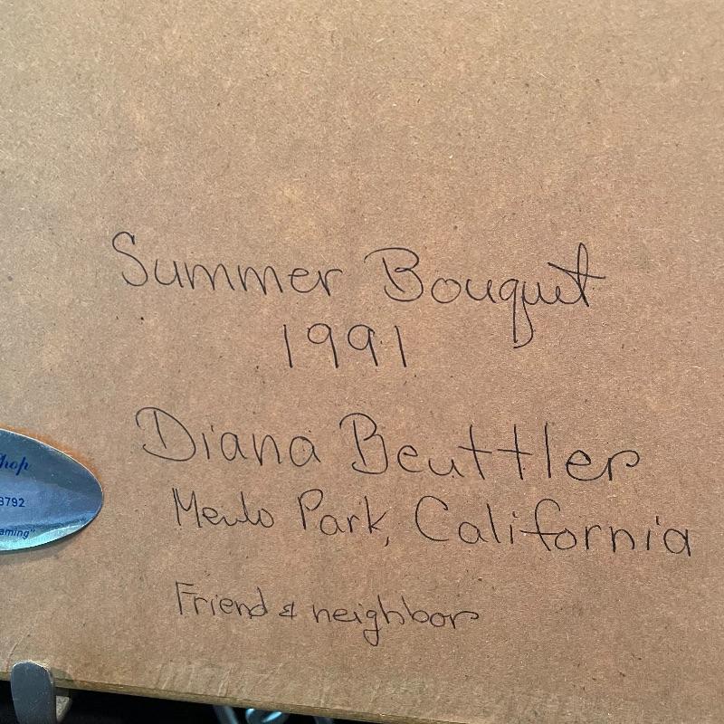 Two stunning still life art by Diana Beuttler. Backsides state she was a friend and neighbor of our beloved Mrs. Olson, who apparently has some very talented friends. The smaller art titled “Summer Bouquet” measures approximately 16” x 21” and the larger is about 31” x 25”. Both pieces could be watercolors and their frames are probably painted wood. See photos. Shipping available. Please call UPS with dimensions at 828-252-6930 for a shipping quote prior to bidding.