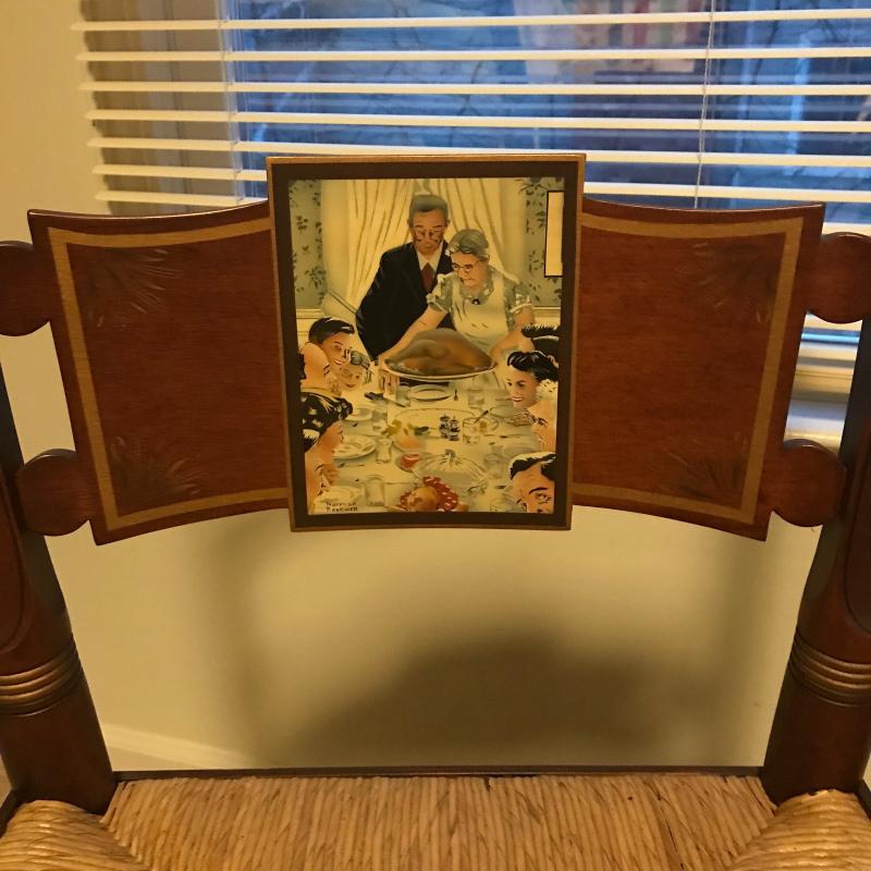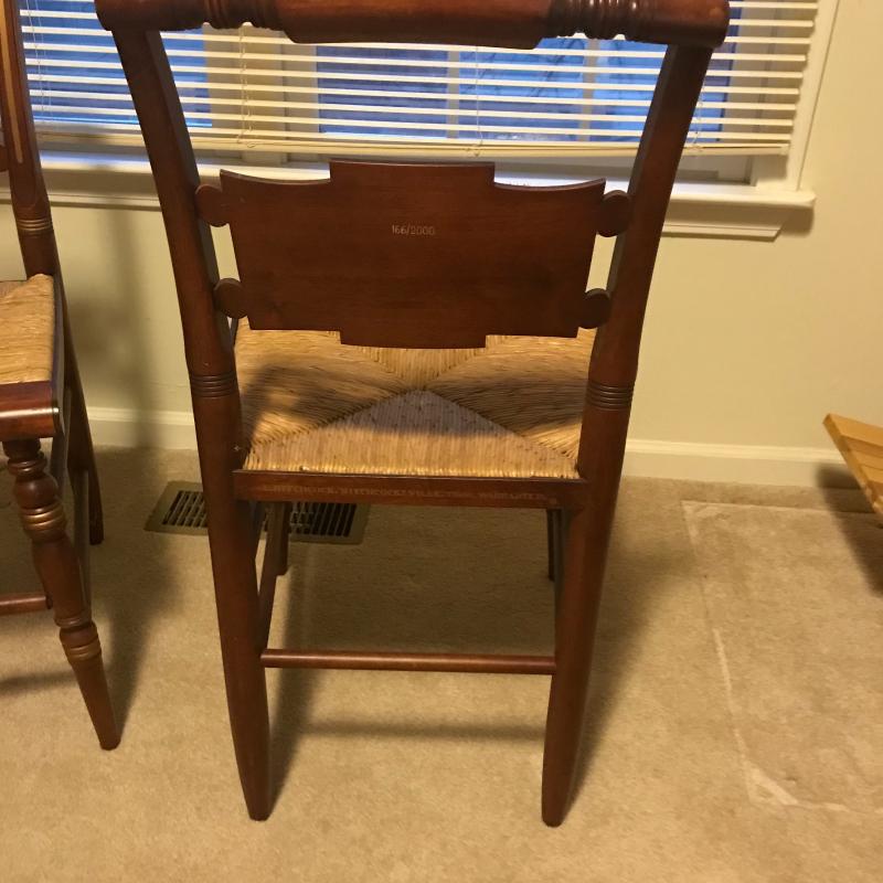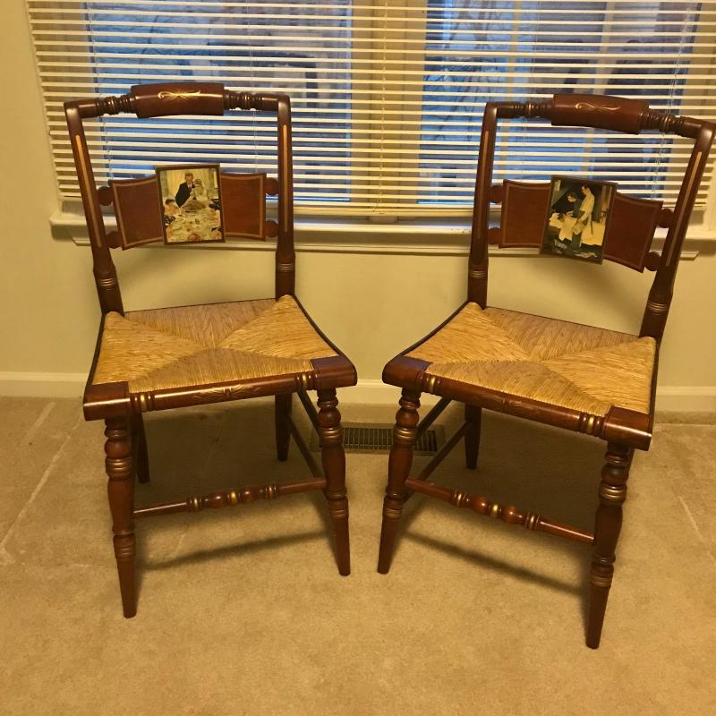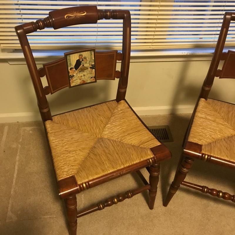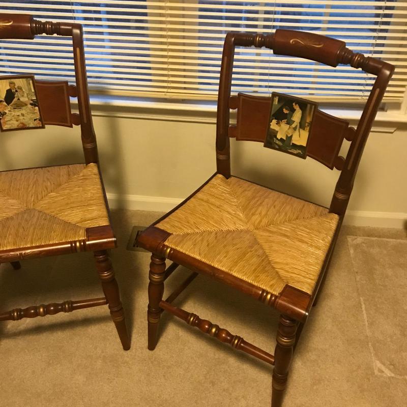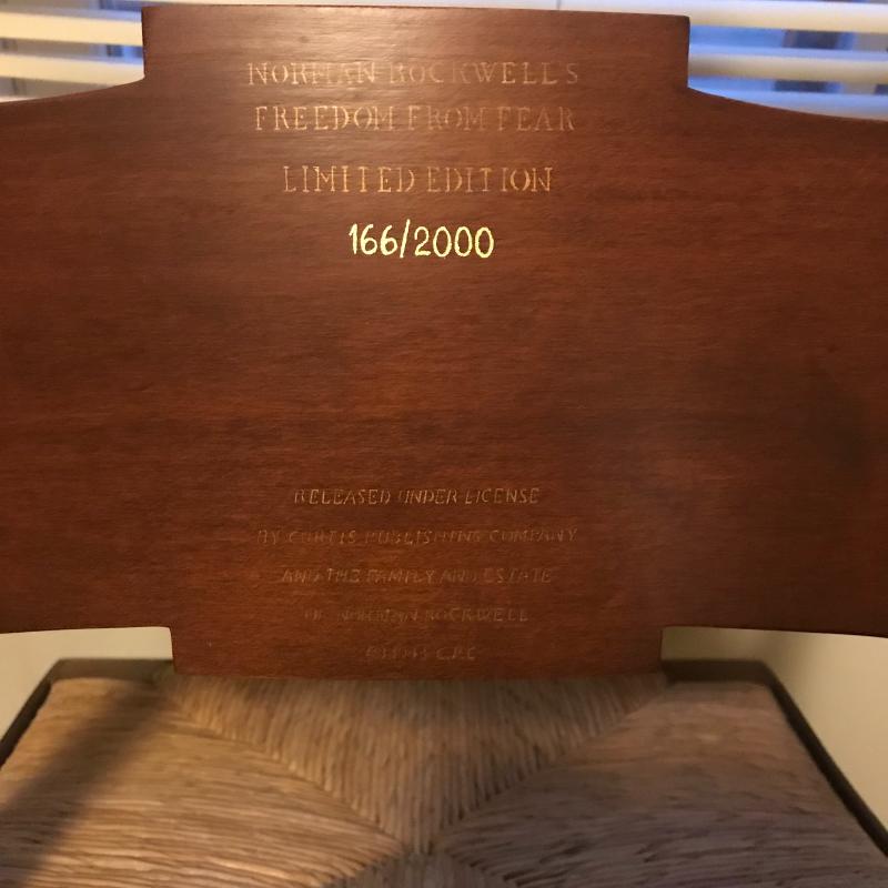 Both chairs in Excellent condition, Both marked on back with name and number. “Freedom From Want “ #240/2000 and “Freedom From Fear” #166/2000. Gorgeous detailed artwork on front. Each measures 17.5” x15.5” x34”. This lot is available for local pick up only in Asheville, NC