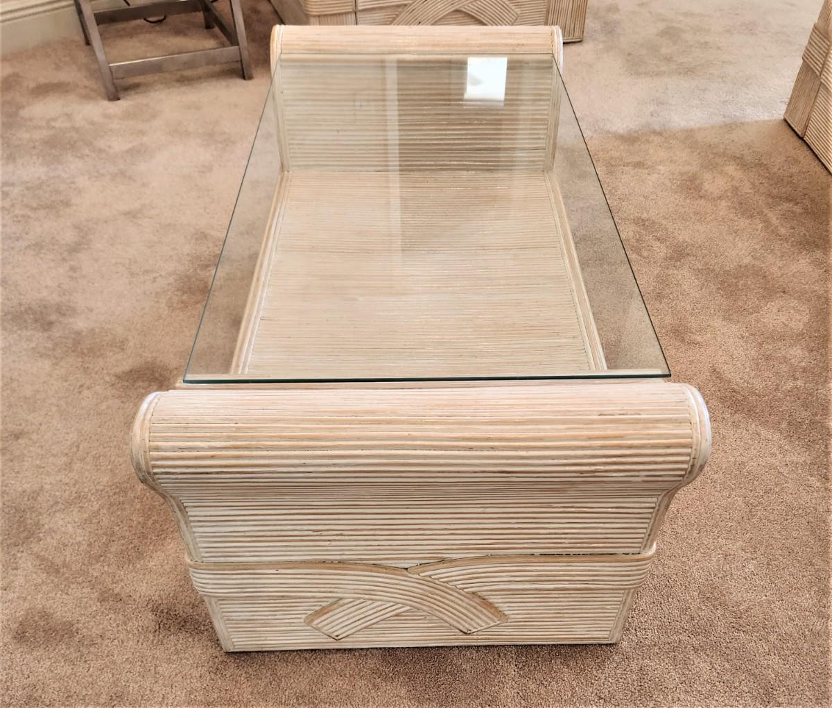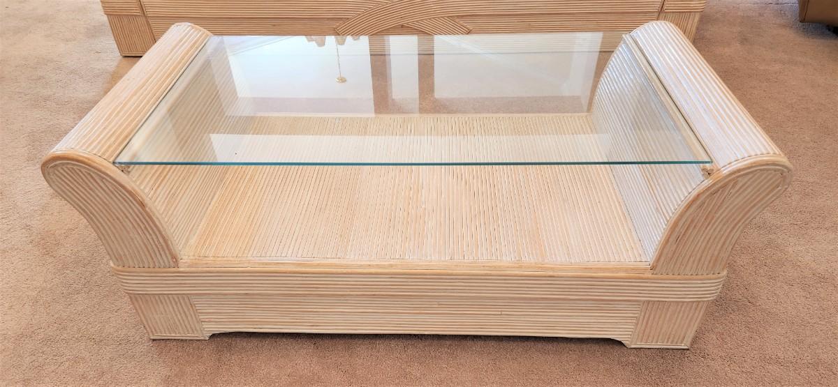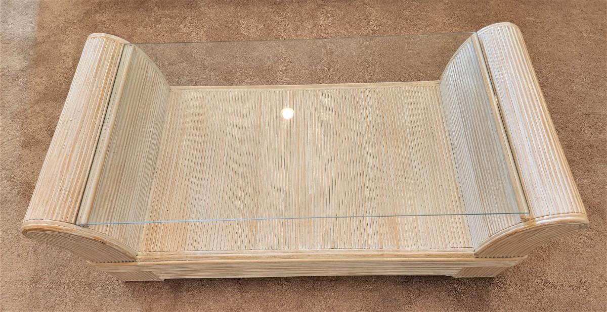 Late 1970's PROIMI glass-topped coffee table - matches sofa in Lot #45. Glass lifts off for easy transport/cleaning. 41" across, 20" wide, 15.5" tall. Good vintage condition.
