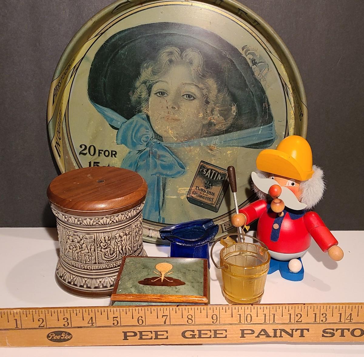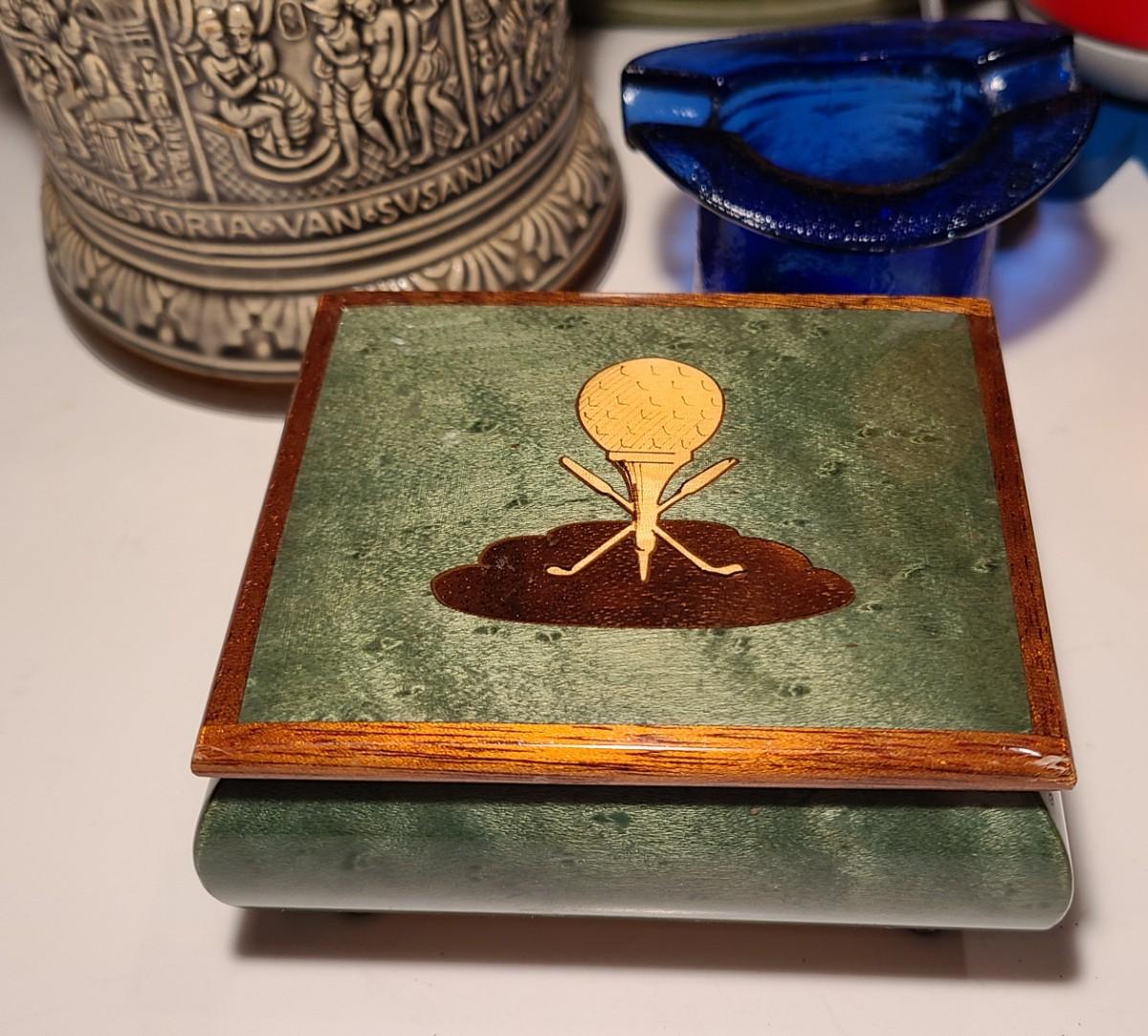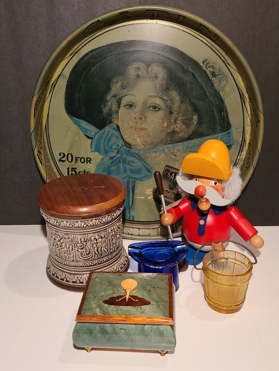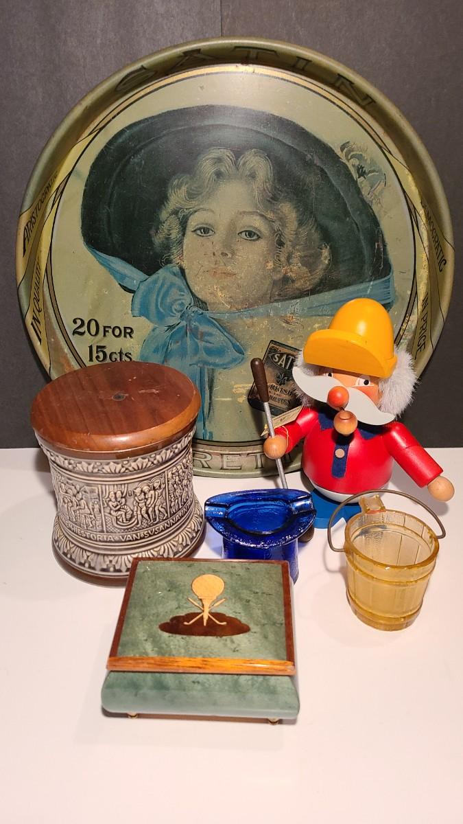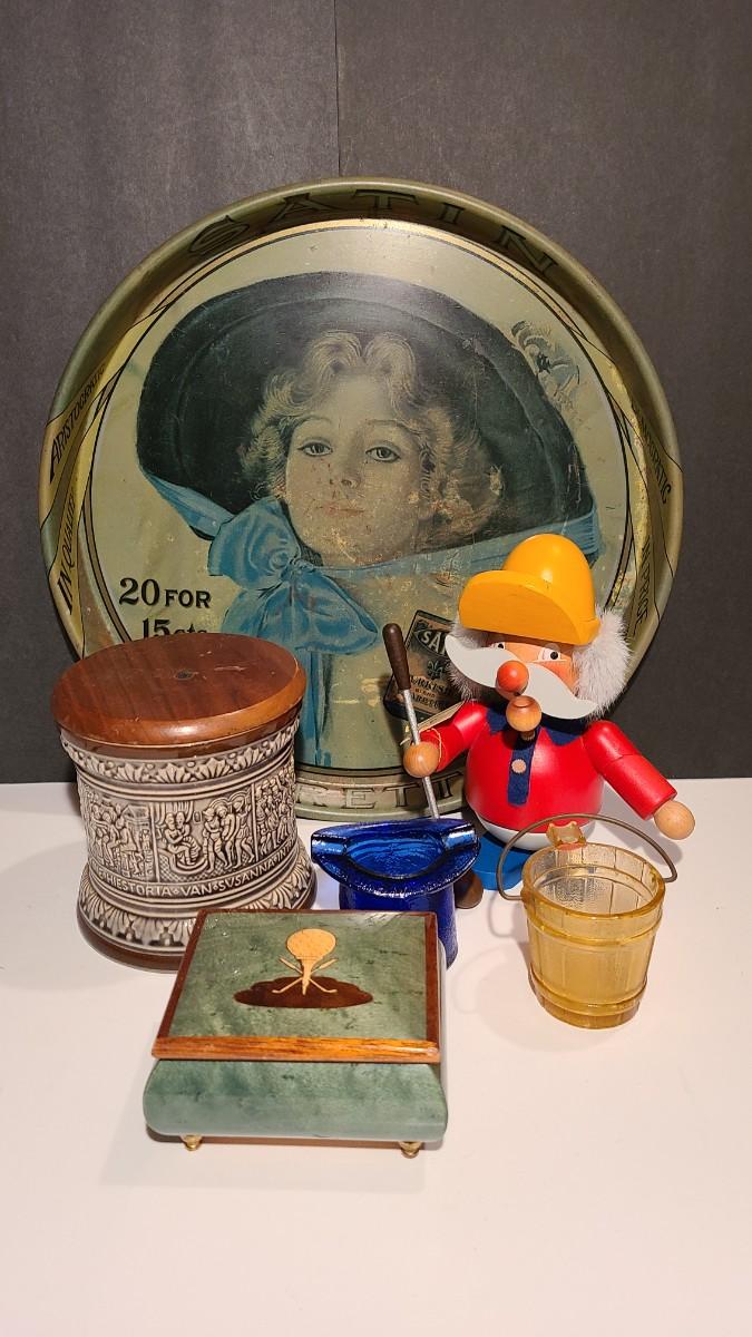 Nice lot of smoking collectibles: Satin Cigarette metal tray, Remi Marzi antique tobacco jar/humidor (not sure how it works), Christian Ulbrich Wood Pipe Smoking golfer, colorful glass ashtrays, and Reuge Golf Music Box (works). Please see all pictures for content of the lot, condition of the lot, and measurements if taken. Pictures are the best representation of the items listed and items are untested unless indicated in description. Thank you for looking and have fun bidding!