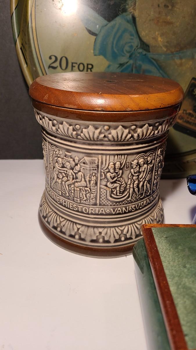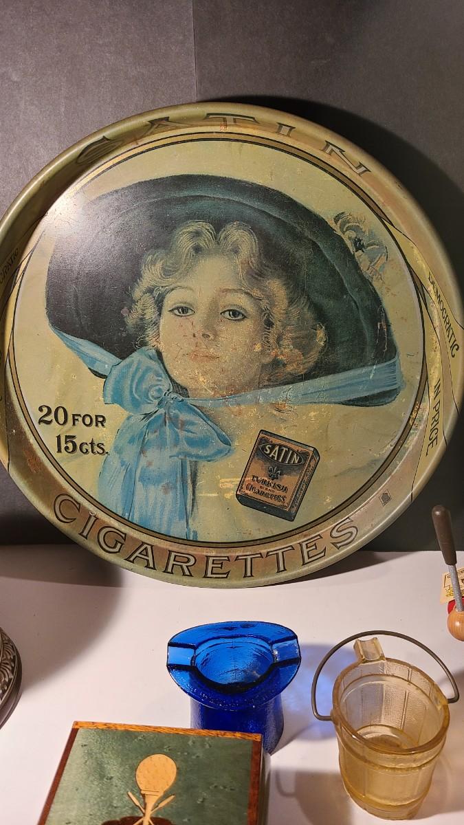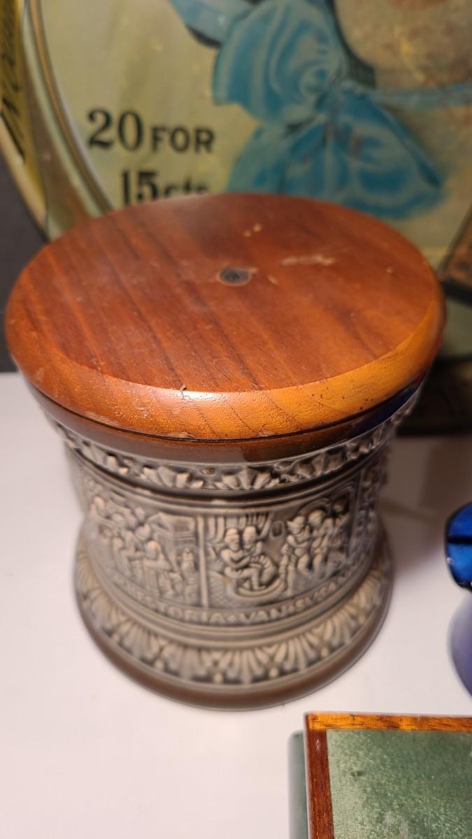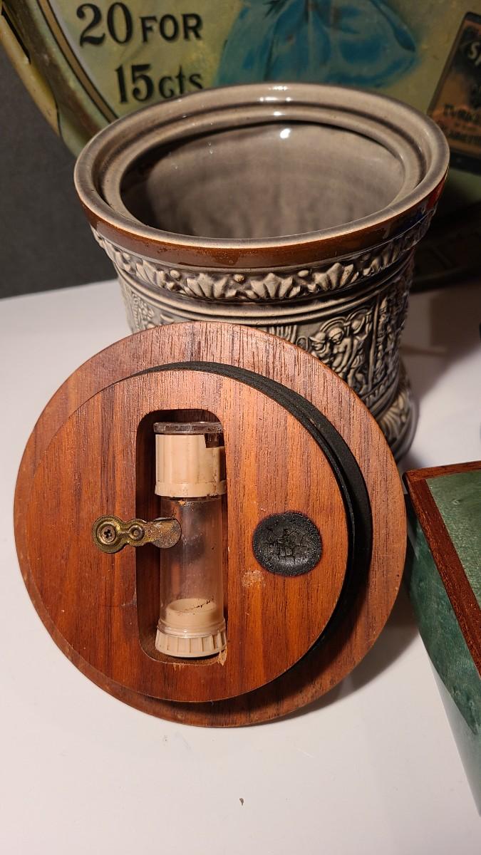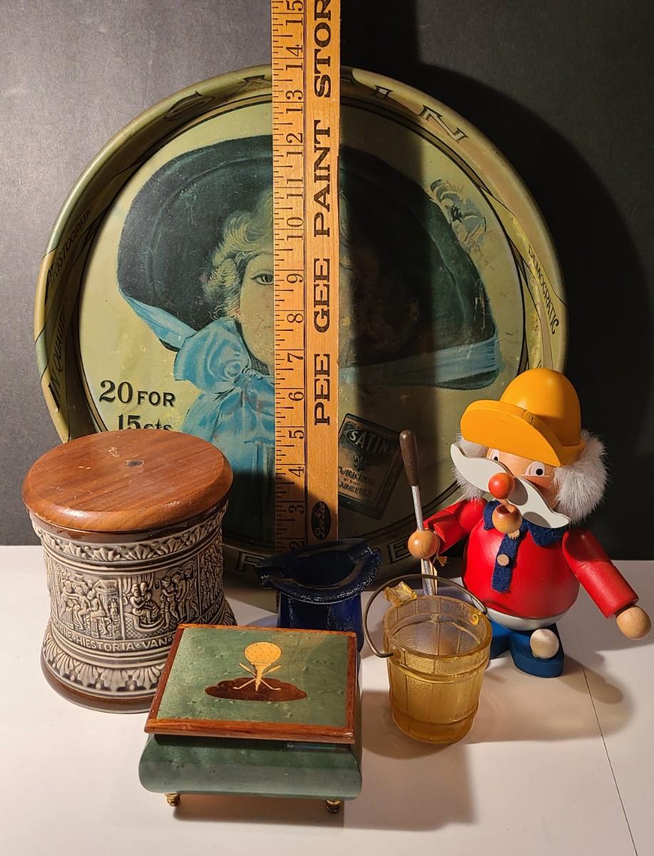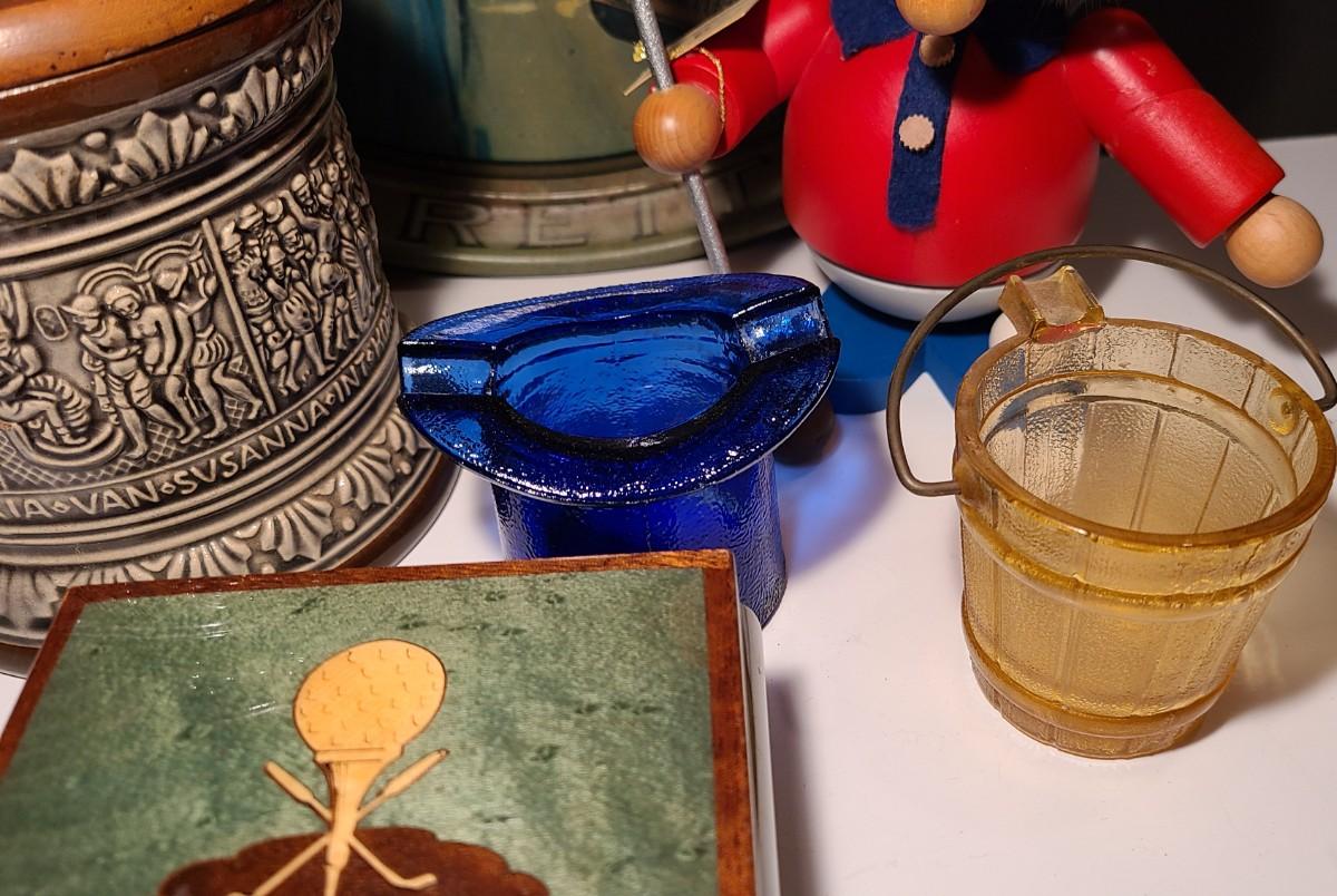 Nice lot of smoking collectibles: Satin Cigarette metal tray, Remi Marzi antique tobacco jar/humidor (not sure how it works), Christian Ulbrich Wood Pipe Smoking golfer, colorful glass ashtrays, and Reuge Golf Music Box (works). Please see all pictures for content of the lot, condition of the lot, and measurements if taken. Pictures are the best representation of the items listed and items are untested unless indicated in description. Thank you for looking and have fun bidding!
