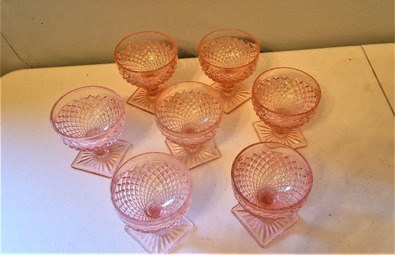 Set of 7 1930's Depression Glass sherbets in the Miss America pattern. Each stands 3.5" tall. Good condition.