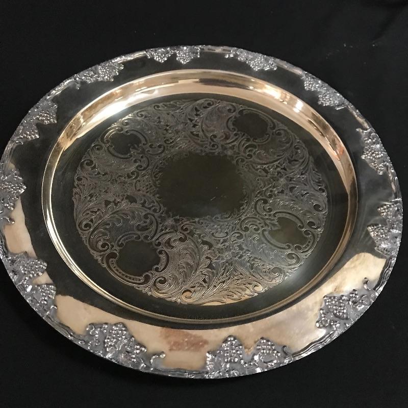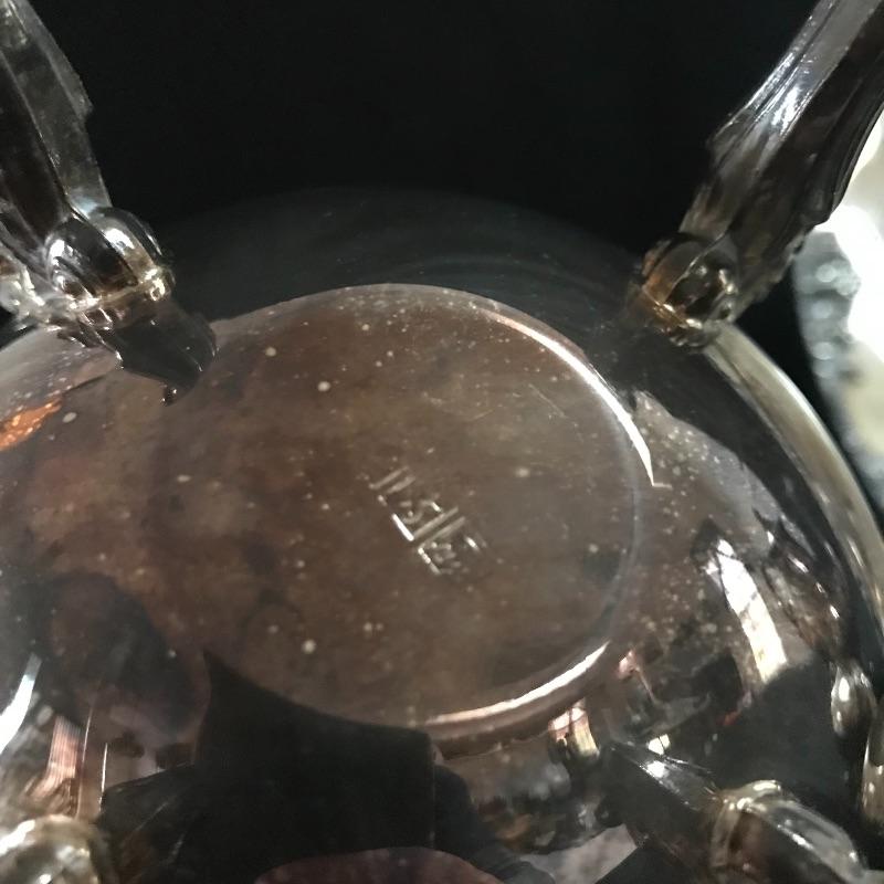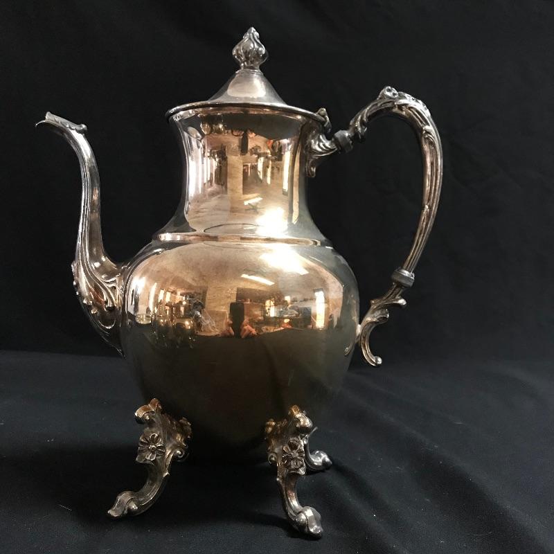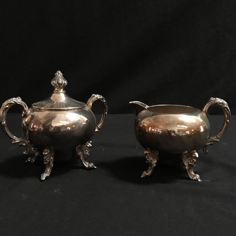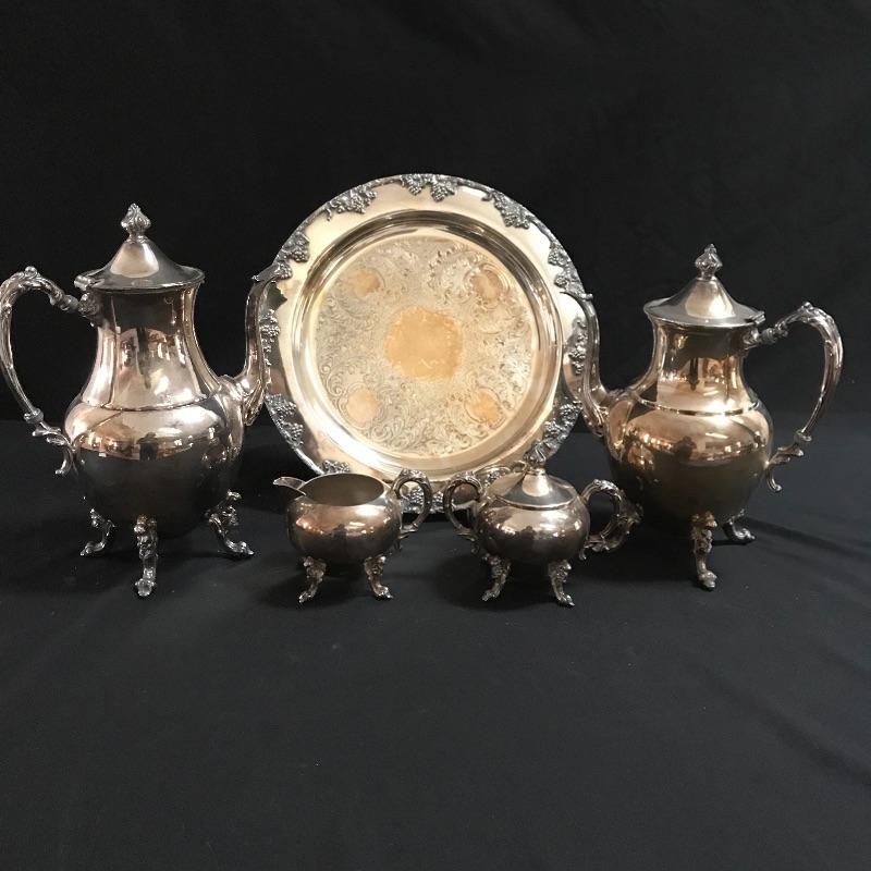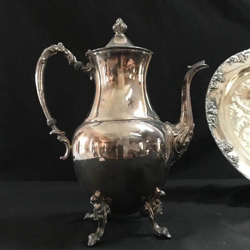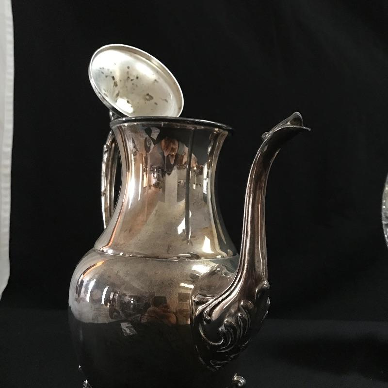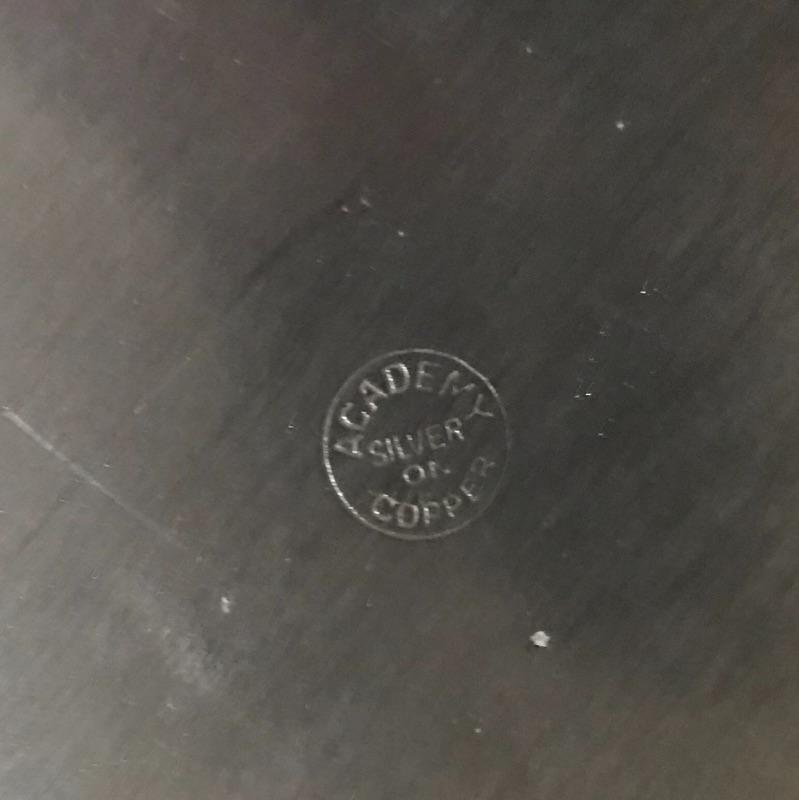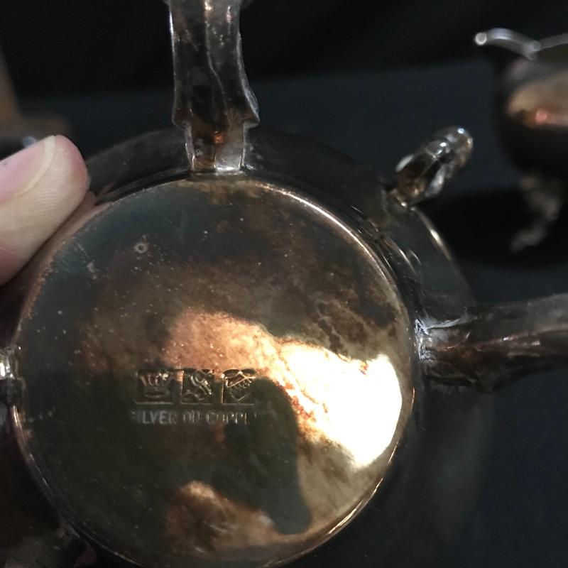 Beautiful and elegant, teapots 11" and 12" tall. All markings appear to say “silver on copper” and the plate is also stamped "Academy." Set is complete with matching sugar/top and cream set. Shipping available.