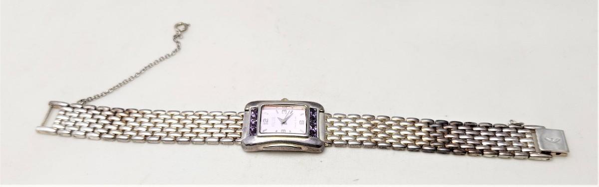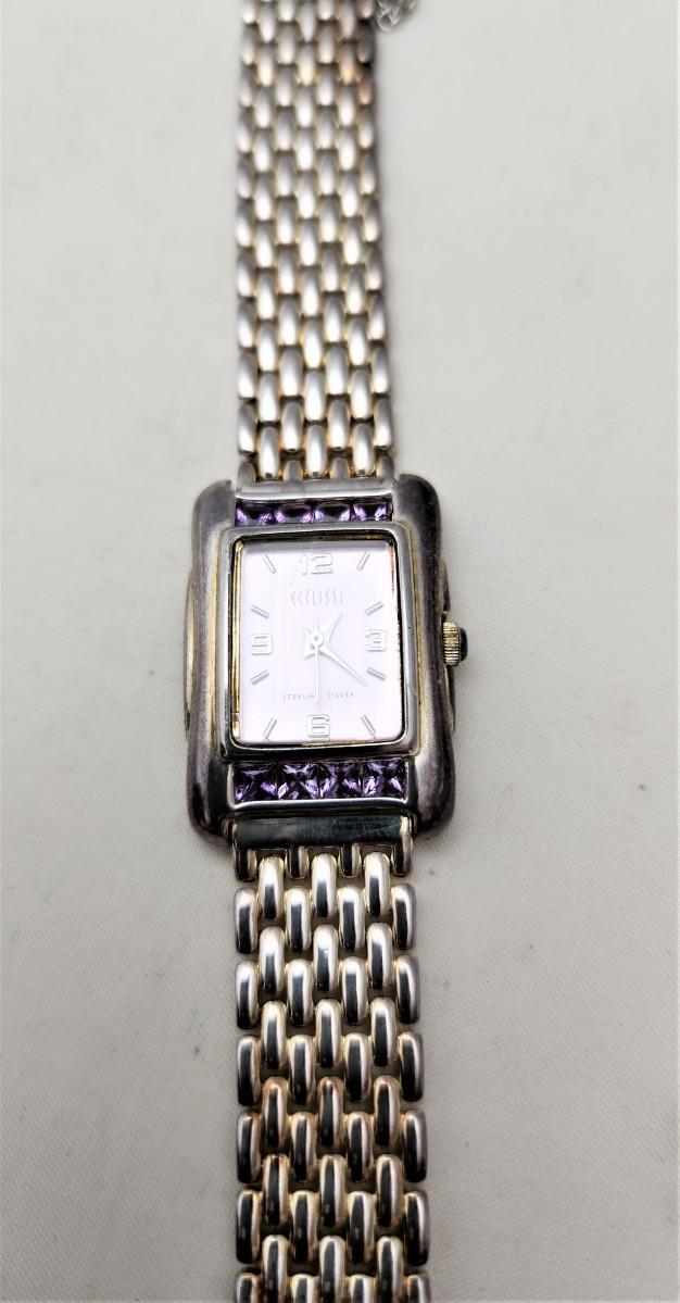 This quartz Ecclissi is in good working order with a fresh battery. Sterling silver case AND band (marked). Safety chain. Decorated with "amethyst" square stones. 7.5" long. Band has some weight to it. Opening bid probably less than the scrap value for the silver. I would be willing to ship this item - you pay priority shipping.