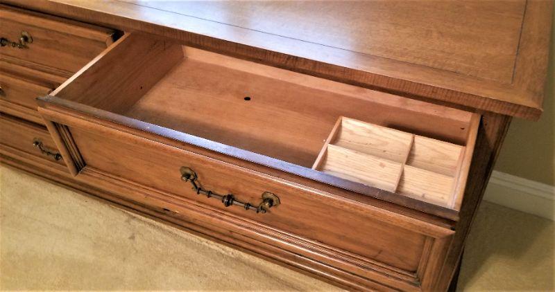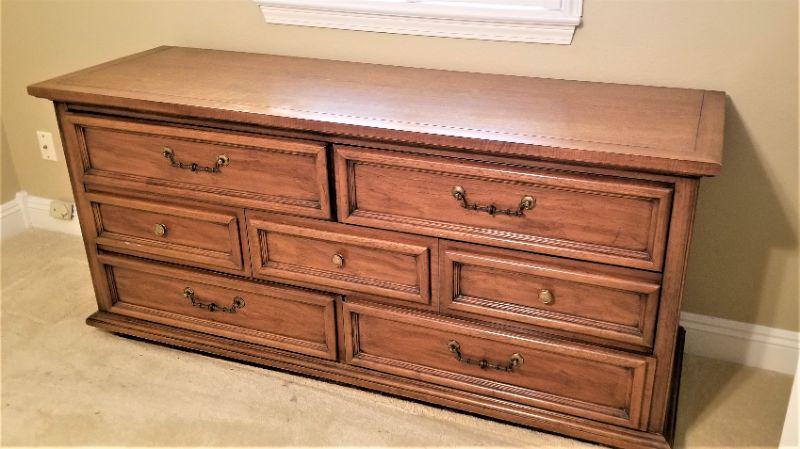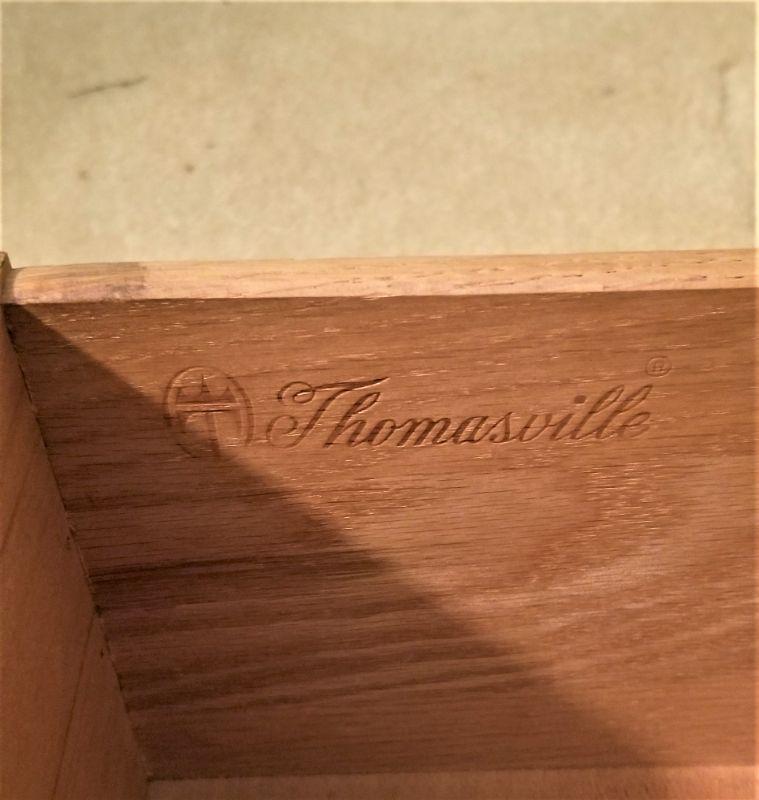 Nice heavy Thomasville dresser - no mirror. Lots of storage space here. 21" deep, 66" across, 30" tall. Good used condition. Has a small bit of wear on top.