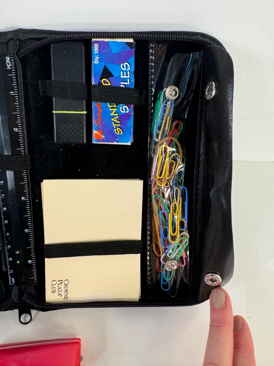 Zippered International Bureau of Aviation travel kit of office supplies that includes paper clips, sticky notes, 7” ruler, mini scissors, tape and dispenser, letter opener and refills, mini tape measurer, eraser, mini stapler and staples.