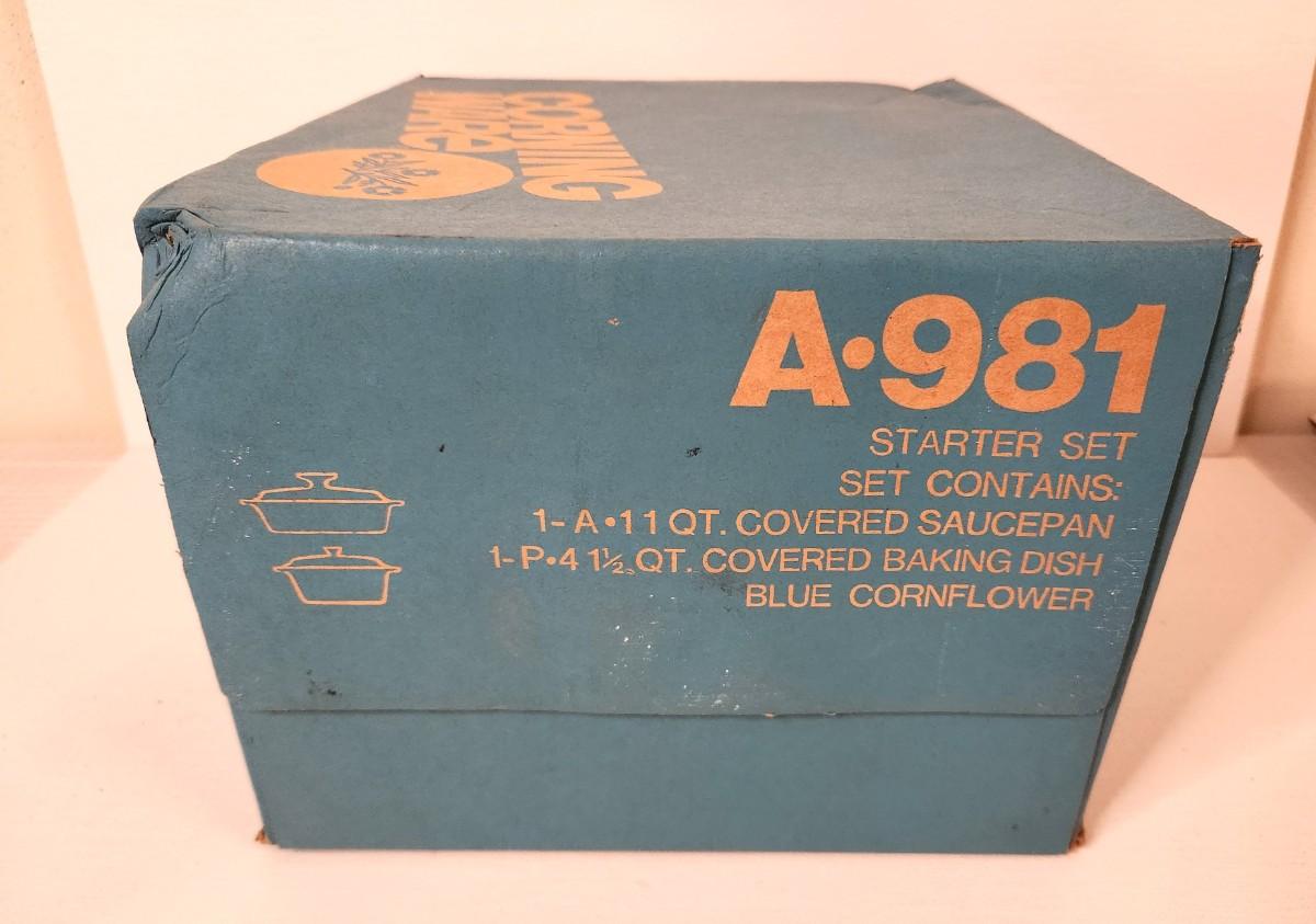 New in Box - a wedding present never used! Vintage Corning Ware Starter Set - Cornflower pattern - you get a 1 quart covered saucepan and a 4.5 quart covered baking dish.