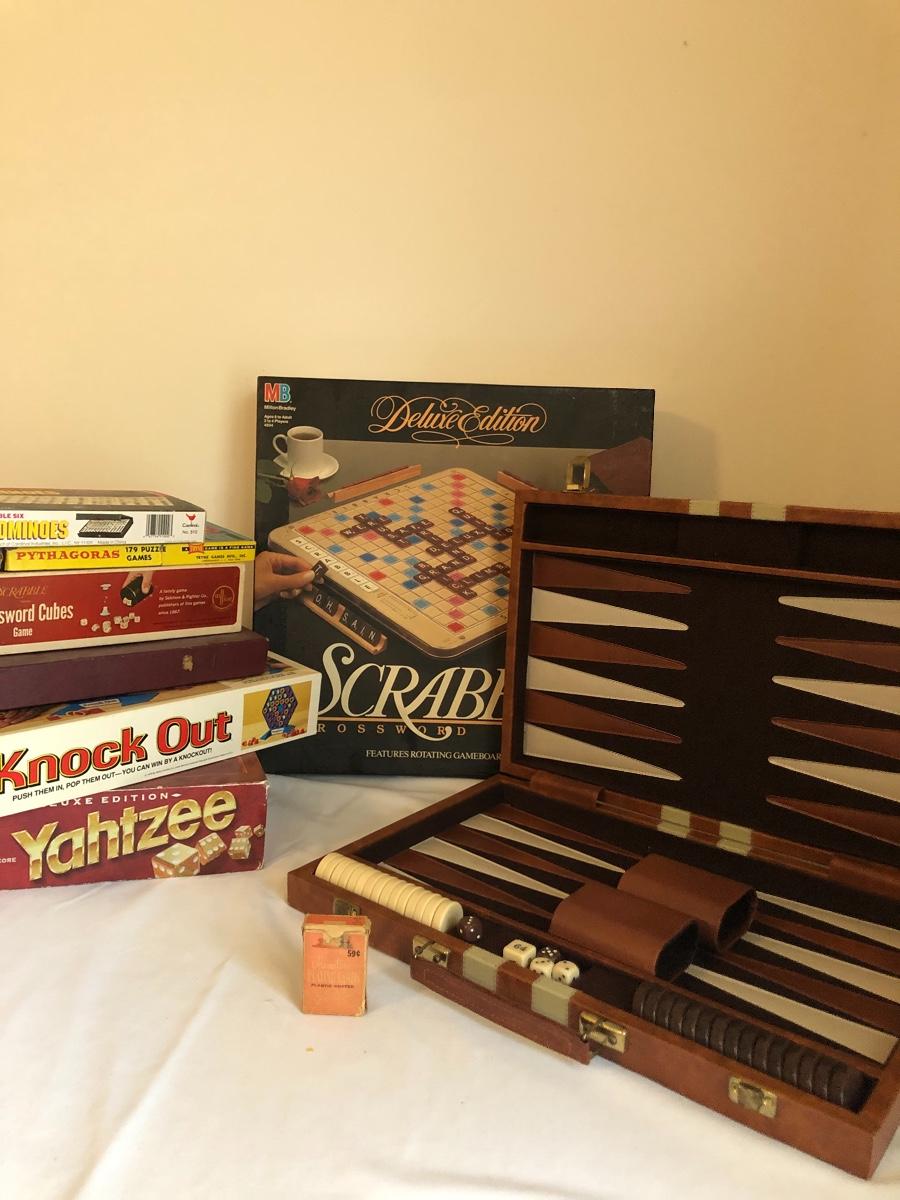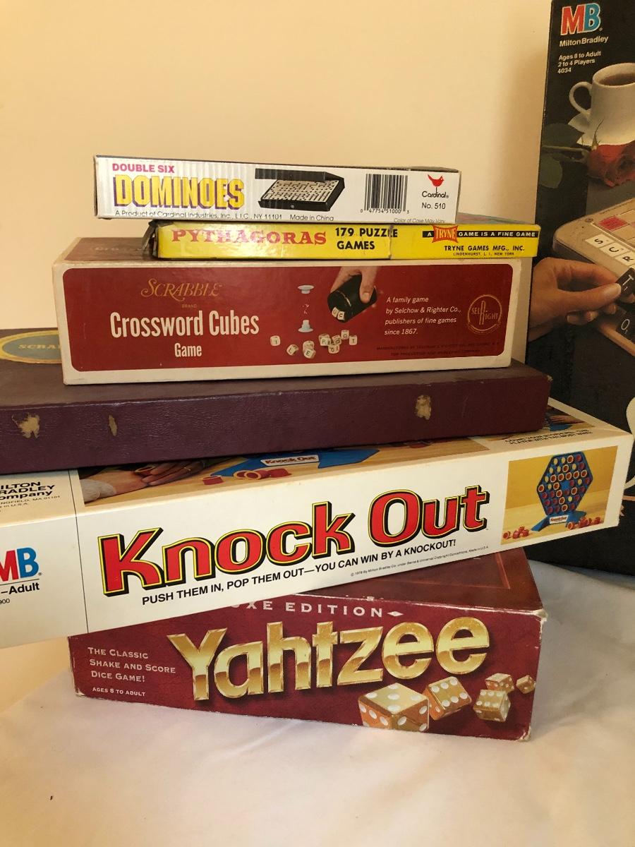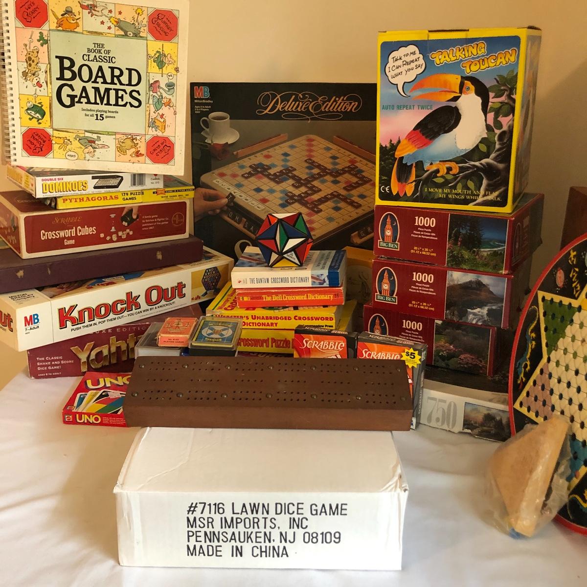 We have a great assortment of both vintage and newer games for you here. Lots of puzzles, playing cards, crossword puzzle dictionaries and much more in the more modern items that even includes a talking Toucan (not tested as batteries are dead). The vintage items includes a beautifully preserved traveling Backgammon briefcase which measures 12” x 18” x 2.5”, Dominoes, Scrabble, Chinese Checkers & more.