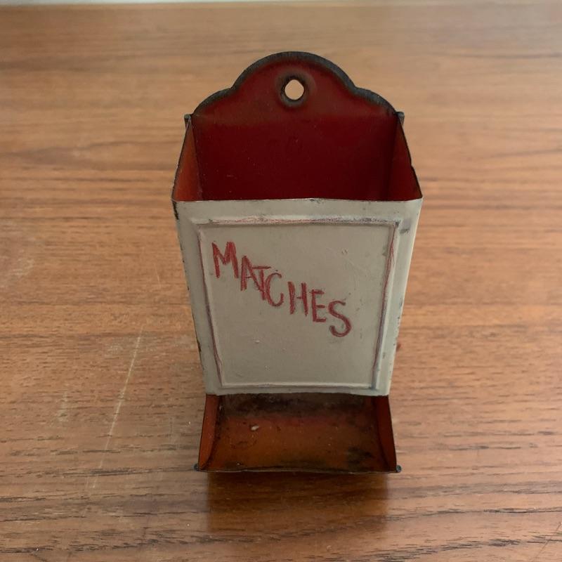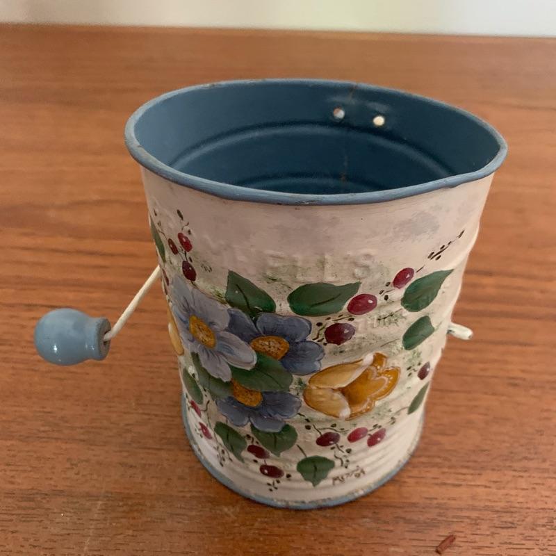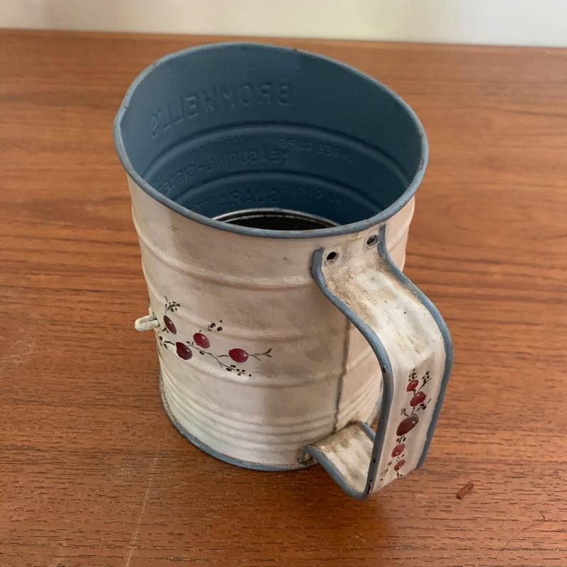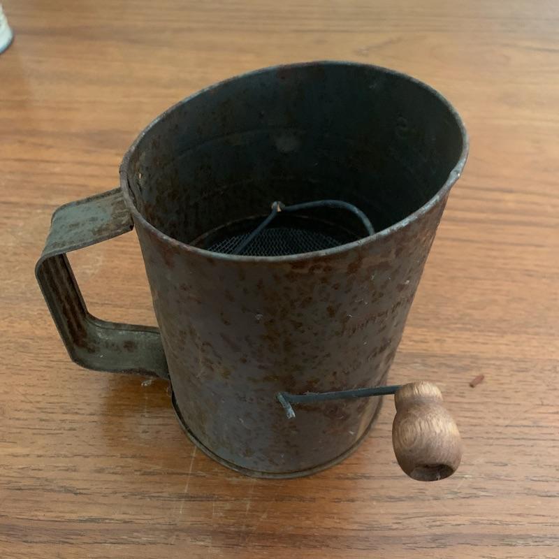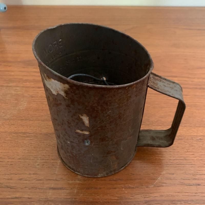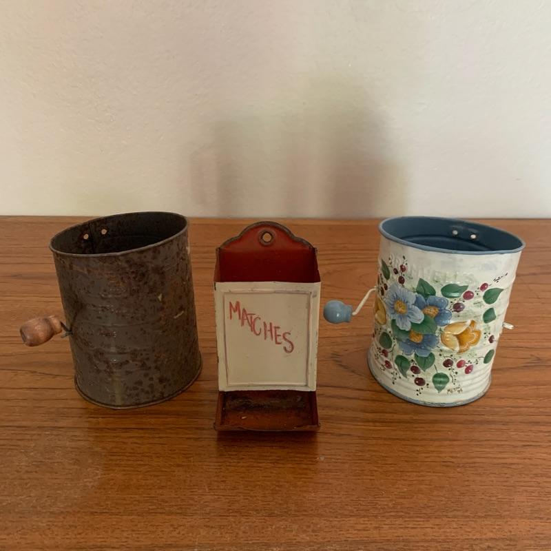One rusty, primitive Bromwell sifter with wooden knob handle, one primitive hand painted and artist signed Bromwell sifter and one metal match holder. All pieces are primitive /rustic with rust and wear.