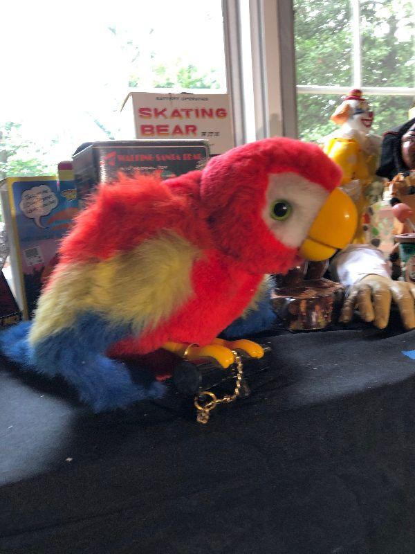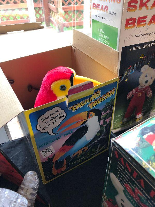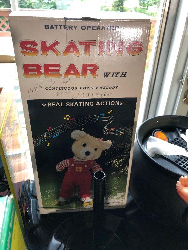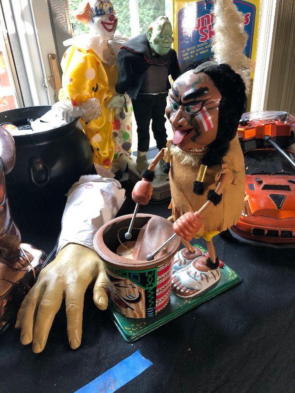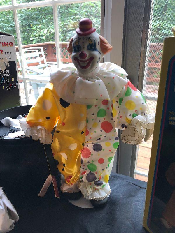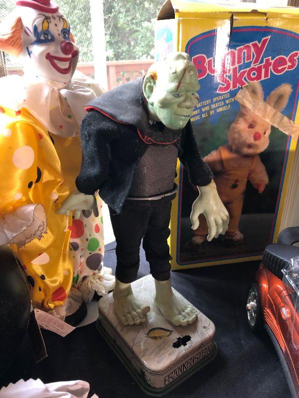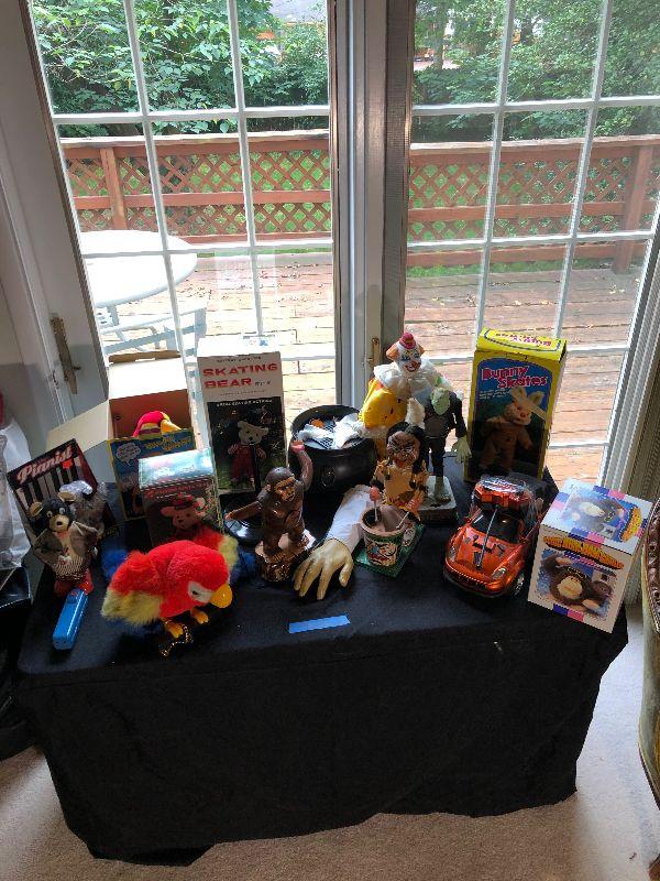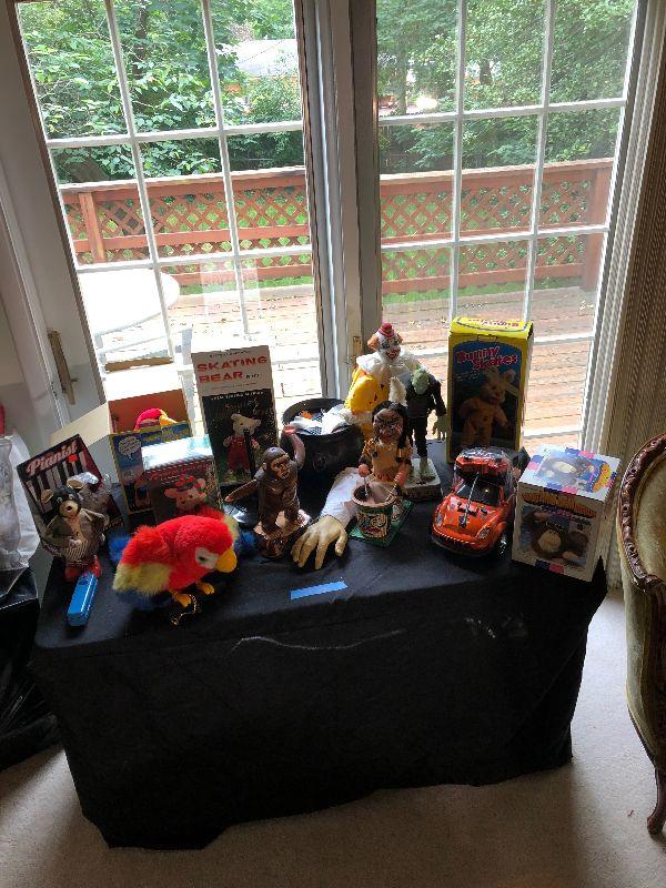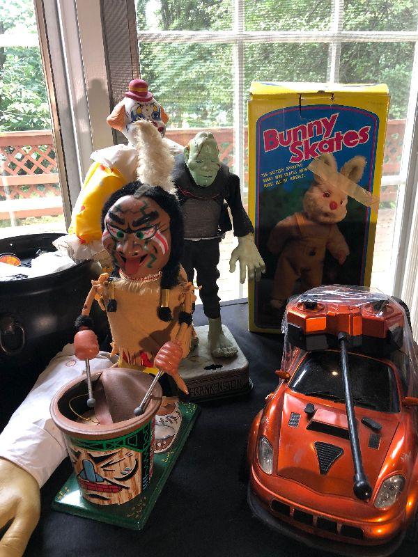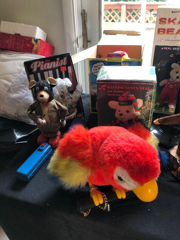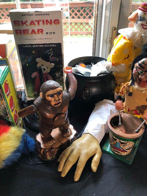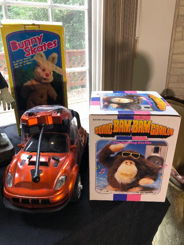 Collection of vintage toys including a bear, clown, remote control car, monkey, skating bear and much more.