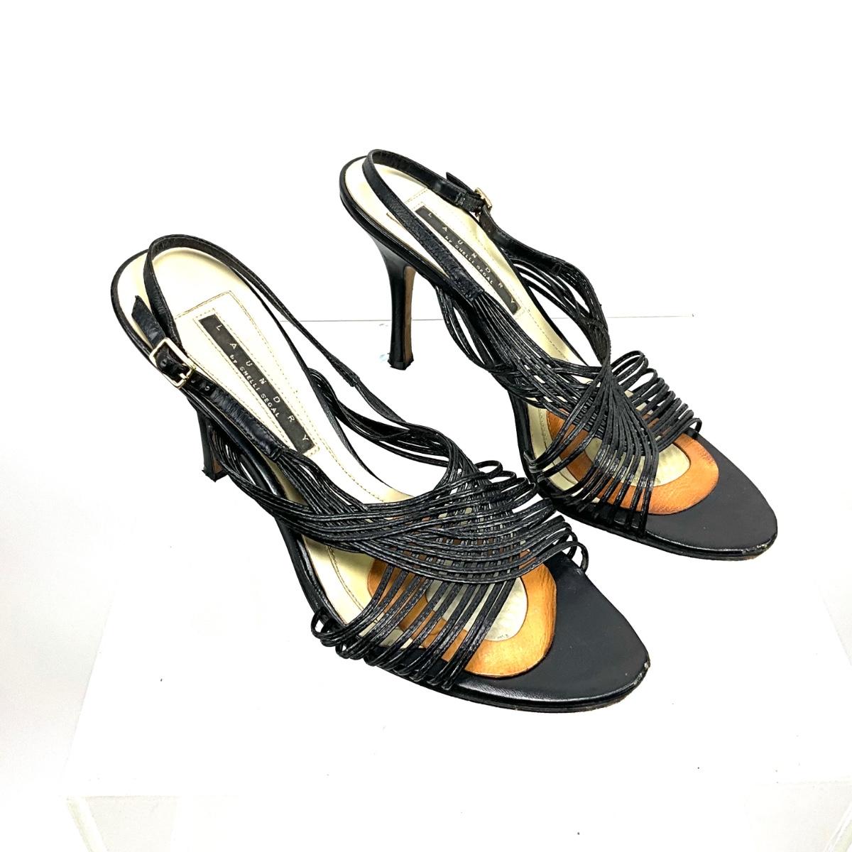 Laundry by Shelli Segal, Black Leather Strappy Sling Back Heels ( Size 9M )