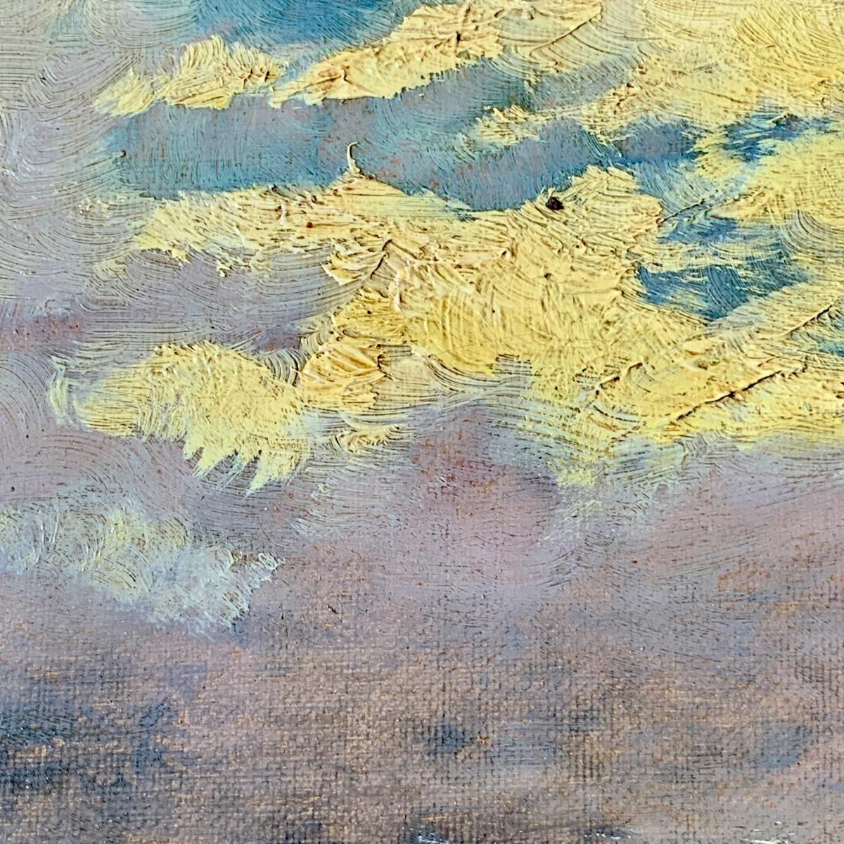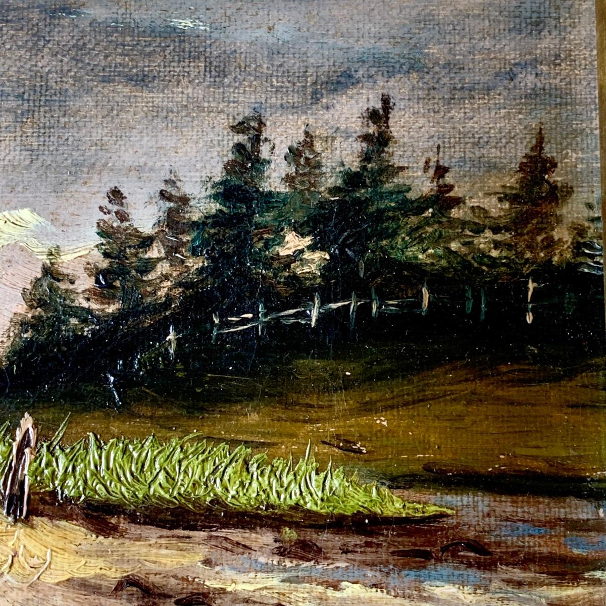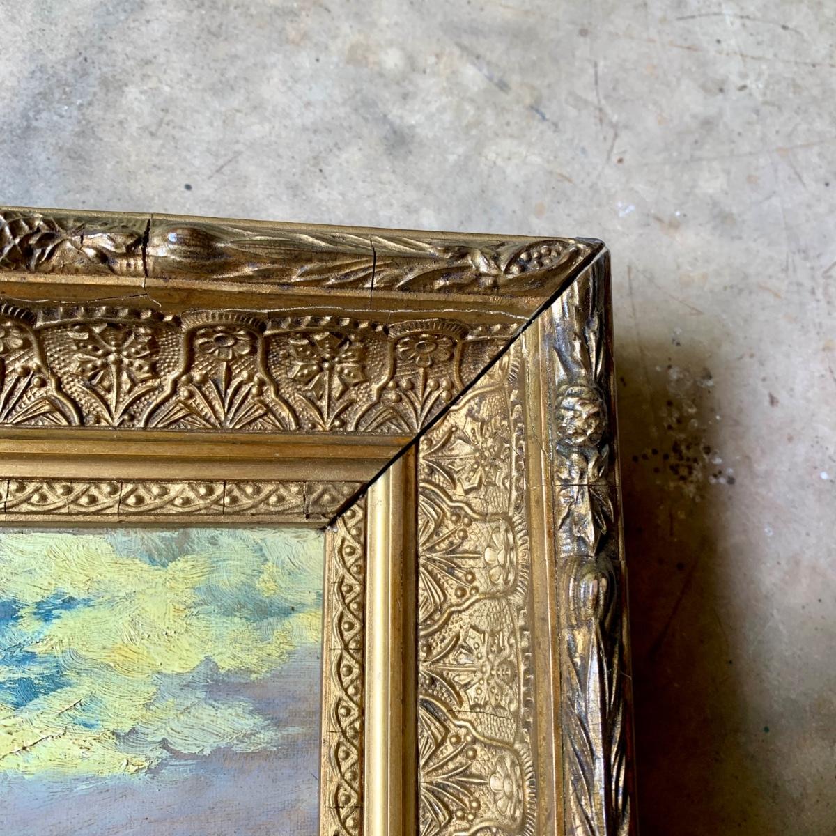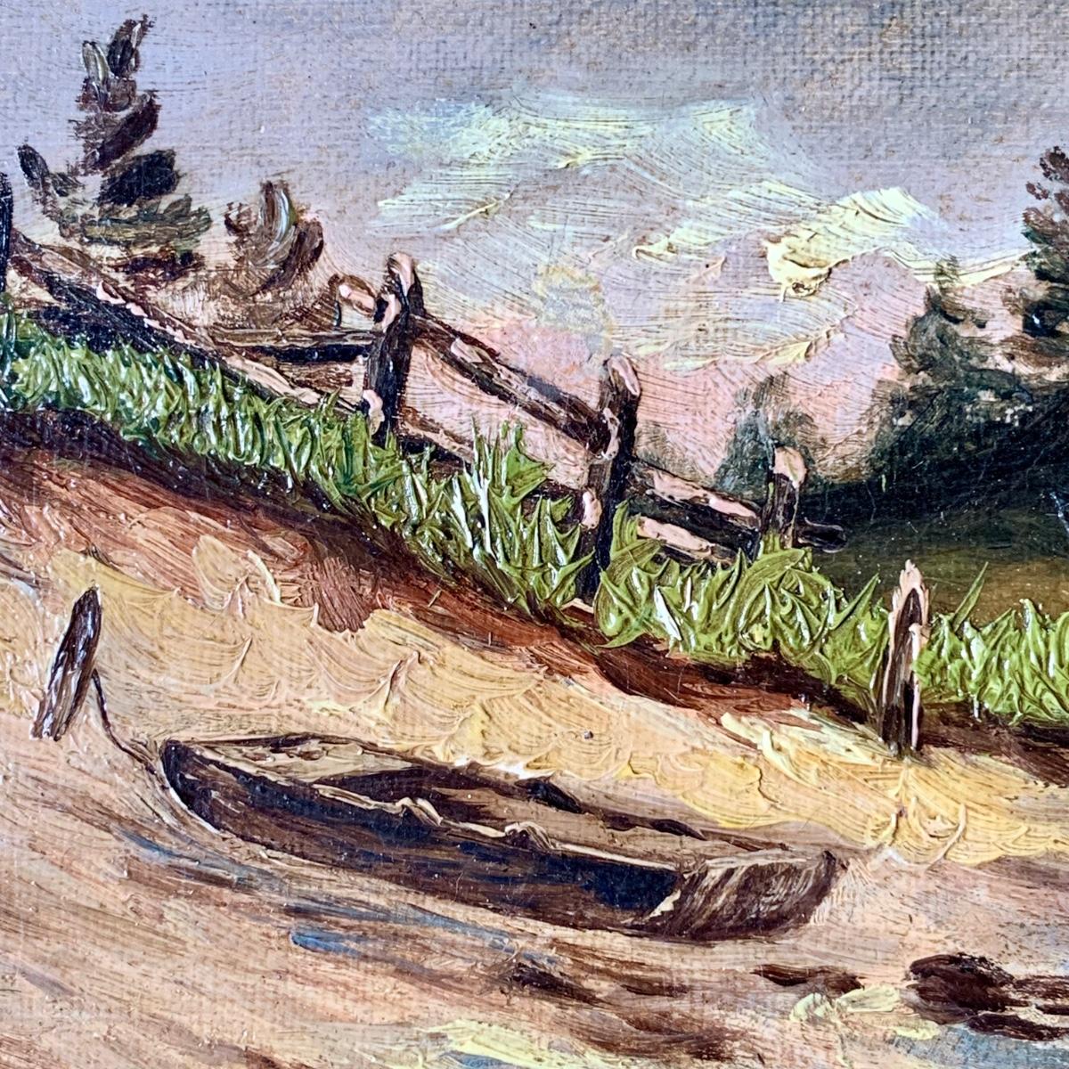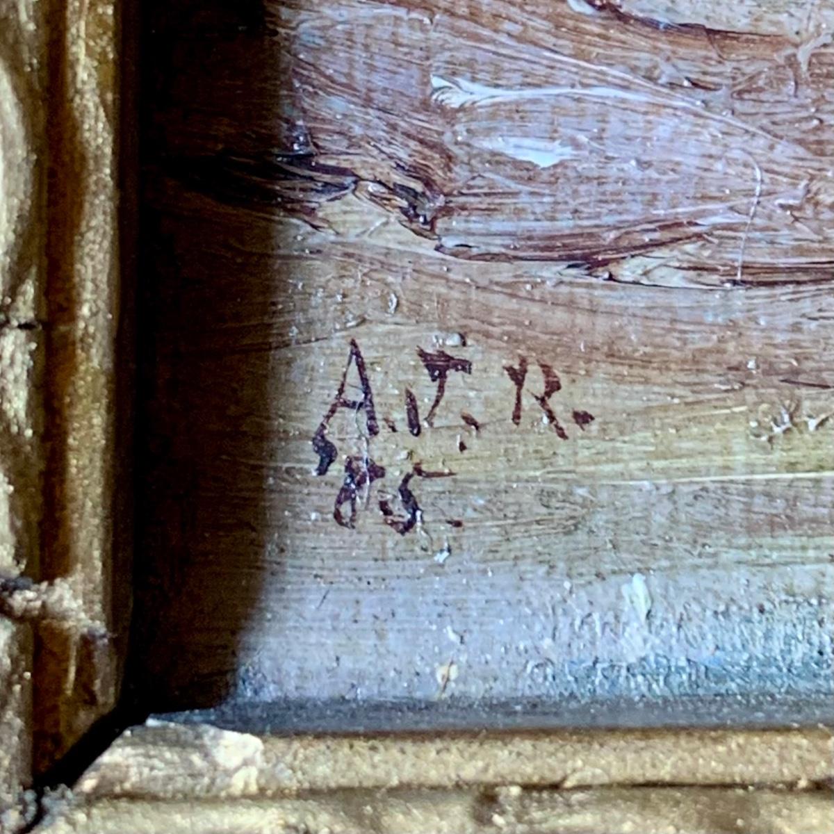 LOT 462 G: Framed & Signed Oil Painting: A. J. R. 85' River Landscape w/ Boat & Hills