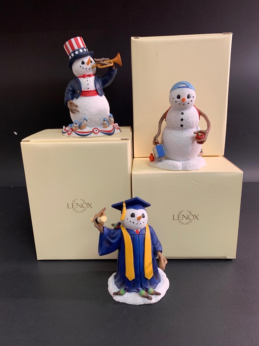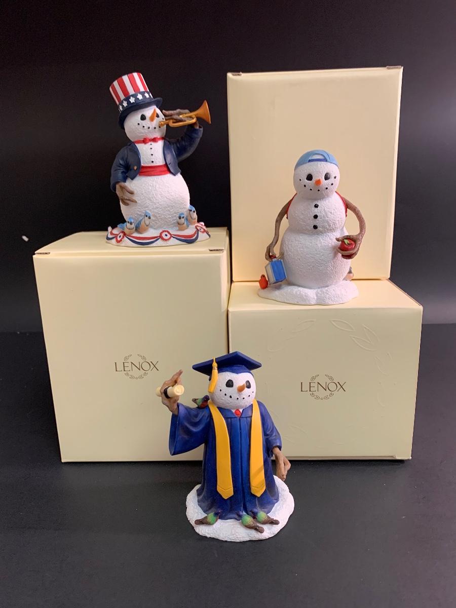 These are beautiful Lenox sculptures designed by Artist Lynn Bywaters for the Lenox American By Design Snowman Collection Made of resin, painted by hand In Original Box and Packaging”