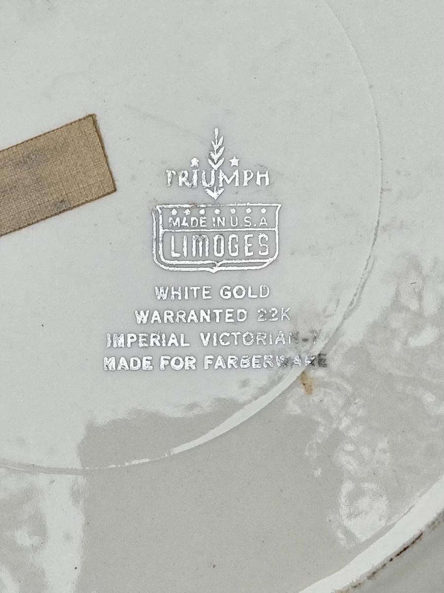 22K white gold rimmed Limoges serving plates made for Farberware. The pictures show condition, measurements if taken, and what is included in the lot. Due to the large amount that we photograph and the time frame, we are not always able to take measurements. All items unless noted, are pre-owned and have been used. If you purchased furniture, you must bring help. We do not allow one person to carry large furniture out on their own. Bring help, tools and a truck for the safety of our client’s homes, and your personal safety. Company policy. Thank you.