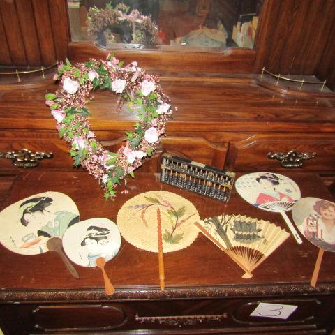 WOODEN ABACUS, HEART WREATH AND ASIAN FANS