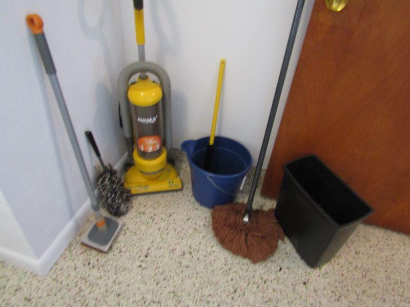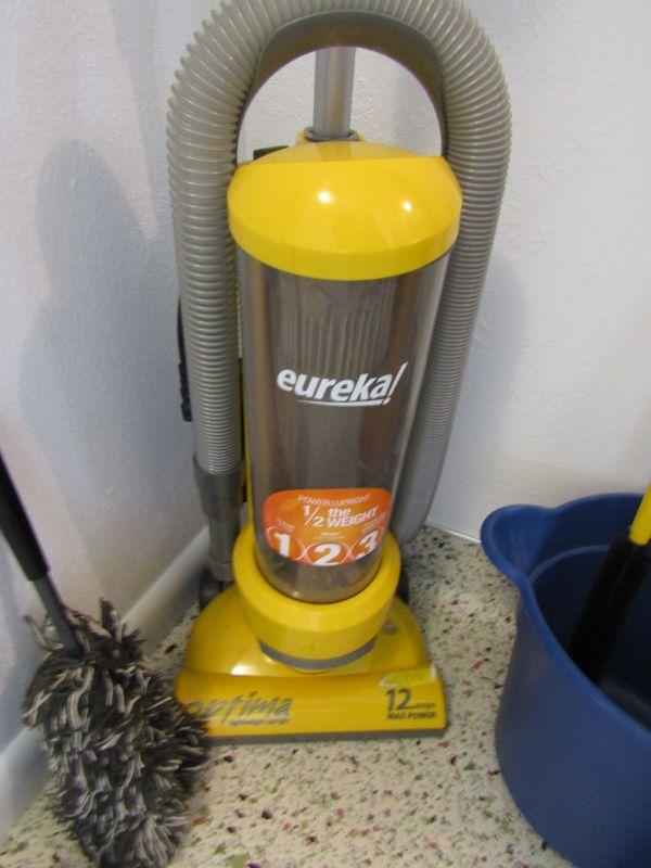 EUREKA OPTIMA SMALLER UPRIGHT VACUUM, BUCKET, TRASH CONTAINER, DUST MOP AND MORE