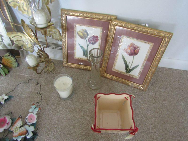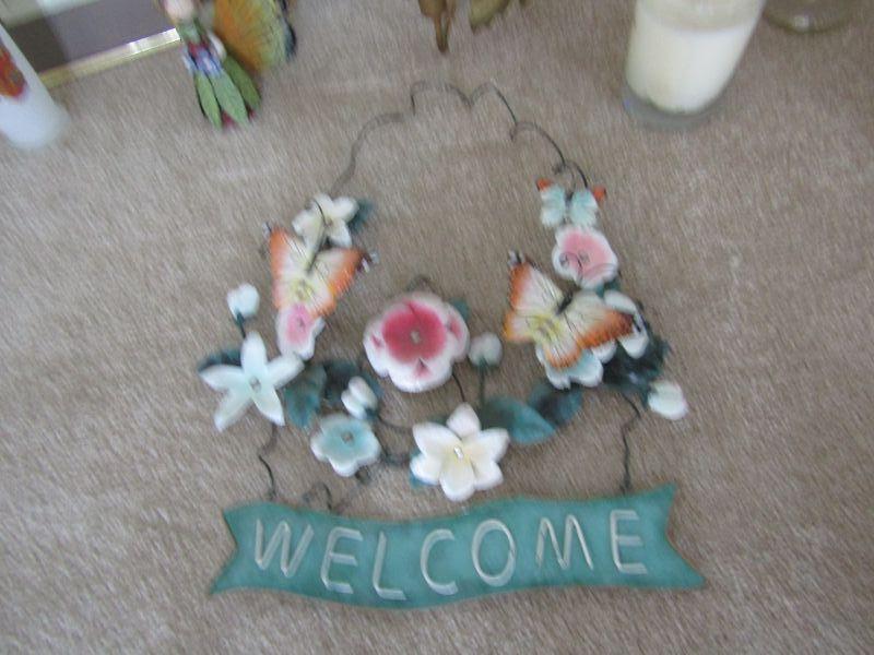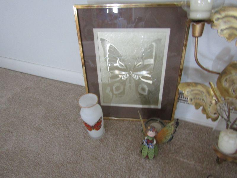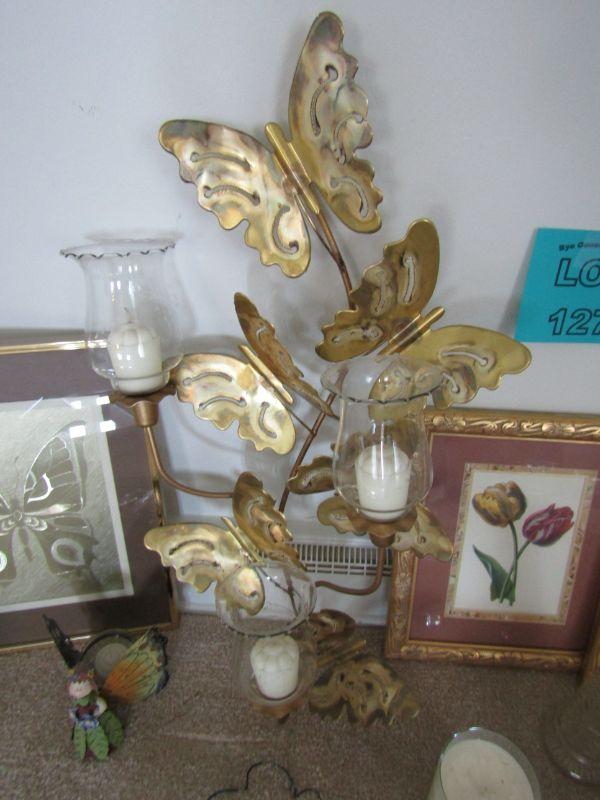 GOLD FRAMED WALL ART, HANGING TIN BUTTERFLIES, WELCOME SIGN AND OTHER