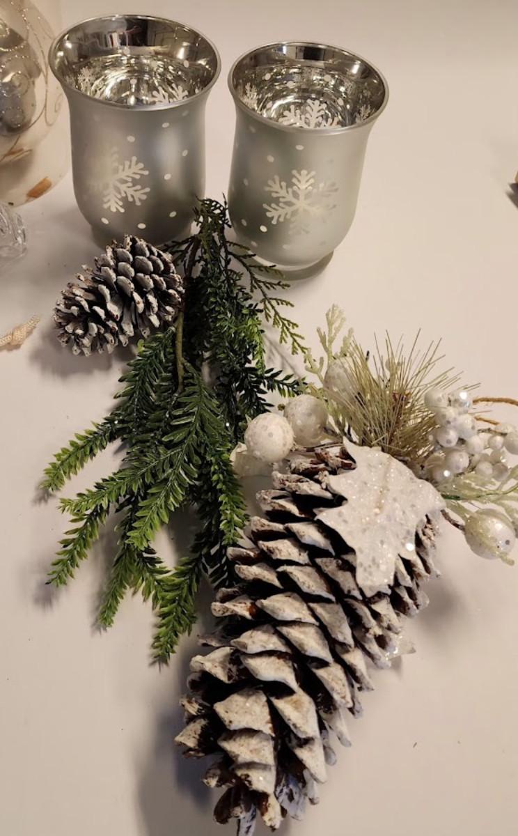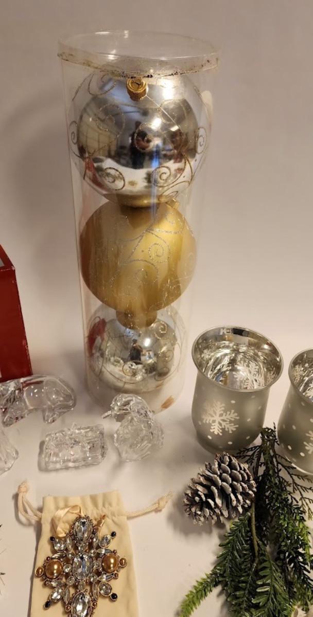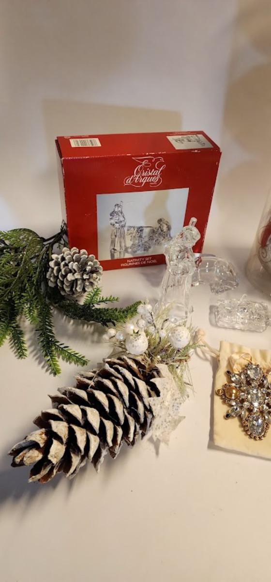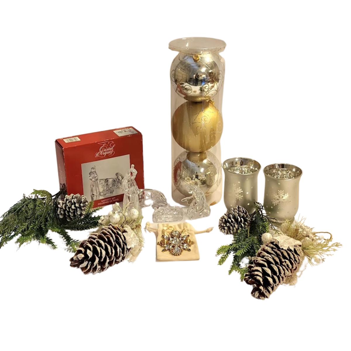 Lot includes: Crystal Nativity Set, Gold and Silver Christmas Ornaments, Snowflake Votive Candle Holders, Frosted Pine cone Decorations, Gold and Crystal Brooch and Greenery with Berries Decor