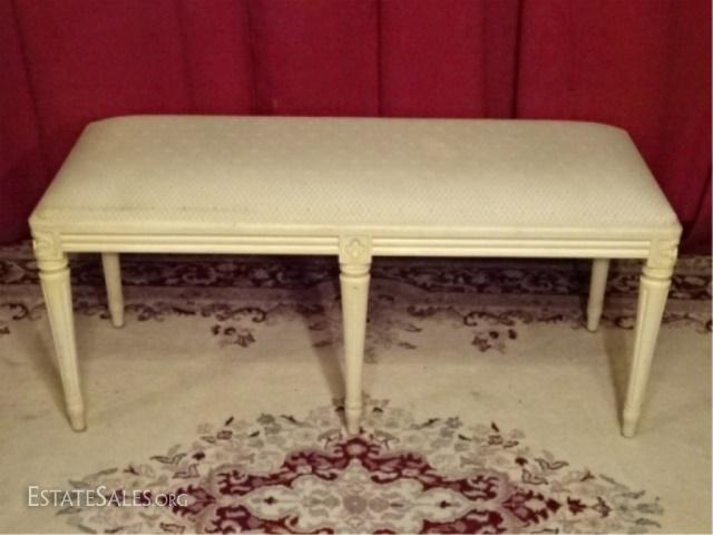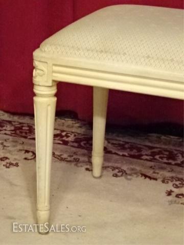 LOT 46A: LOUIS XVI STYLE BENCH, WHITE FINISH, FLUTED LEGS, UPHOLSTERED SEAT, SOLID VINTAGE CONDITION WITH SOME SPOTS AND STAINS TO SEAT, 40" X 18" X 16", SKU387.16