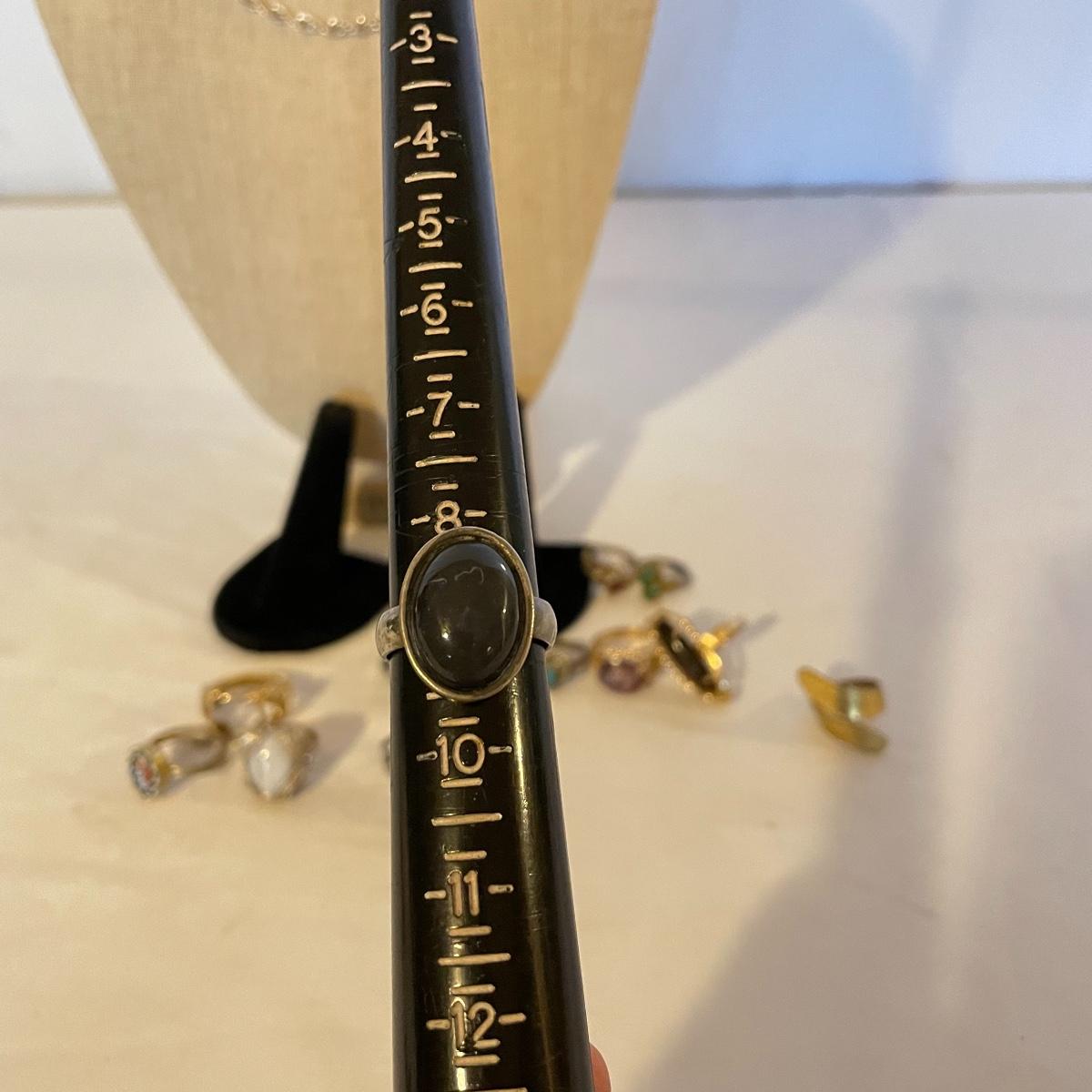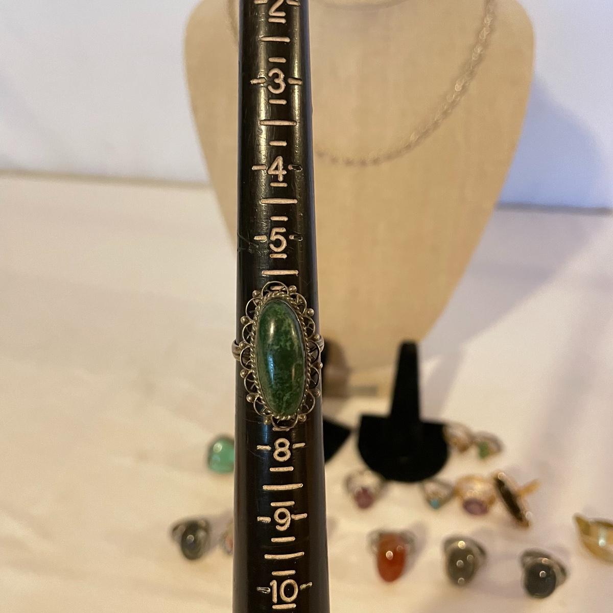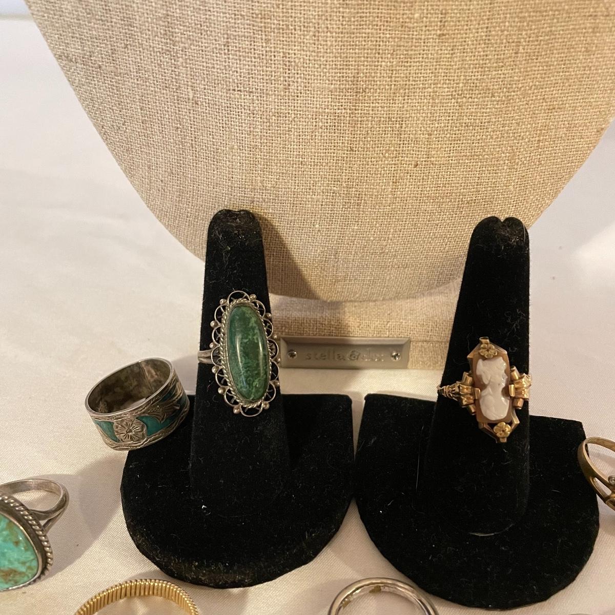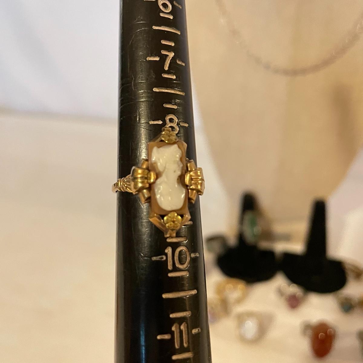 Another great selection of polished stone jewelry with a 10K cameo and 925 chain. Another two rings are marked 925, all other known markings are shown in images. Some rings are adjustable and there is even a pretty setting waiting for your own stone! A few items appear to have turquoise and a couple traditional rings have other bright beauties like a possible ruby although we certainly cannot make any claims on authenticity. There are three similar rings with iridescent centerpieces, these change colors depending on how the light hits them. See images. Shipping available.