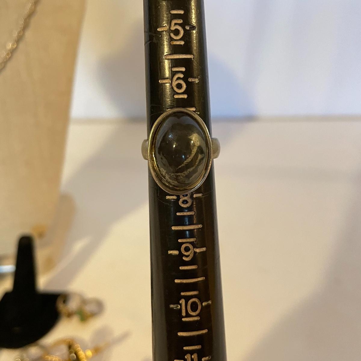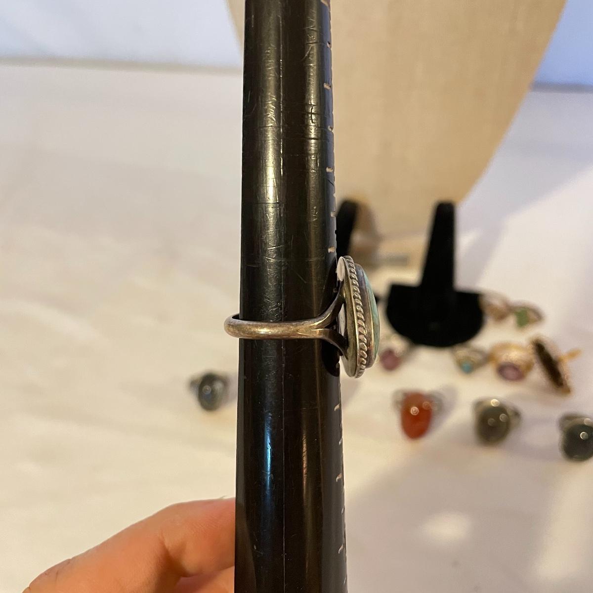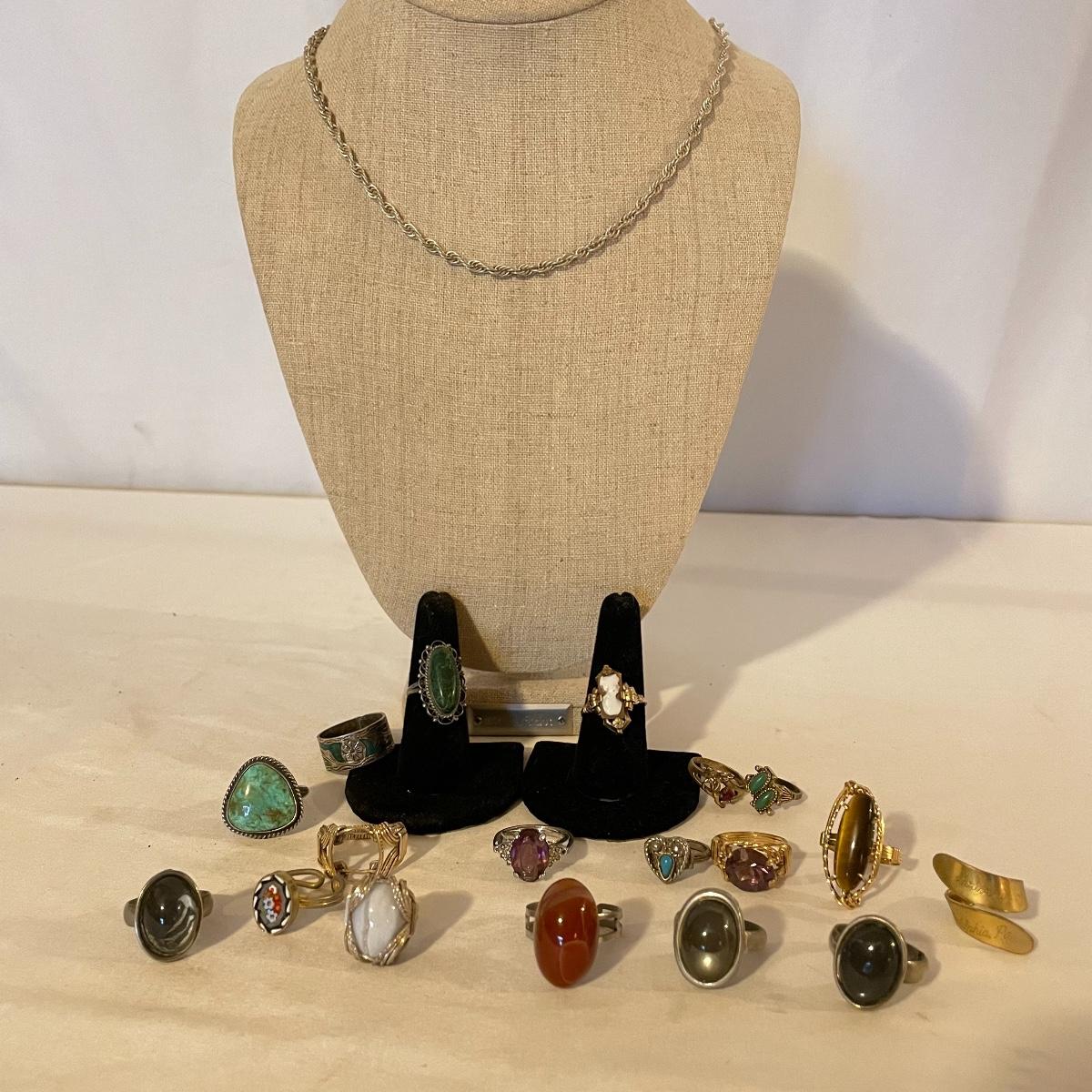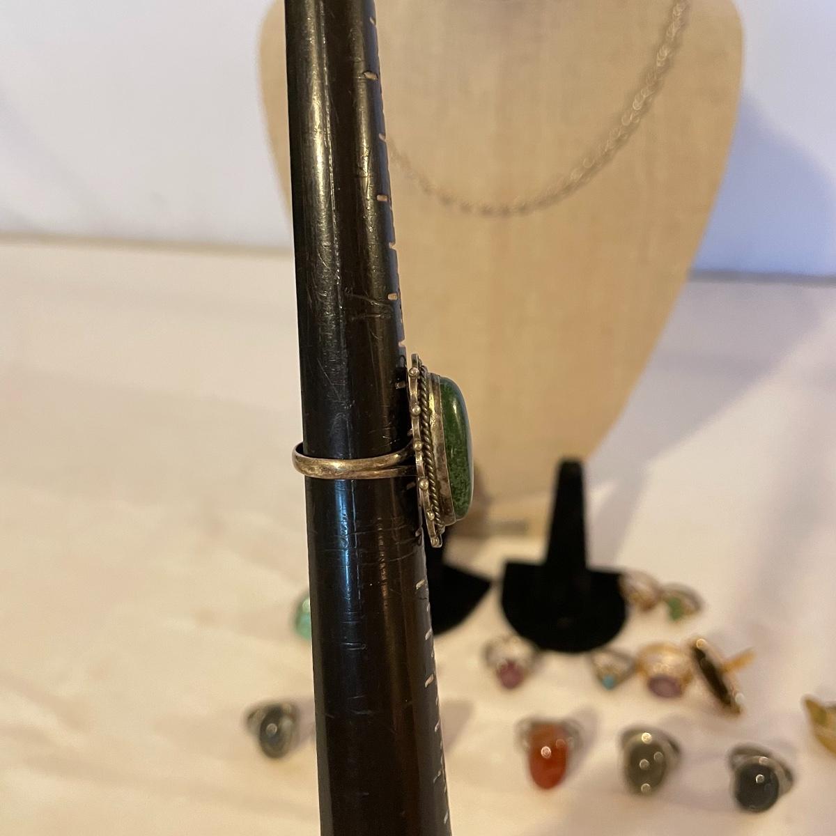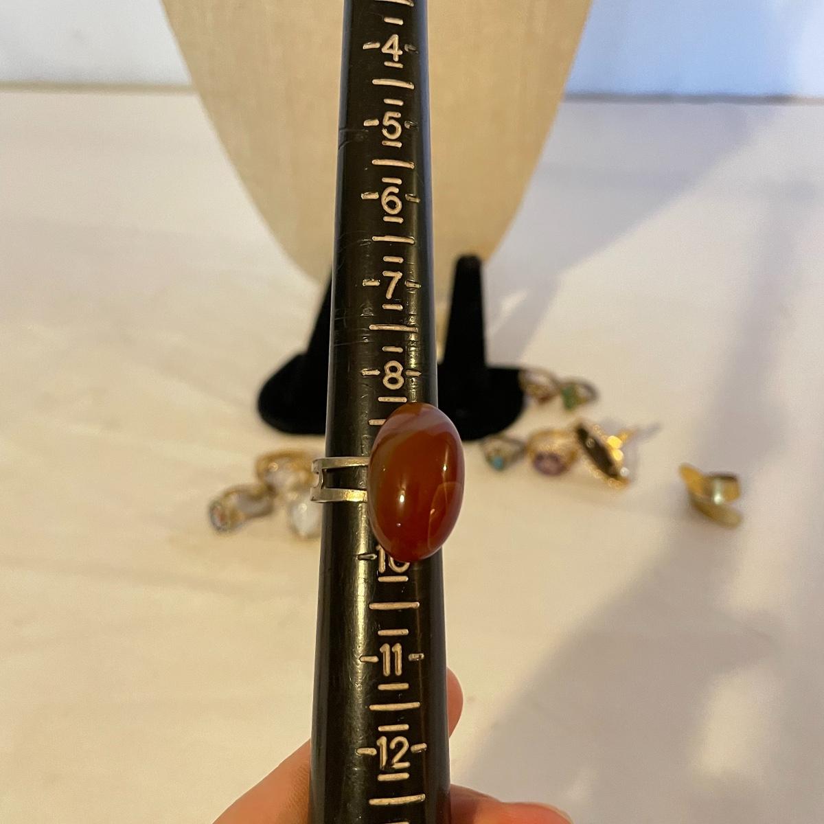 Another great selection of polished stone jewelry with a 10K cameo and 925 chain. Another two rings are marked 925, all other known markings are shown in images. Some rings are adjustable and there is even a pretty setting waiting for your own stone! A few items appear to have turquoise and a couple traditional rings have other bright beauties like a possible ruby although we certainly cannot make any claims on authenticity. There are three similar rings with iridescent centerpieces, these change colors depending on how the light hits them. See images. Shipping available.