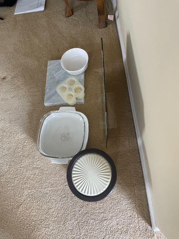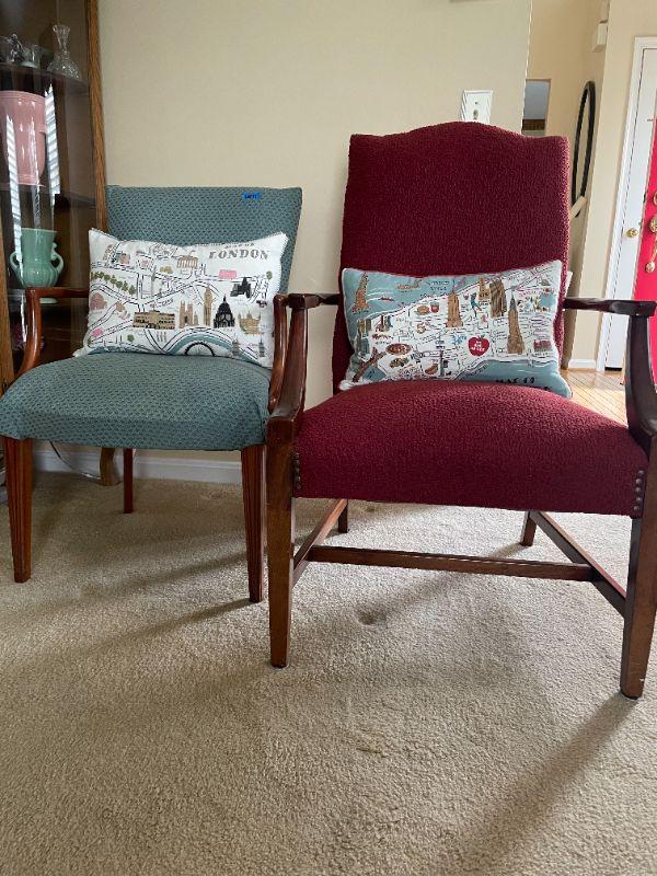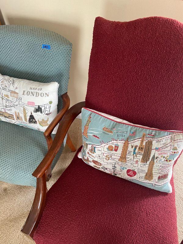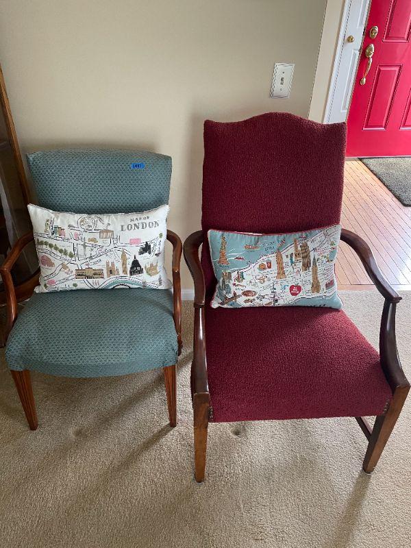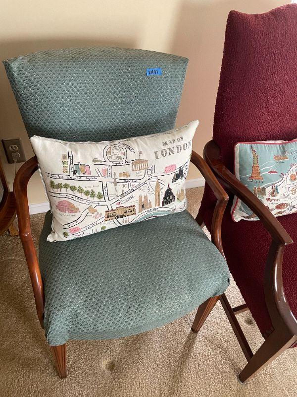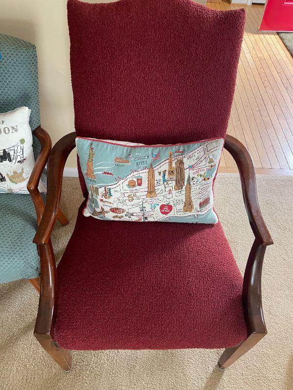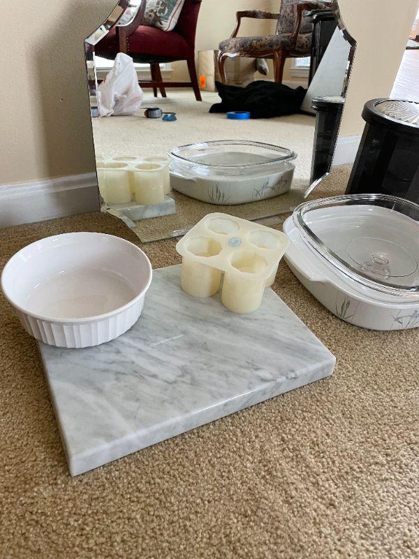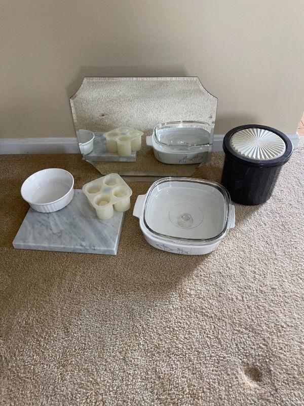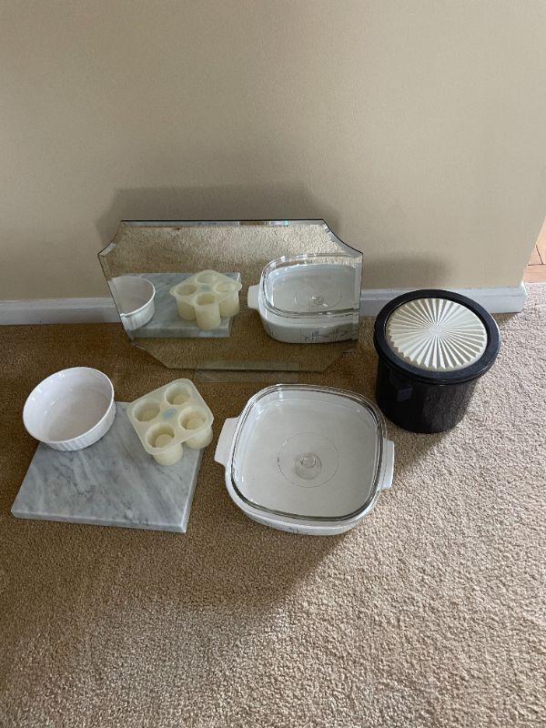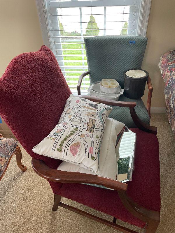 Green upholstered chair, red upholstered chair, Tupperware, marble cutting board, mirror, (2) decorative throw pillows.