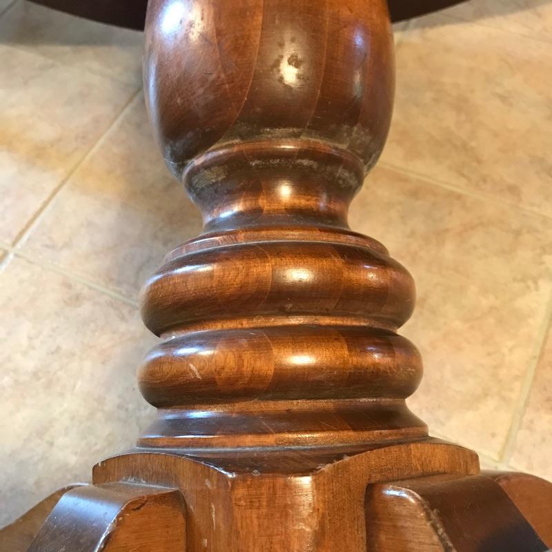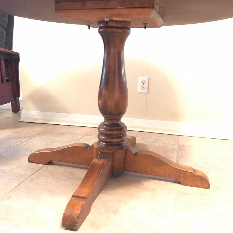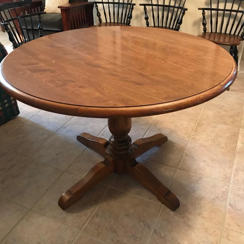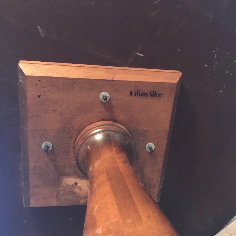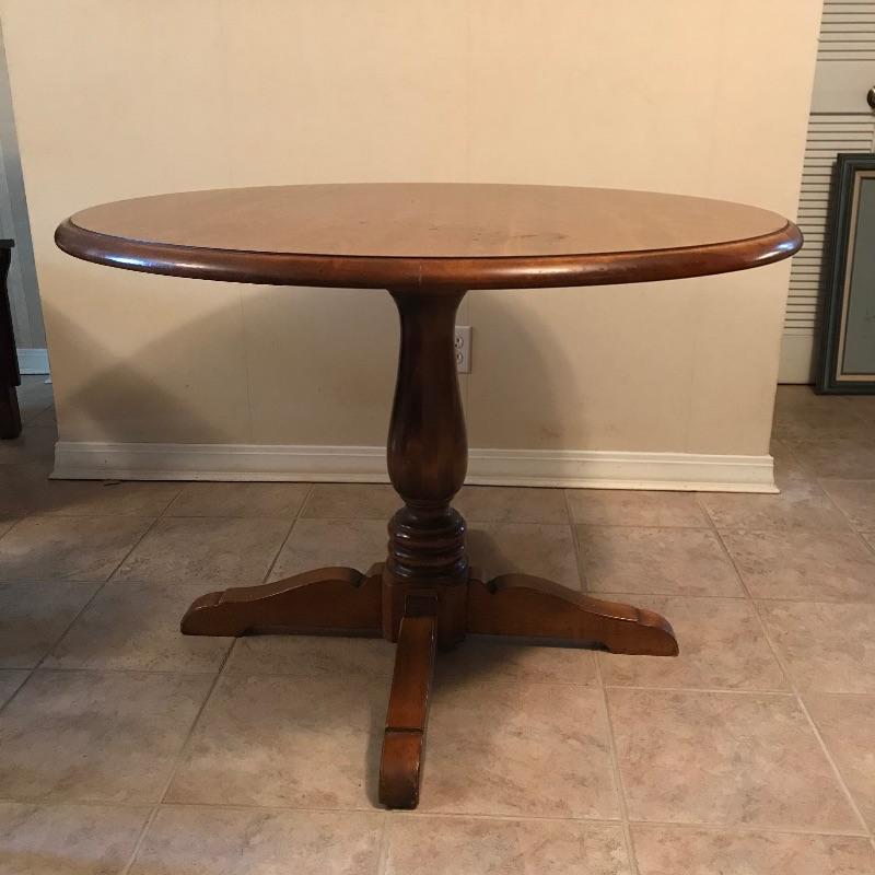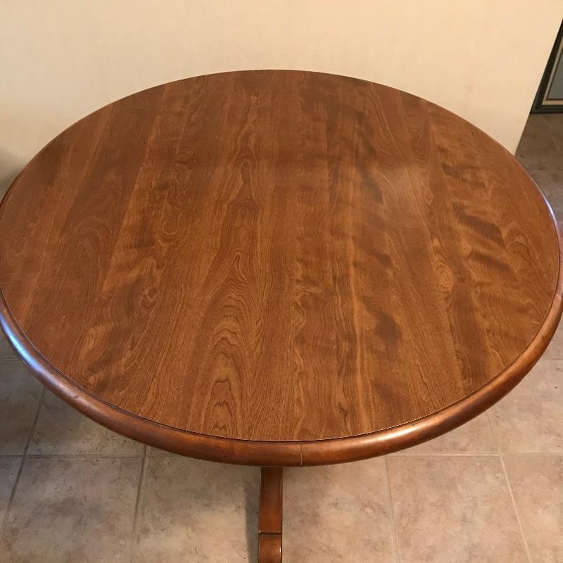 Nice Ethan Allen dinette table perfect for smaller spaces. Shown in cover photo with four Ethan Allen Comb Back chairs found in lot 46. Table is in very nice condition with minimal wear and a smooth finish. Table measures approximately 43”d x 30”. See photos. No shipping.