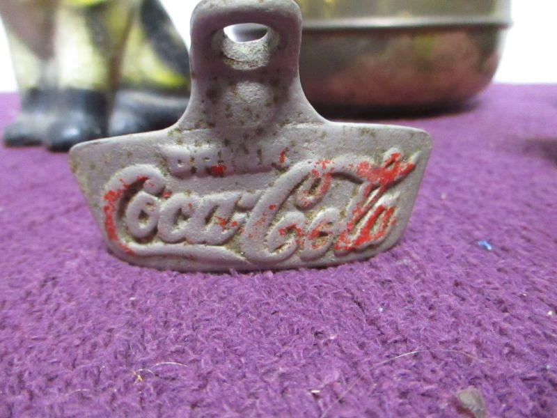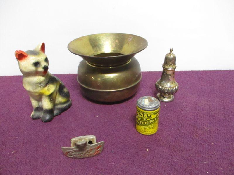 Coca Cola Opener, snuff can, cat, shaker and more