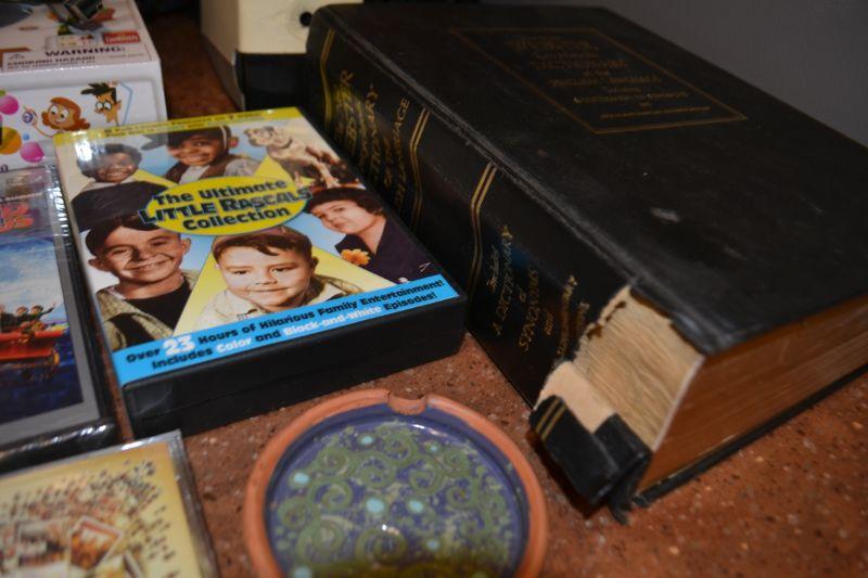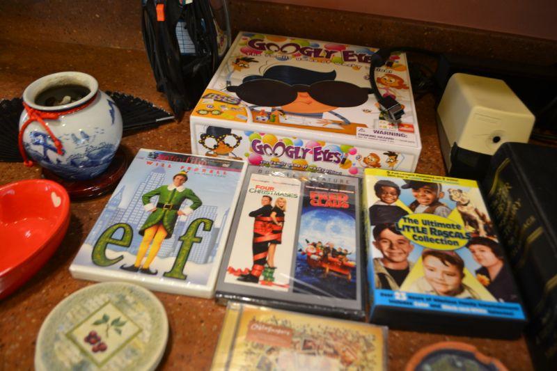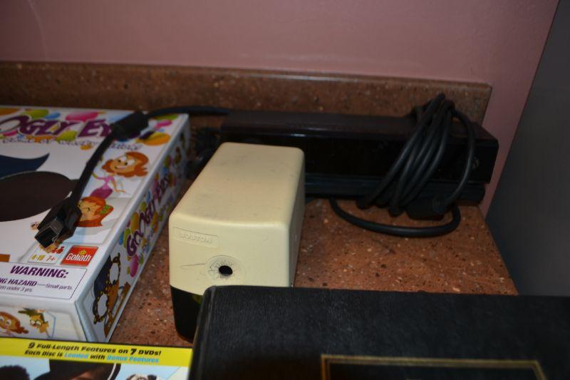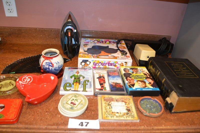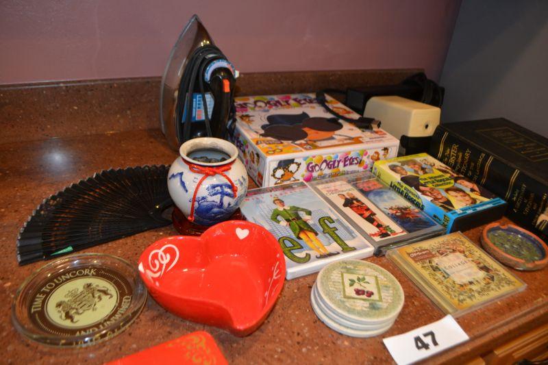 MISC ITEM GROUPING DVD'S, HOME DECOR, IRON, PENCIL SHARPNER