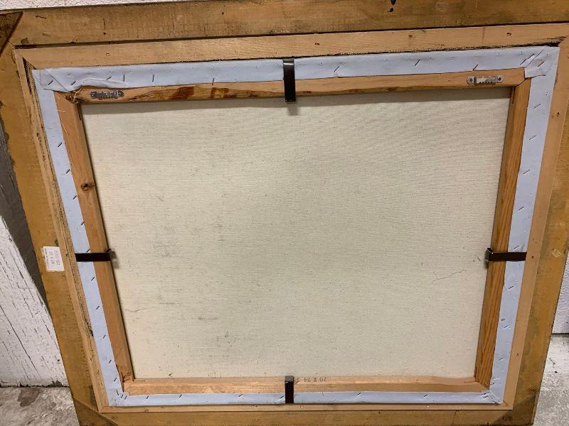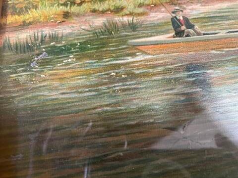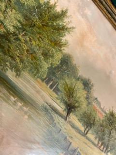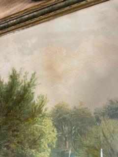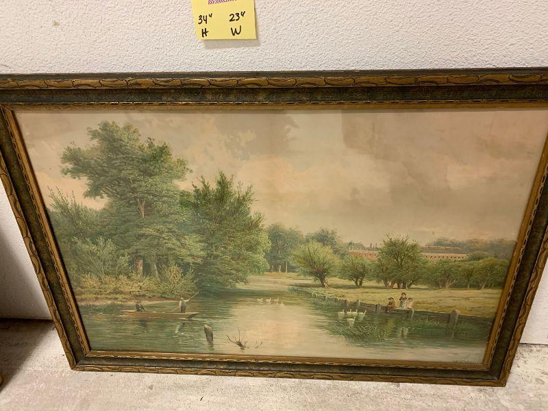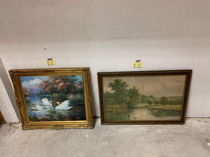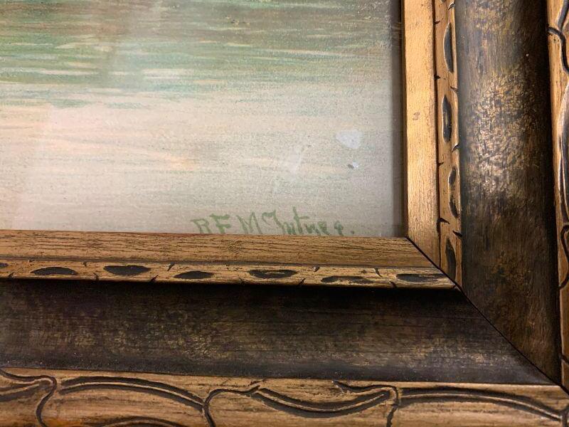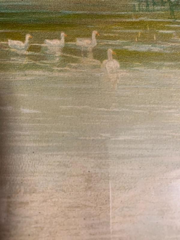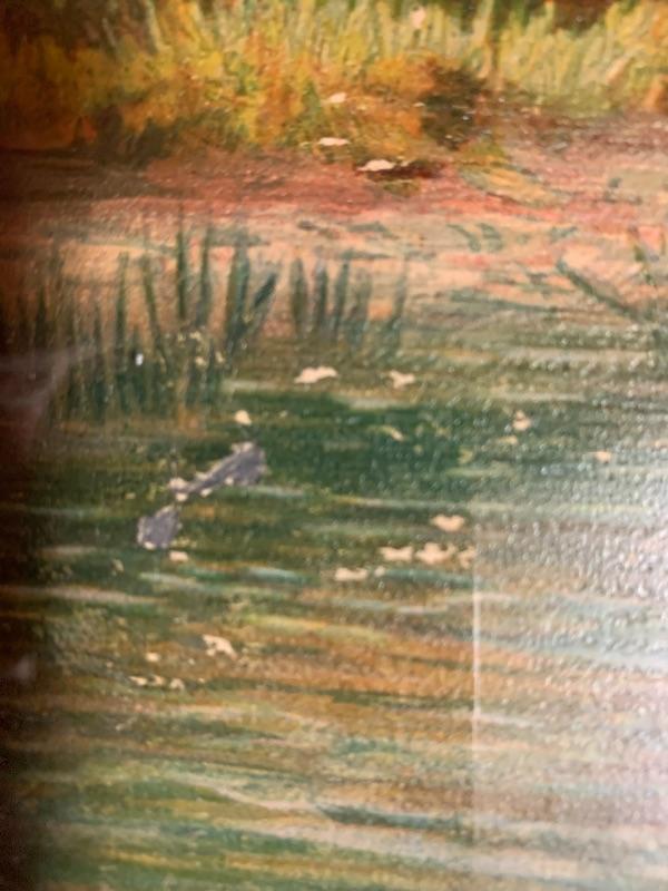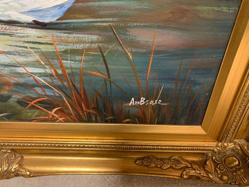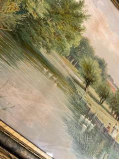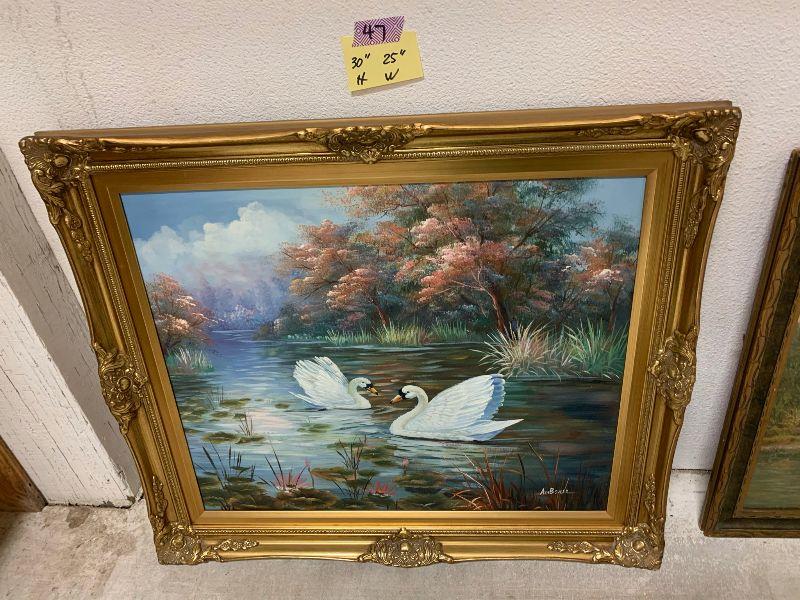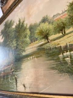 Oil on canvas of swans and trees, people and water by RF. Mc Intyre
