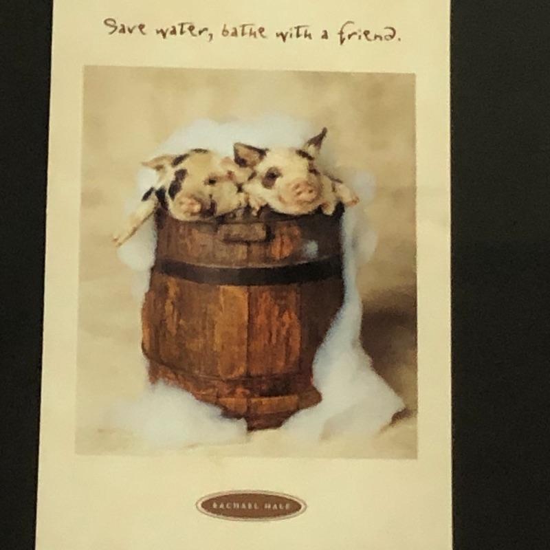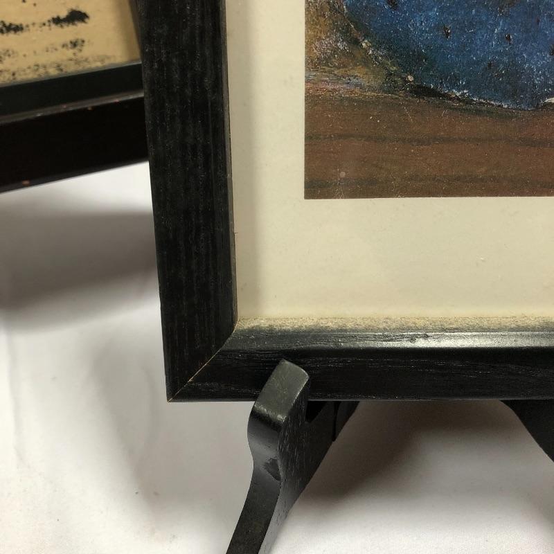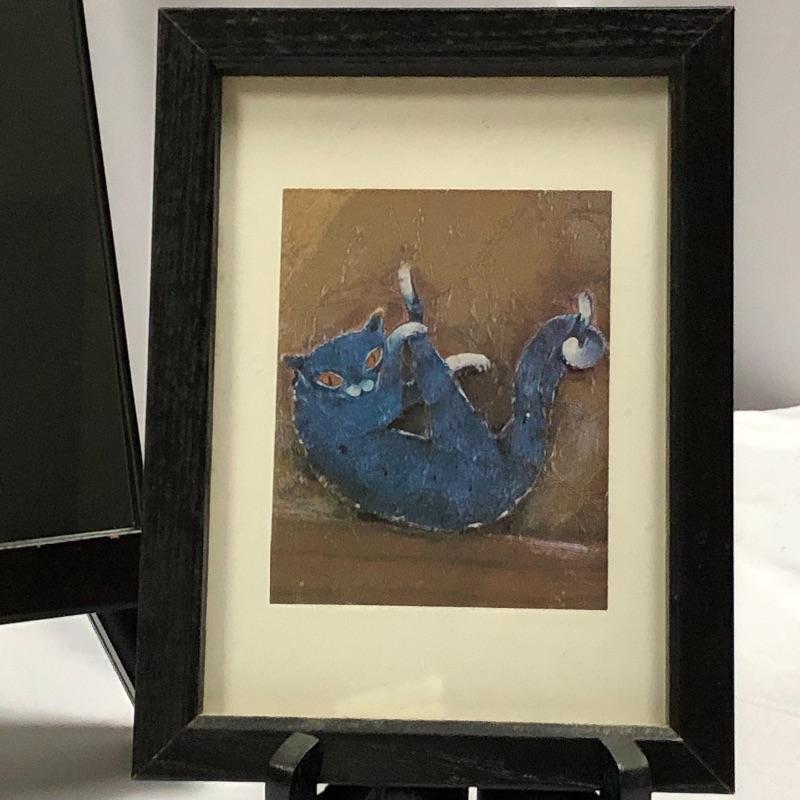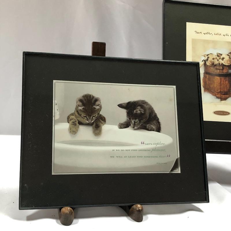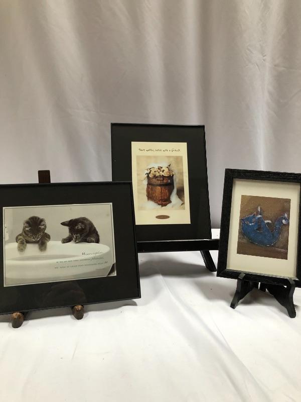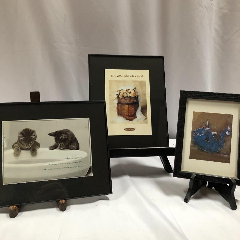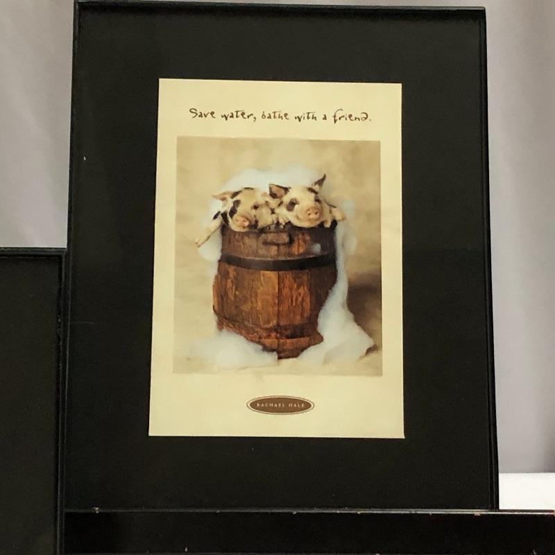 Each one of these three framed pieces is cuter than the next! All are mounted in black frames, the smallest in a wood frame and the the other two in plastic. The pig frame measures 8” x 10”.