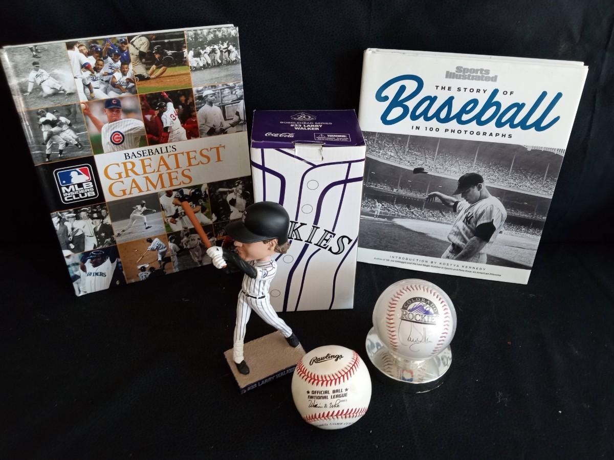 LOT 47 LARRY WALKER BOBBLEHEAD, COFFEE TABLE BOOKS AND BASEBALLS