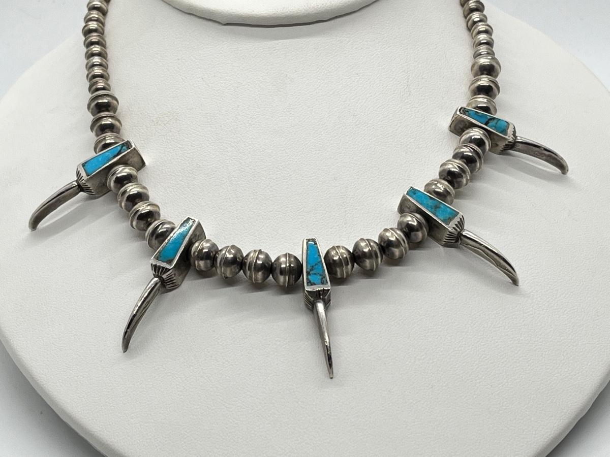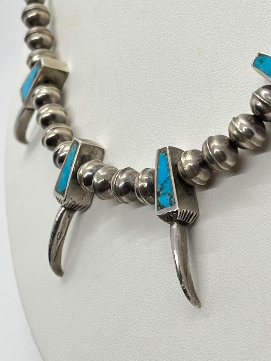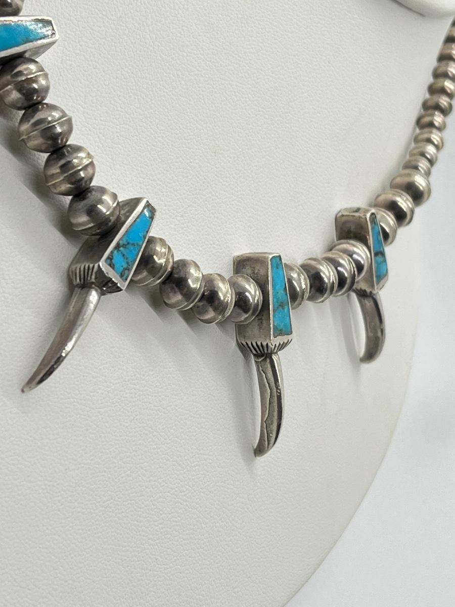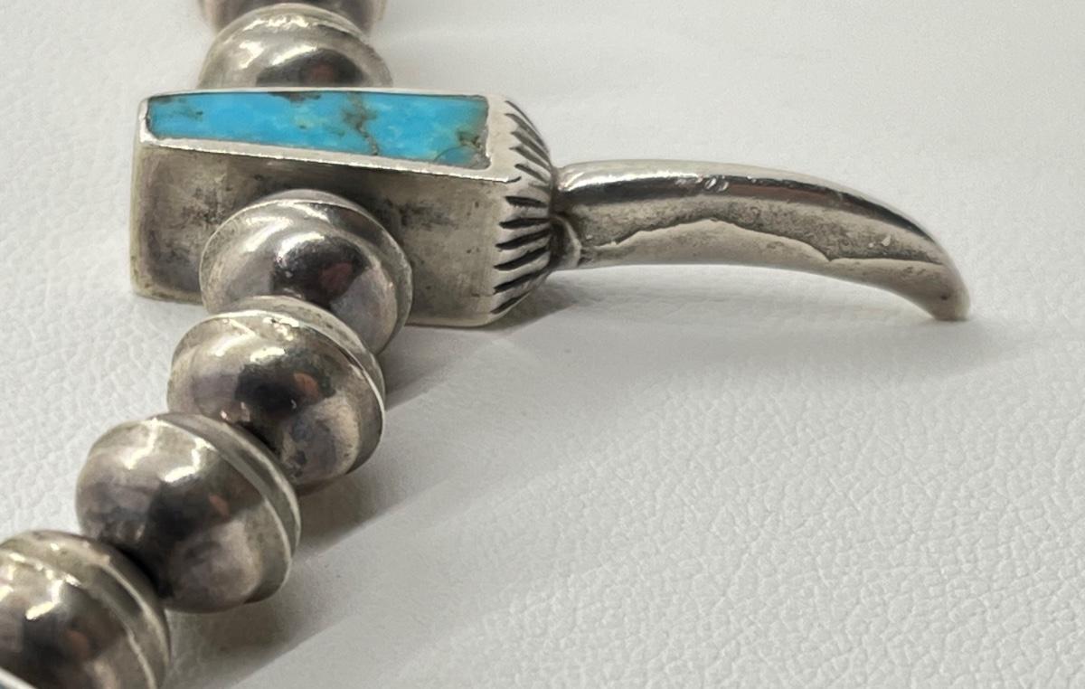 LOT 47: Navajo "Eagle Talon" Turquoise & Sterling Silver Bench Bead 17" Necklace - 38.3 grams total weight