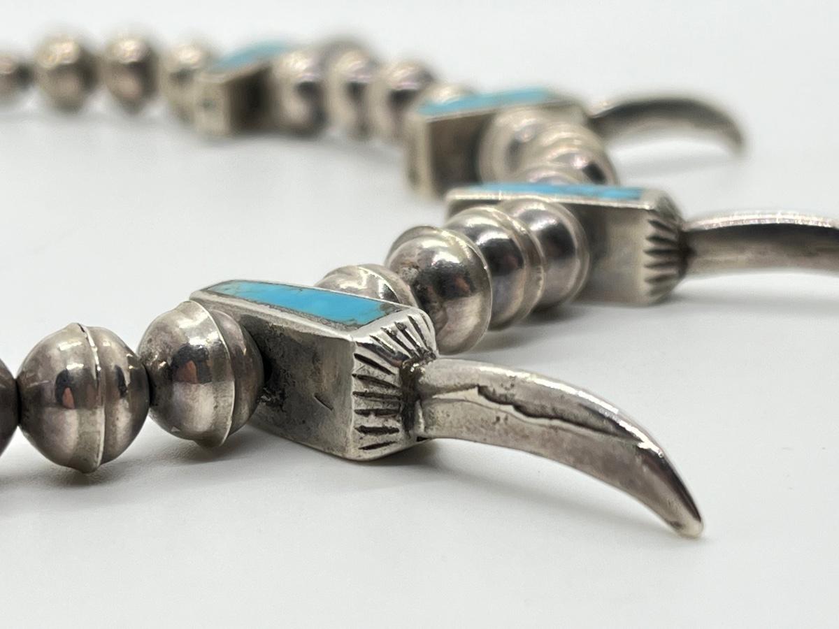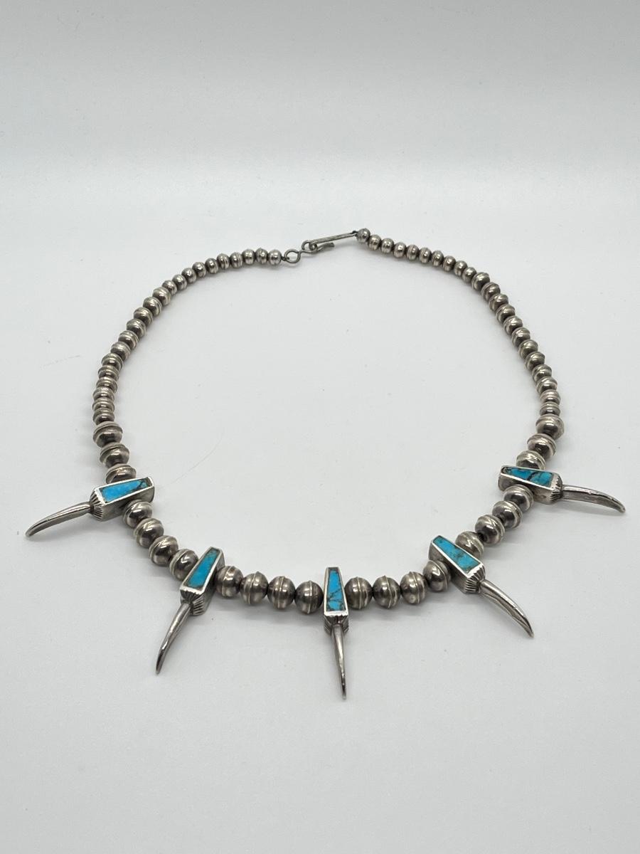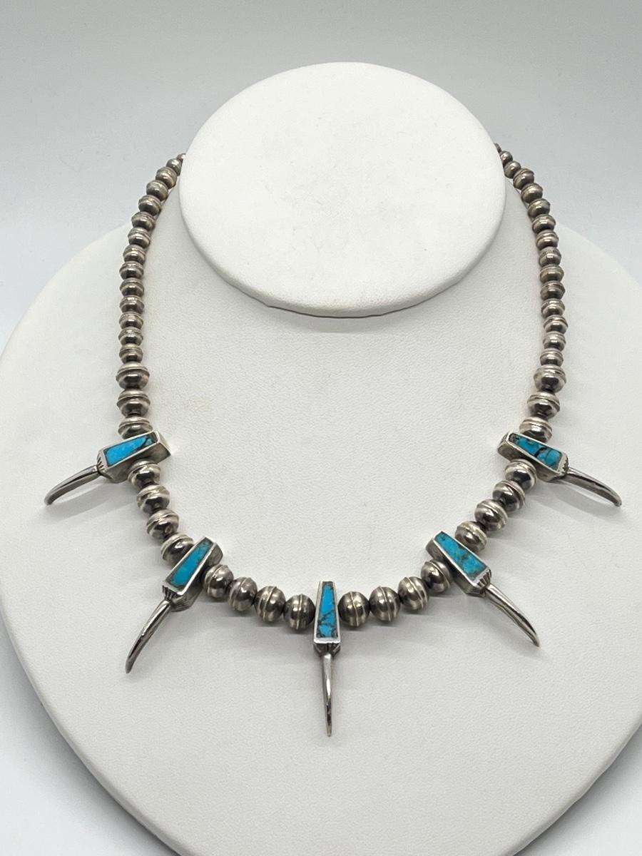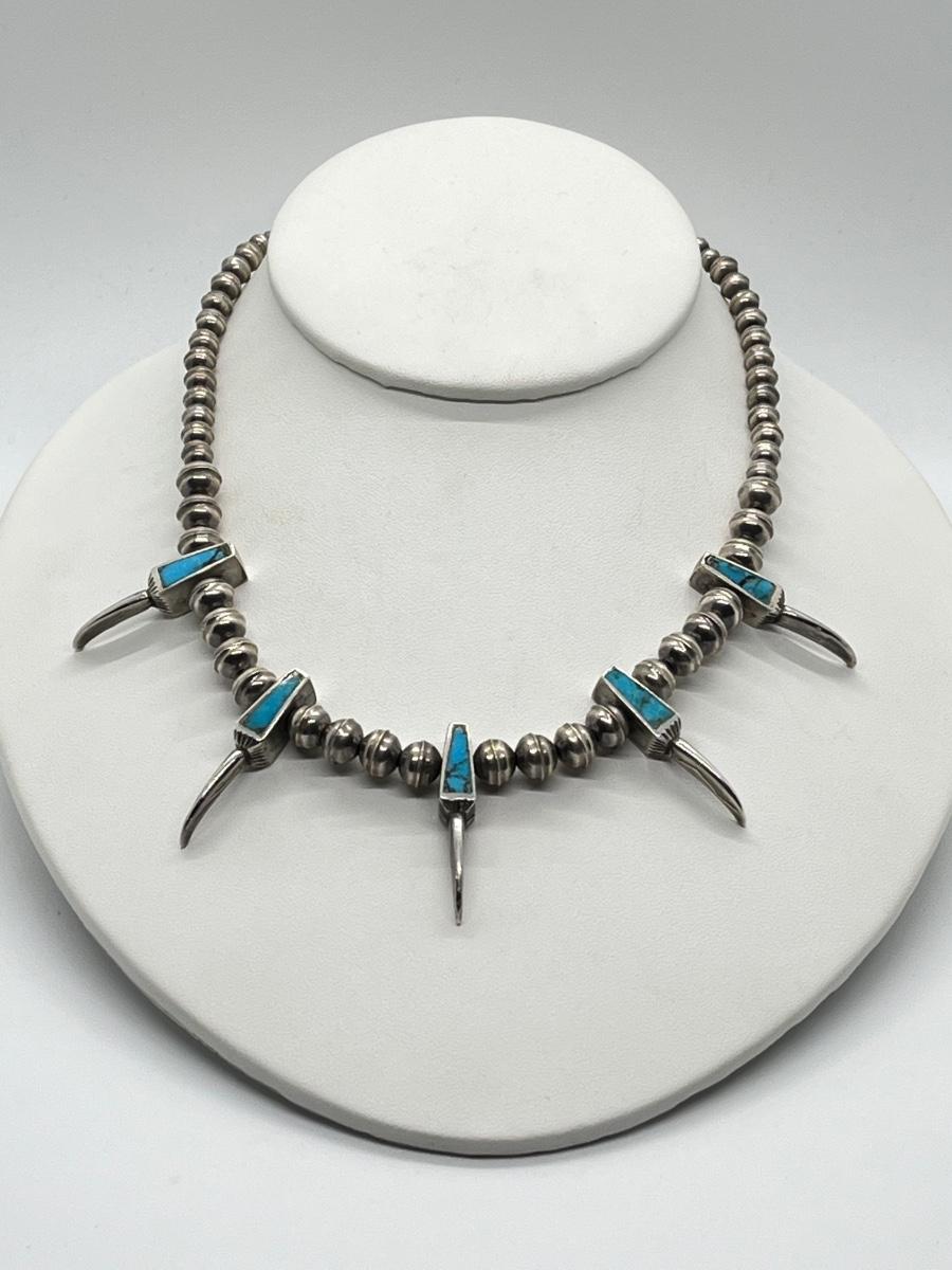 LOT 47: Navajo "Eagle Talon" Turquoise & Sterling Silver Bench Bead 17" Necklace - 38.3 grams total weight