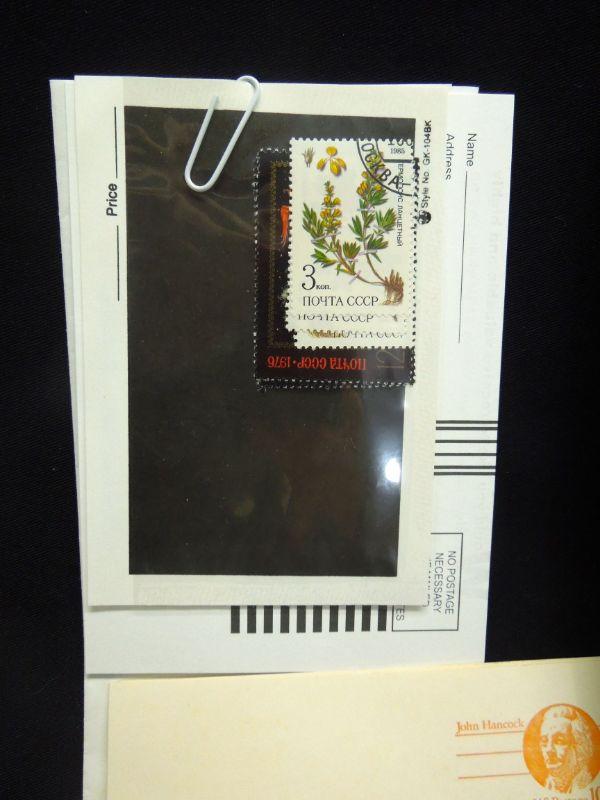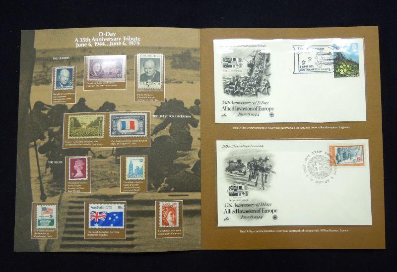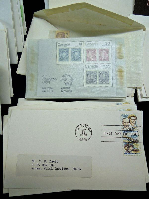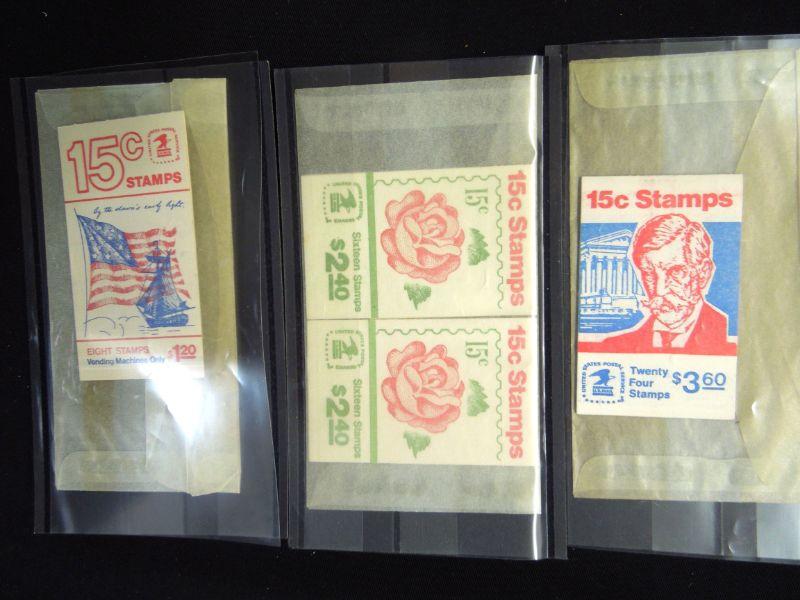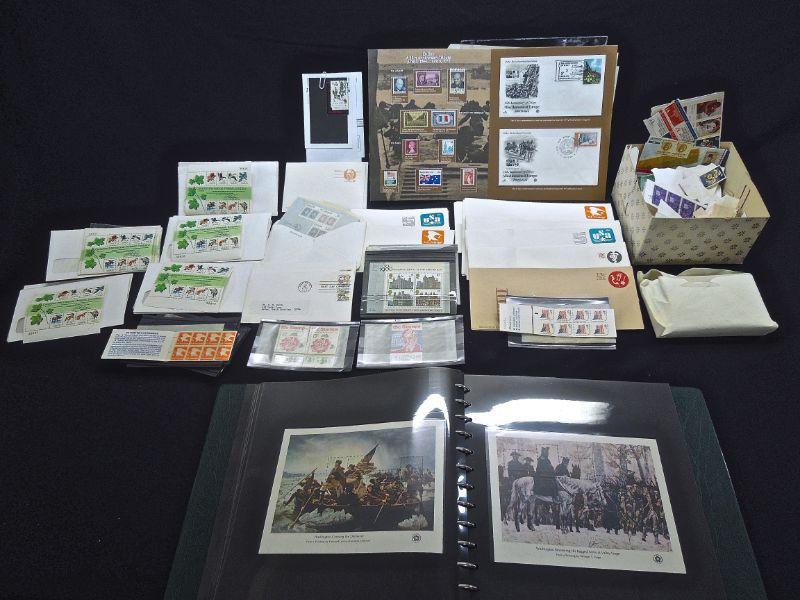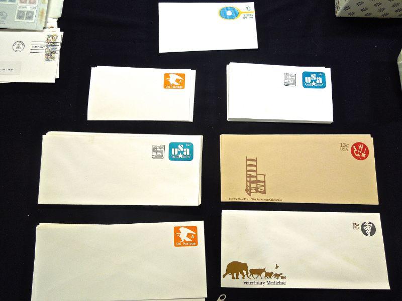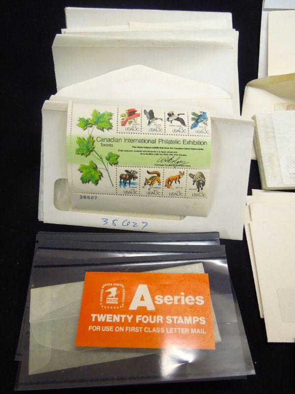 US series A 7 booklets; 15 cent Rose stamps 2 booklets; 15 cent Oliver Wendell Holmes legal envelope and 1 booklet; 15 cent Flag stamps 1 booklet; Bicentenial 13 cent legal first day covers x 2; veterinary 15 cent first day covers x 2; 16 cent USA first day covers revalued to 15 cents x 15; legal US Postage A Eagle envelopes x 17; London 1980 International Stamp Exhibition blocks x 12; USA Eagle Postcard x3; 10 cent US Tennis envelope x 2; 13 cent US golf envelope x 1; Wright Bros. First Day Cover x 5; Capex 78 Canada Centennial Block x 15; John Hancock postcards x 2; Block of greek stamps; 1 box loose unused and cancelled stamps; D-Day Stamp Exhibition Folio x 1.