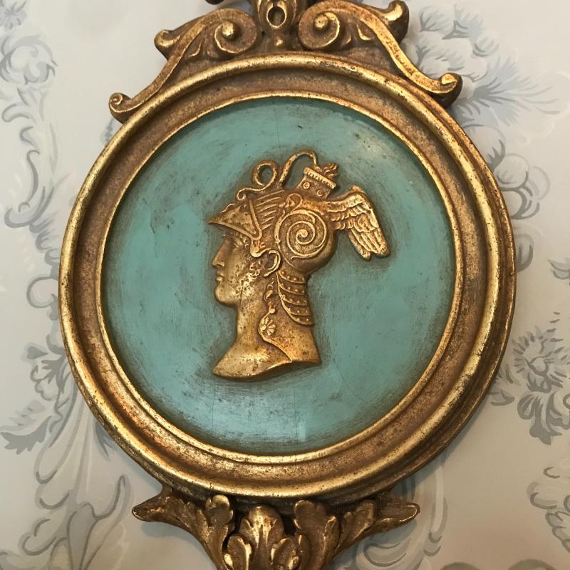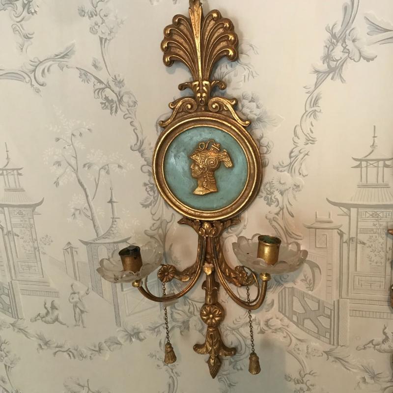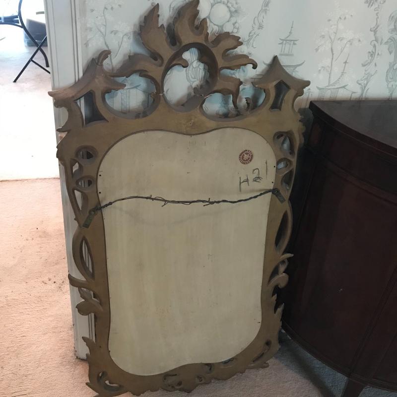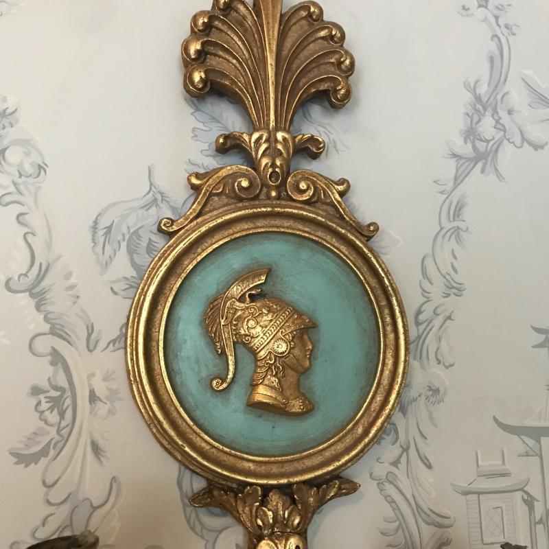 Stunning wood pieces painted gold. Mirror measures approx. 24”x44.5”. The top part of the mirror frame has begun to separate and is extremely fragile. Mirror is complemented by two wood/metal gold and teal painted candelabras with busts adorning the center. No shipping.
