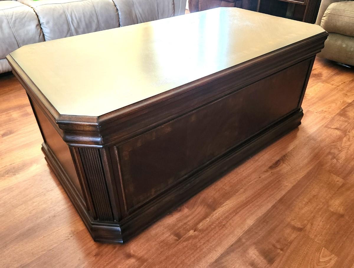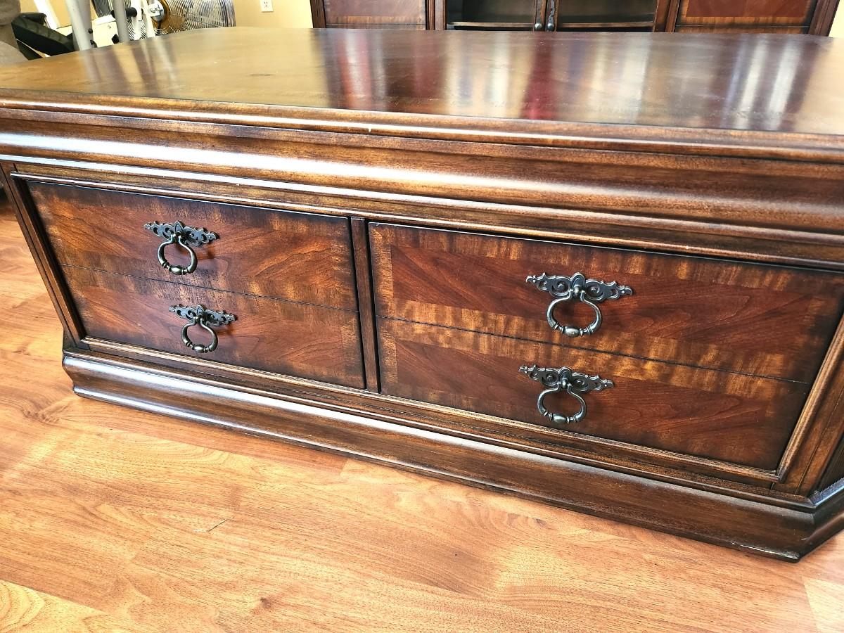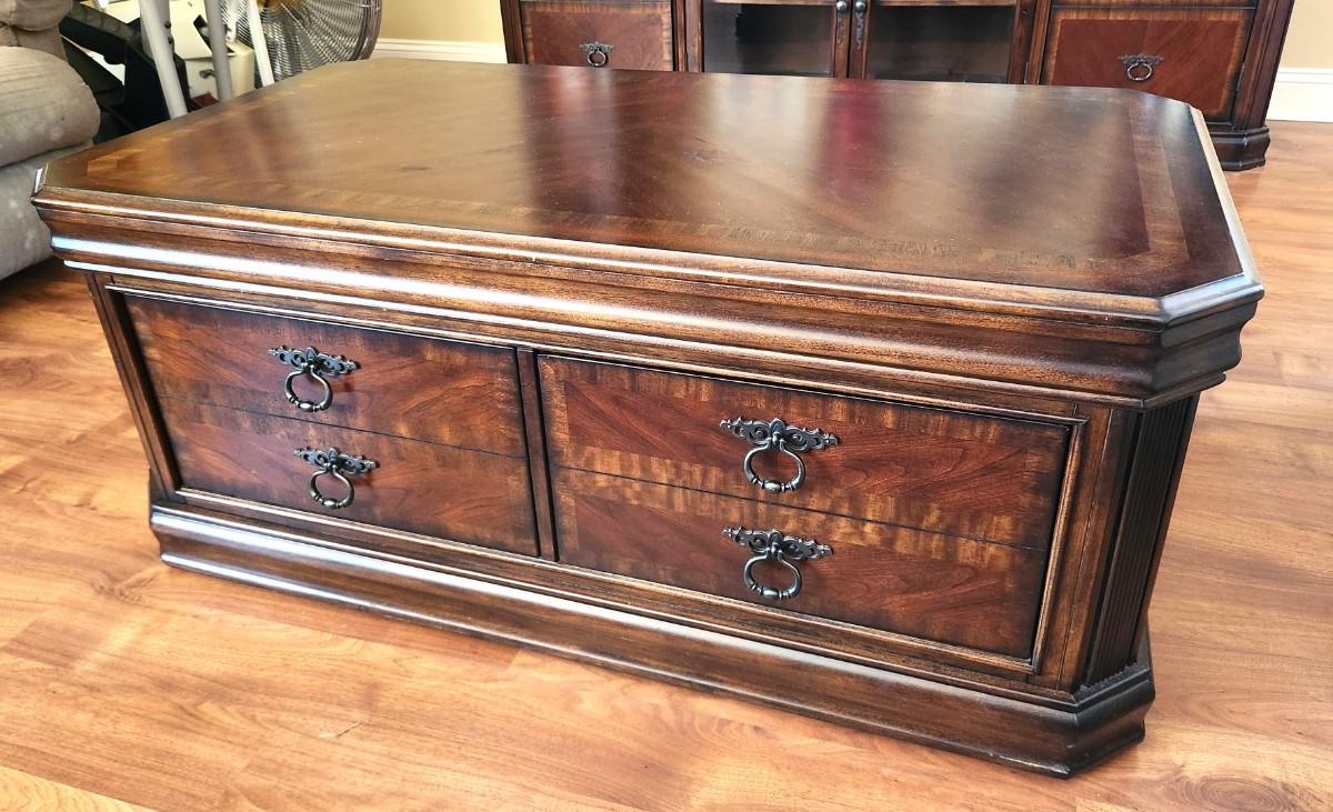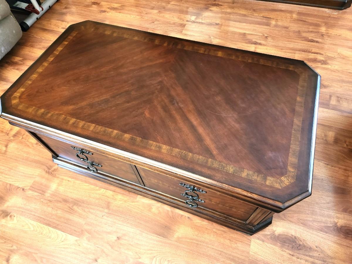 Nice Ashley Furniture Company 2 drawer coffee table - good condition. 4 feet across, 26" deep, 20" tall. This piece is upstairs.