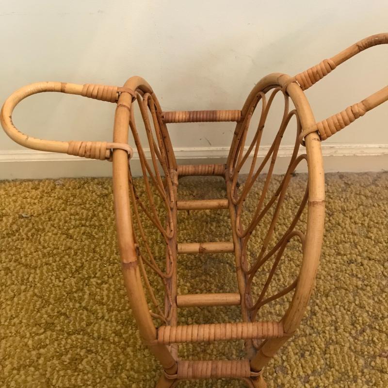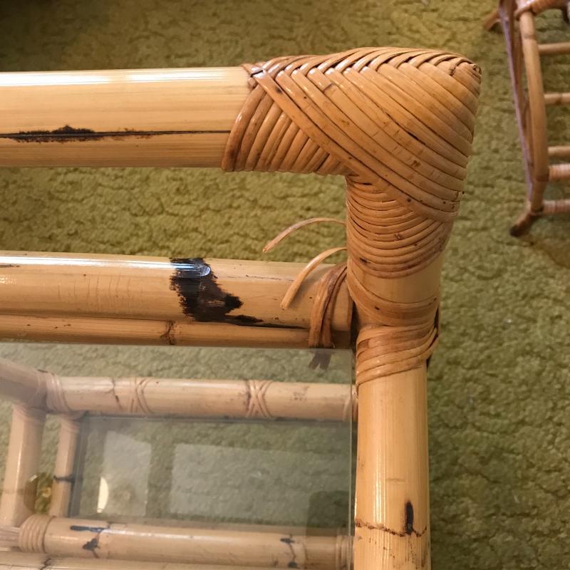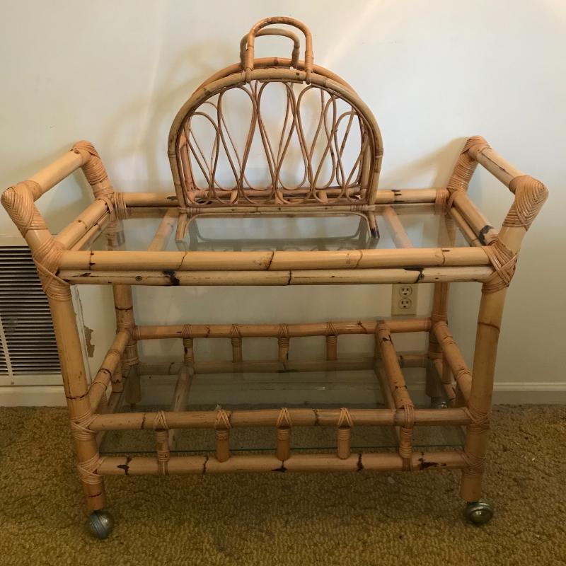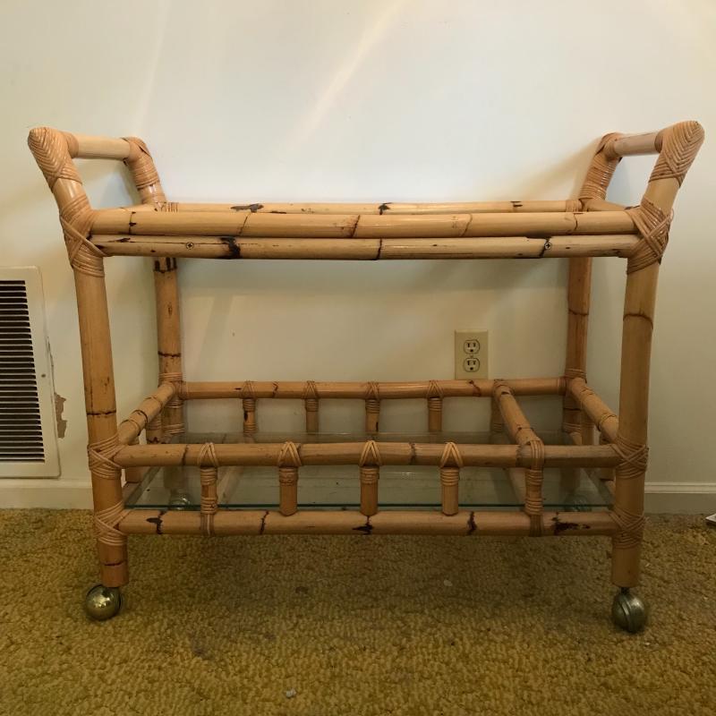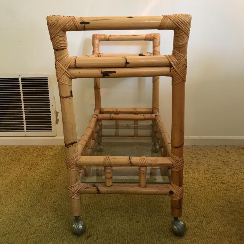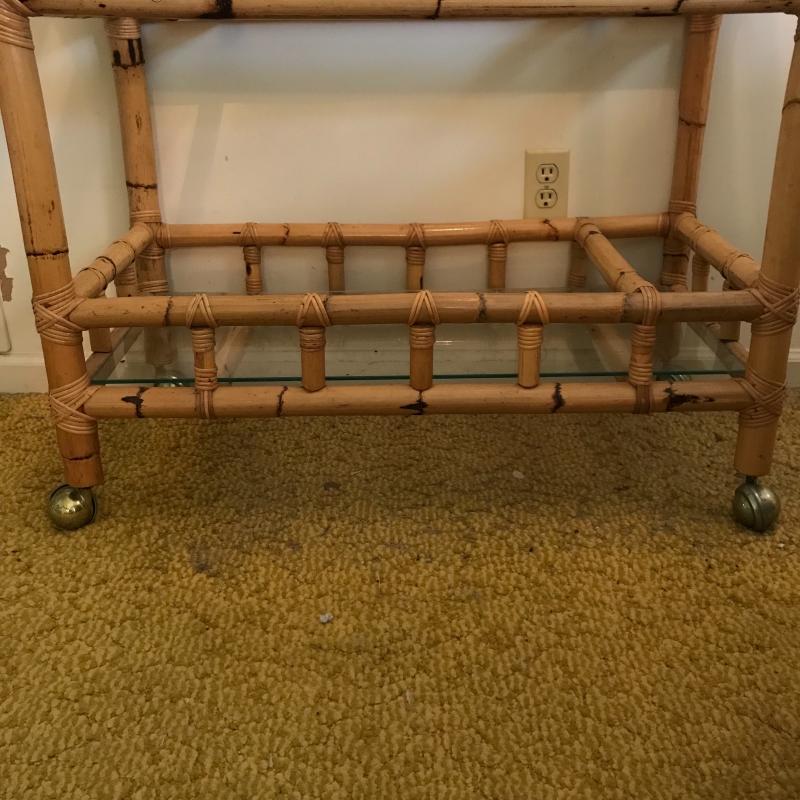 Well built rolling cart with removable glass shelves, appears to be bamboo. Slight unraveling on one corner, see photos. Wheels glide smoothly and there is a crossbeam on the lower shelf to secure smaller items. Cart measures approx. 38.5” x 17.5” x 31”. Lot also includes a bamboo magazine rack with mobile handles. Great condition. Local pick up only.