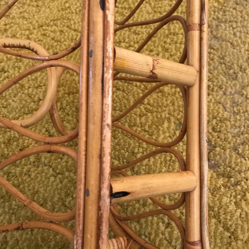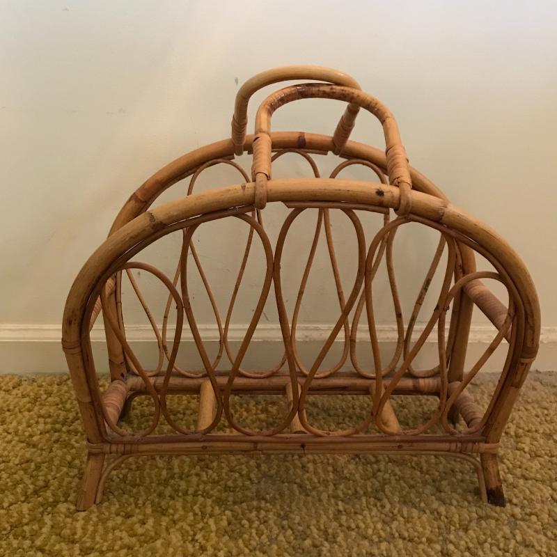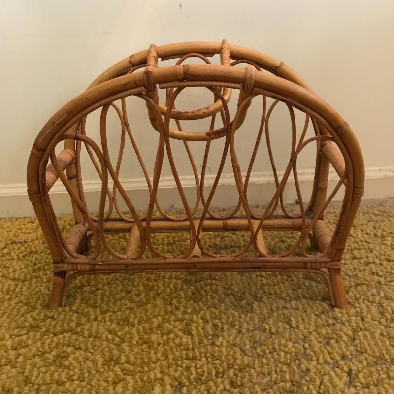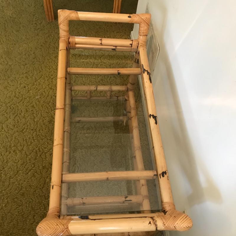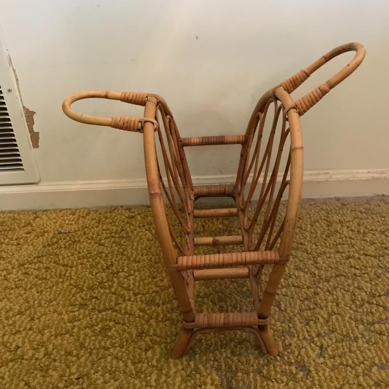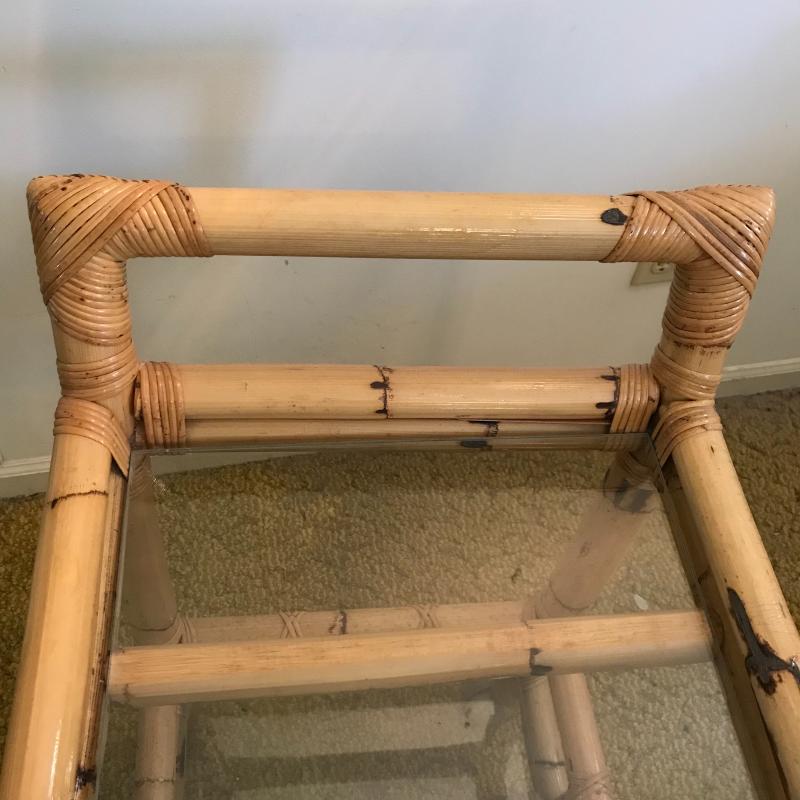Well built rolling cart with removable glass shelves, appears to be bamboo. Slight unraveling on one corner, see photos. Wheels glide smoothly and there is a crossbeam on the lower shelf to secure smaller items. Cart measures approx. 38.5” x 17.5” x 31”. Lot also includes a bamboo magazine rack with mobile handles. Great condition. Local pick up only.