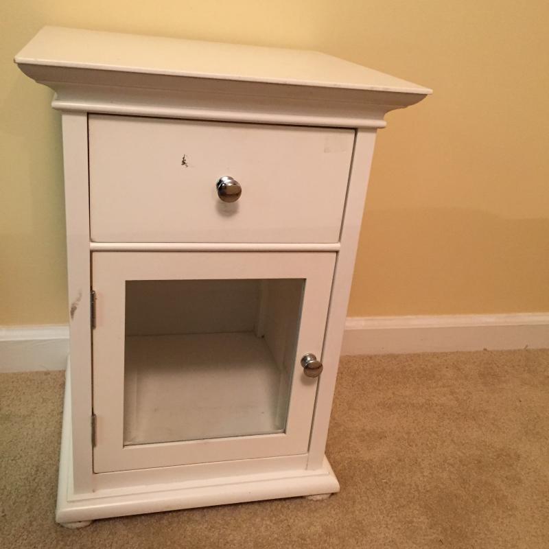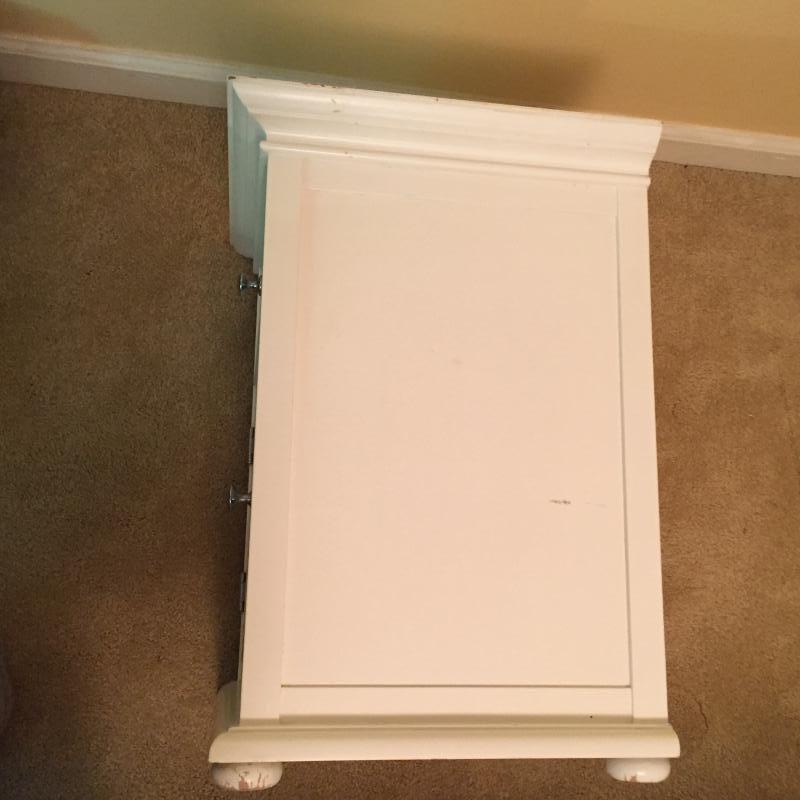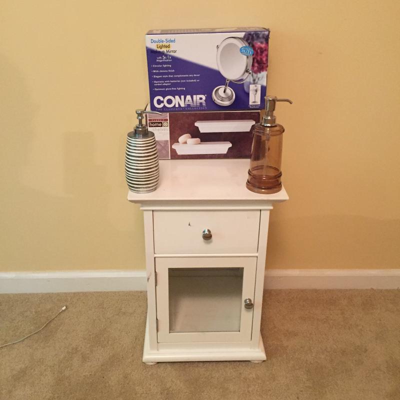 Small White Cabinet,Mirror, Shelves and Soap Dispensers. Upgrade your bathroom! The Cabinet Top Has slight discoloration. Measures 14.75”x20.5”x14.25”. Local Pickup Only