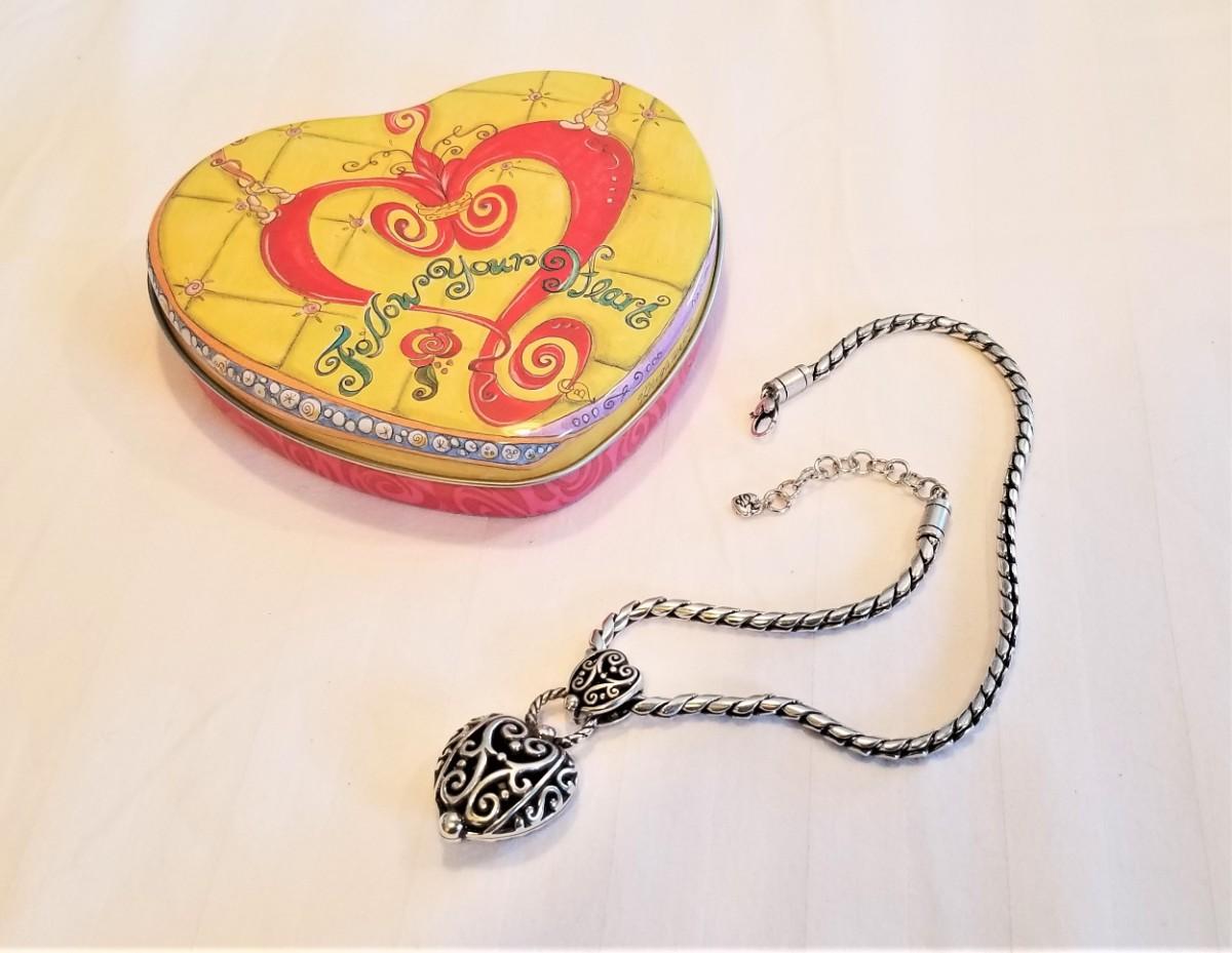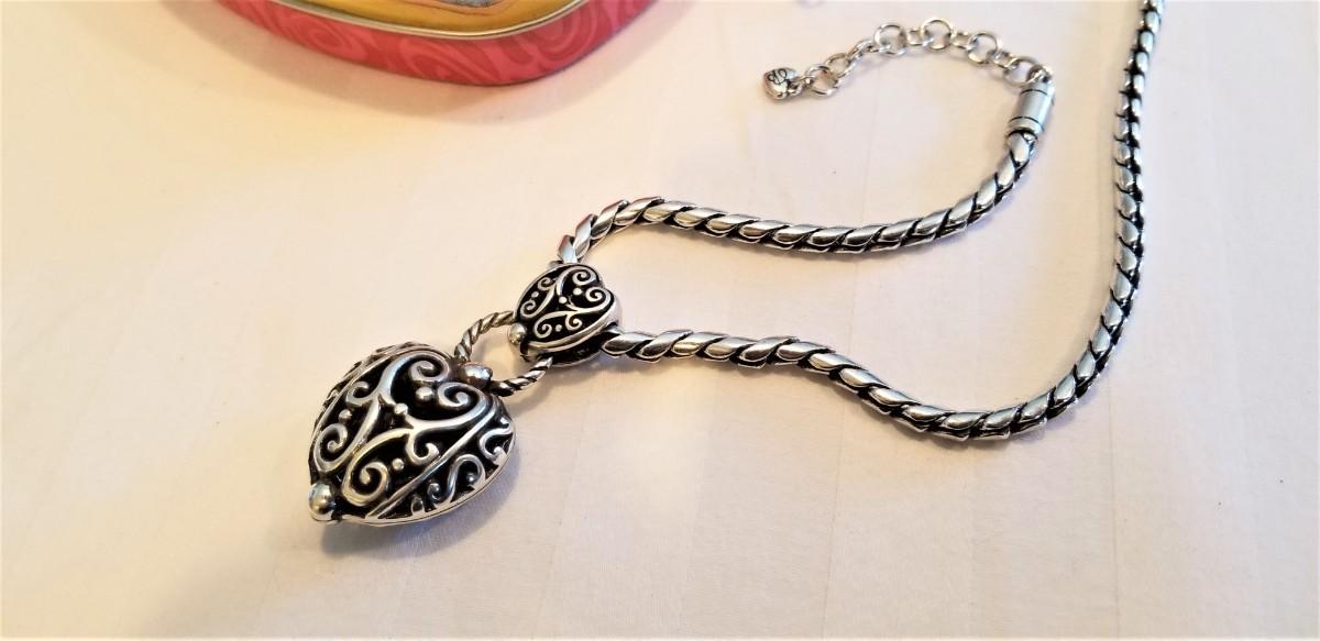 Classic BRIGHTON heart necklace (fully marked) with original box. 11" chain adjustable to 13". Heavy silvertone metal - Good condition. This necklace retailed for over 50.00.