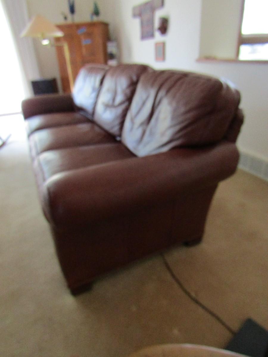 THERE IS A SCRATCH MARK AND BLACK STAIN ON THE BACK SIDE (SEE PICS) OTHERWISE SOFA IS IN GOOD SHAPE