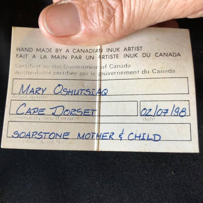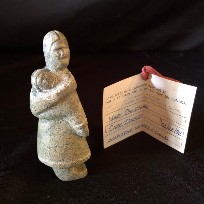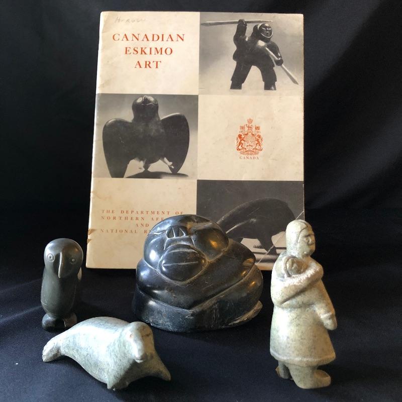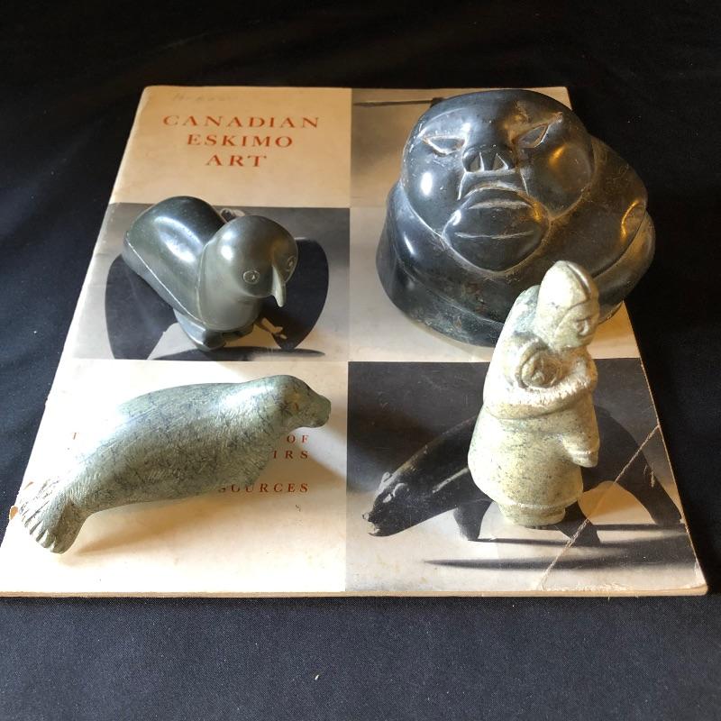 This adorable assortment of soapstones are precious. See images for any markings and measurements; the mother and child comes with a COA and all but the seal have makers marks. We have included a publication all about Canadian Eskimo art.