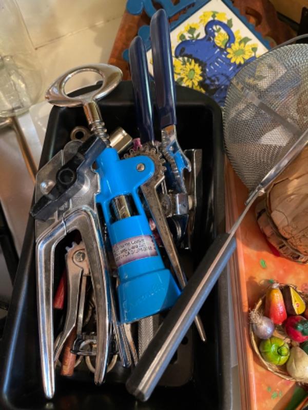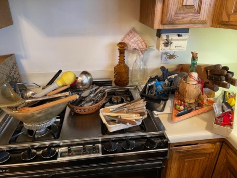 Lot 47. Cookware“”collection of knives, steak knives, flatware, mid-century chips and dip bowls, bakeware, pizza serving plates, trivets, etc.--$34