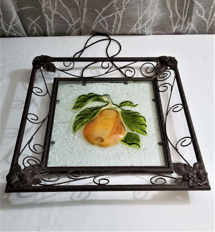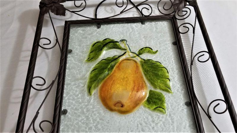 Something a little different here - colored glass PEAR suncatcher in decorative metal frame. Good condition. Measures 17.5" tall x 15" across.