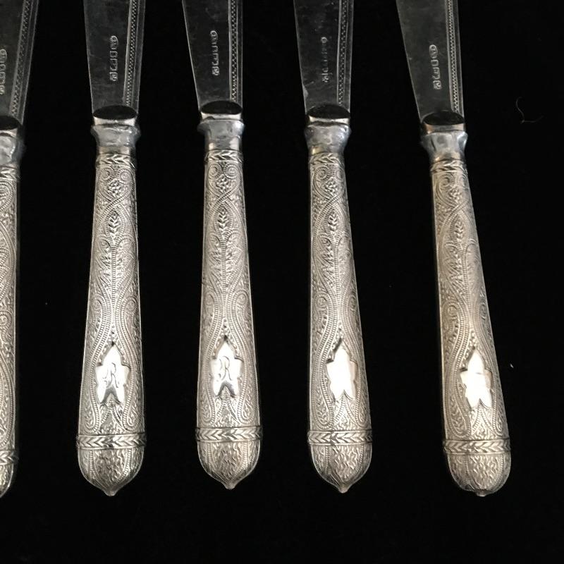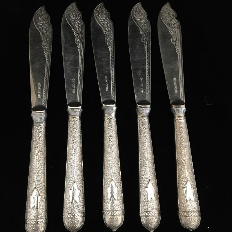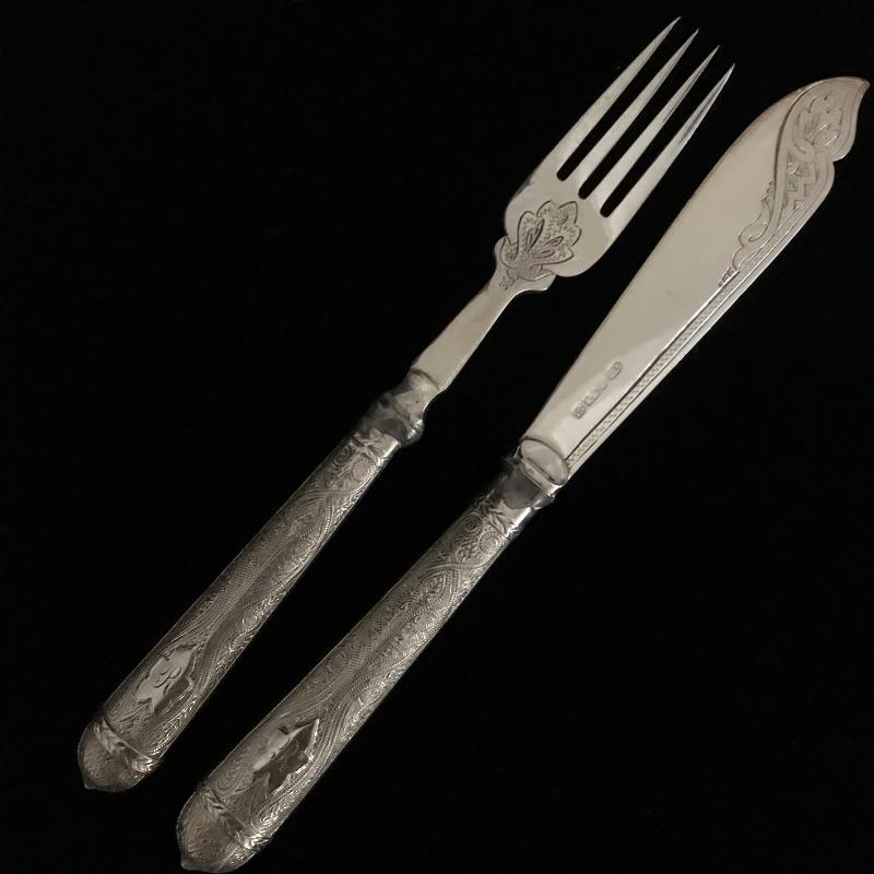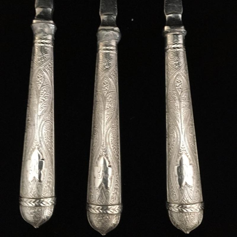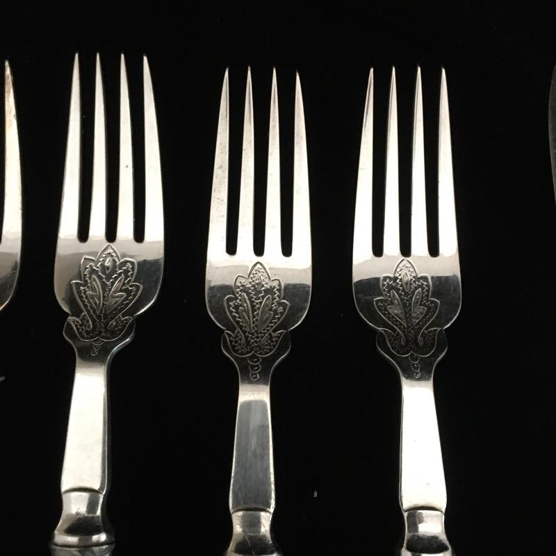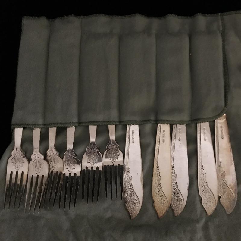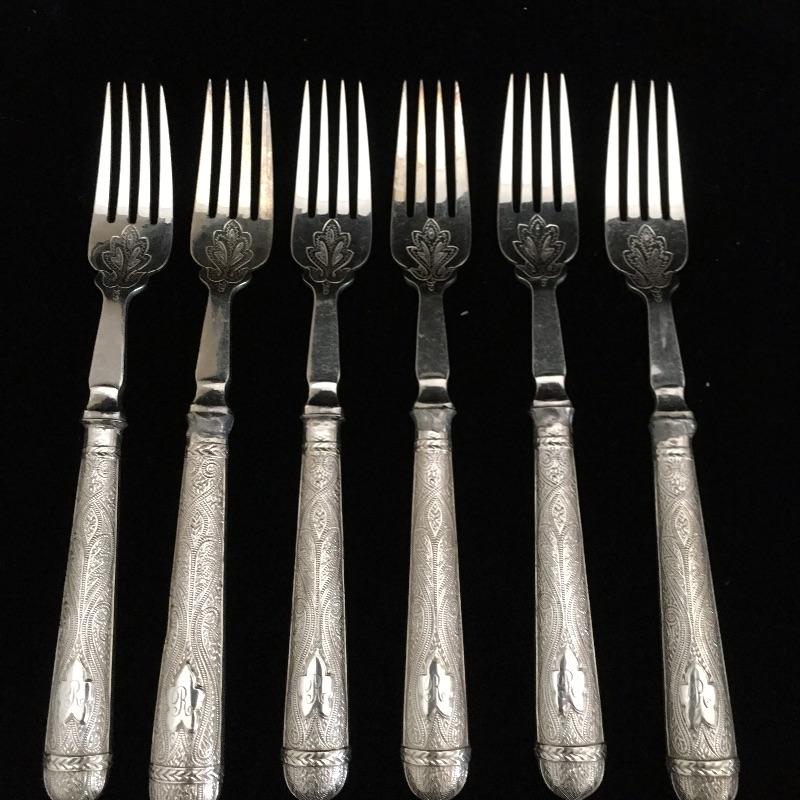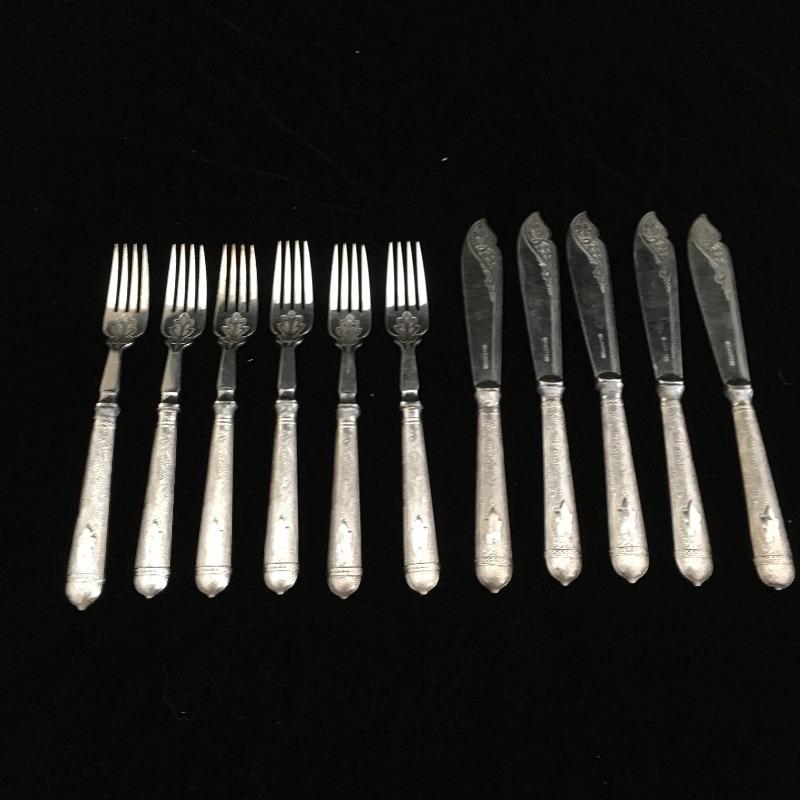 Collection to add elegance to any meal! Engraved silver flatware includes large knife, serving tongs, five fish knives and six forks all engraved. Largest knife measures 11” long.